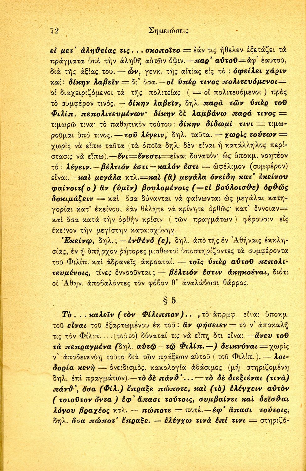 Σχολικό εγχειρίδιο Αρχαίων Ελληνικών Ε΄ Γυμνασίου που περιέχει τους Ολυνθιακούς Α΄ και Β΄ και τους Φιλιππικούς Α΄ και Β΄ του Δημοσθένη, βιογραφικό σημείωμα, λεξιλόγιο και ερμηνευτικά και ετυμολογικά σχόλια.