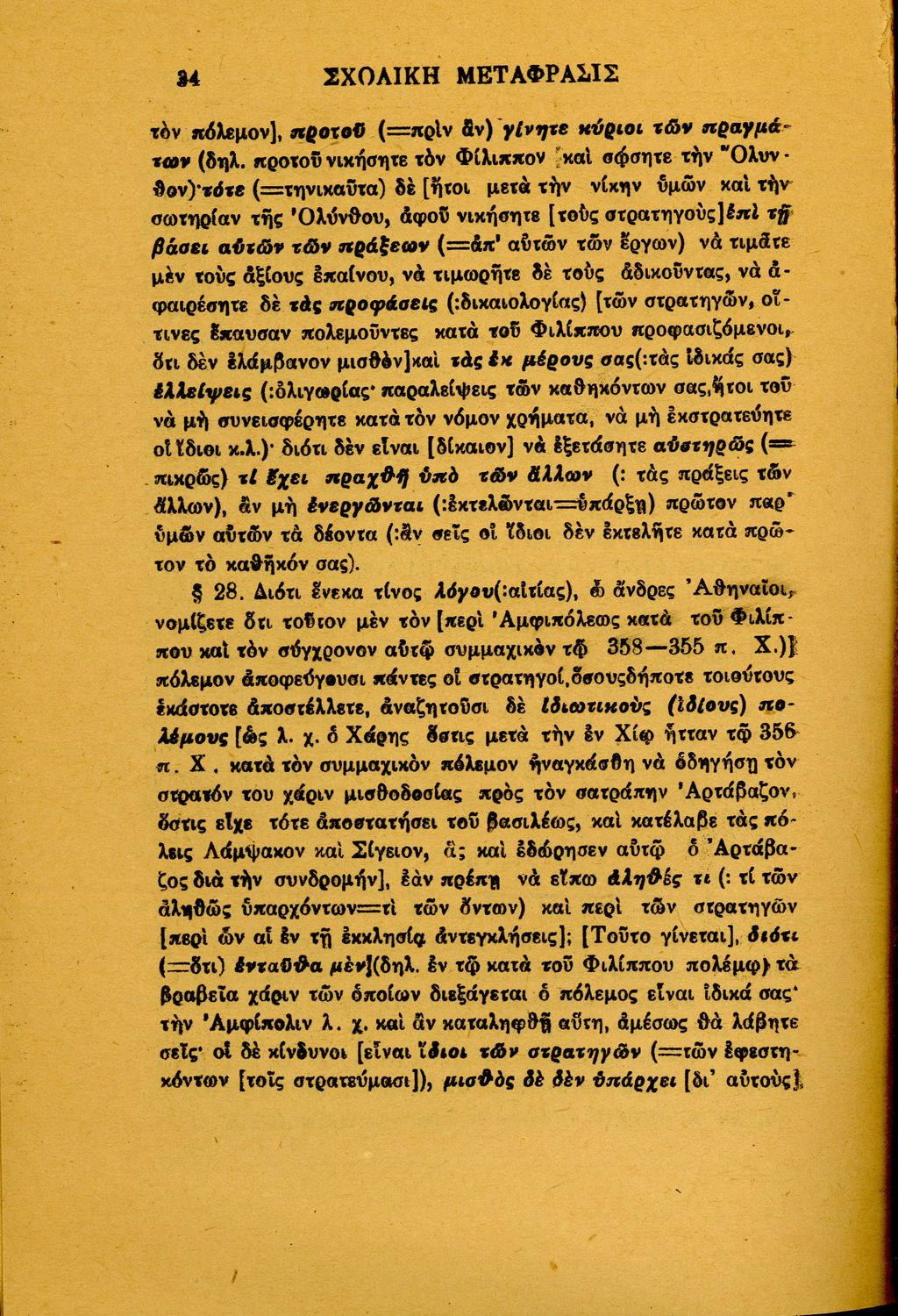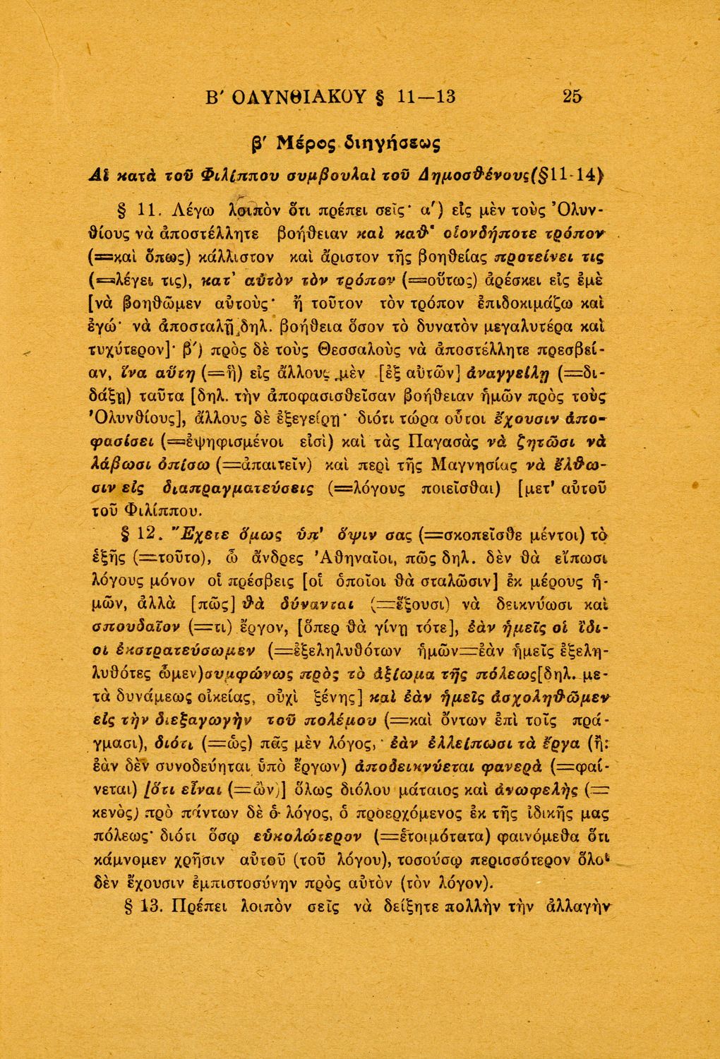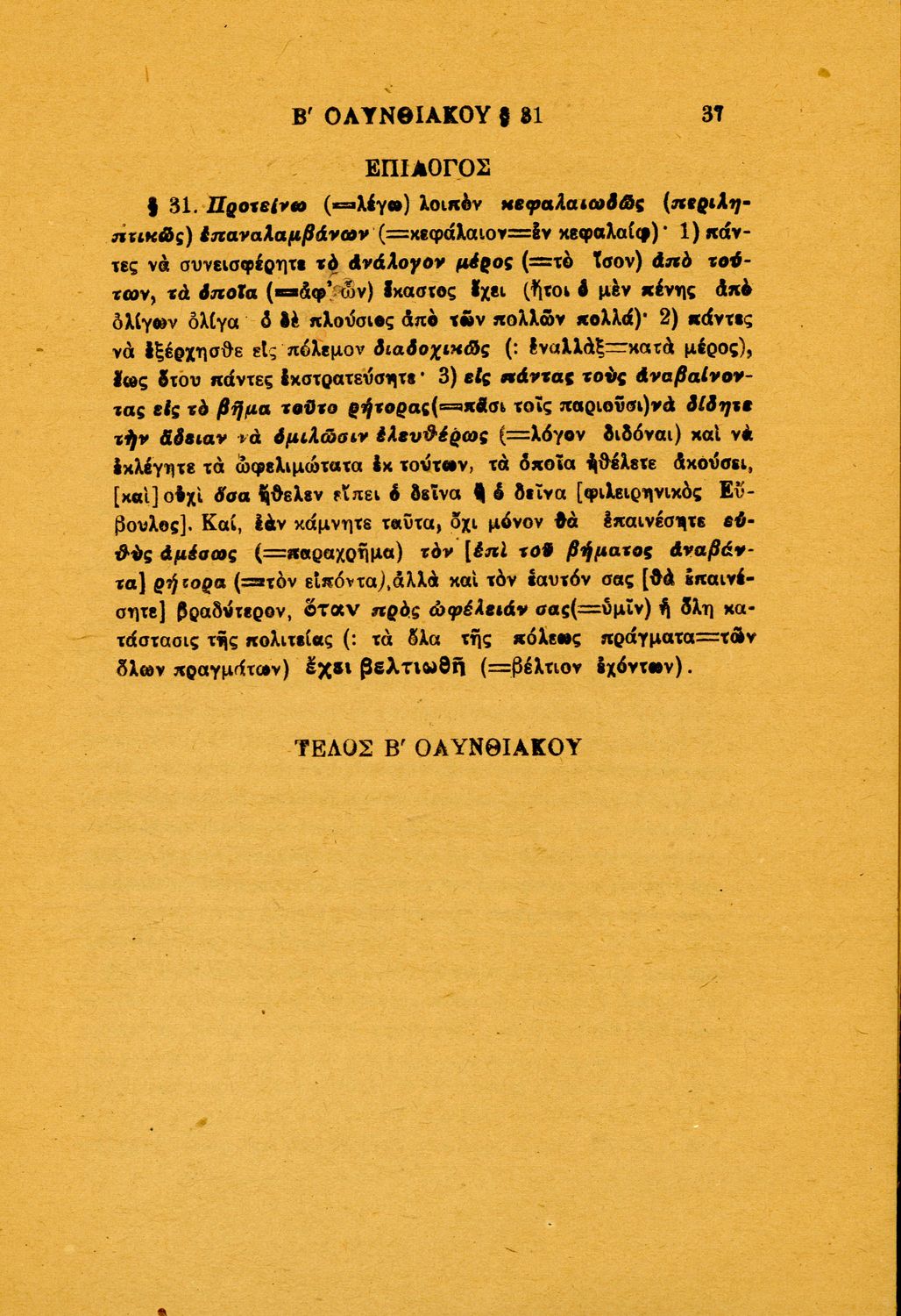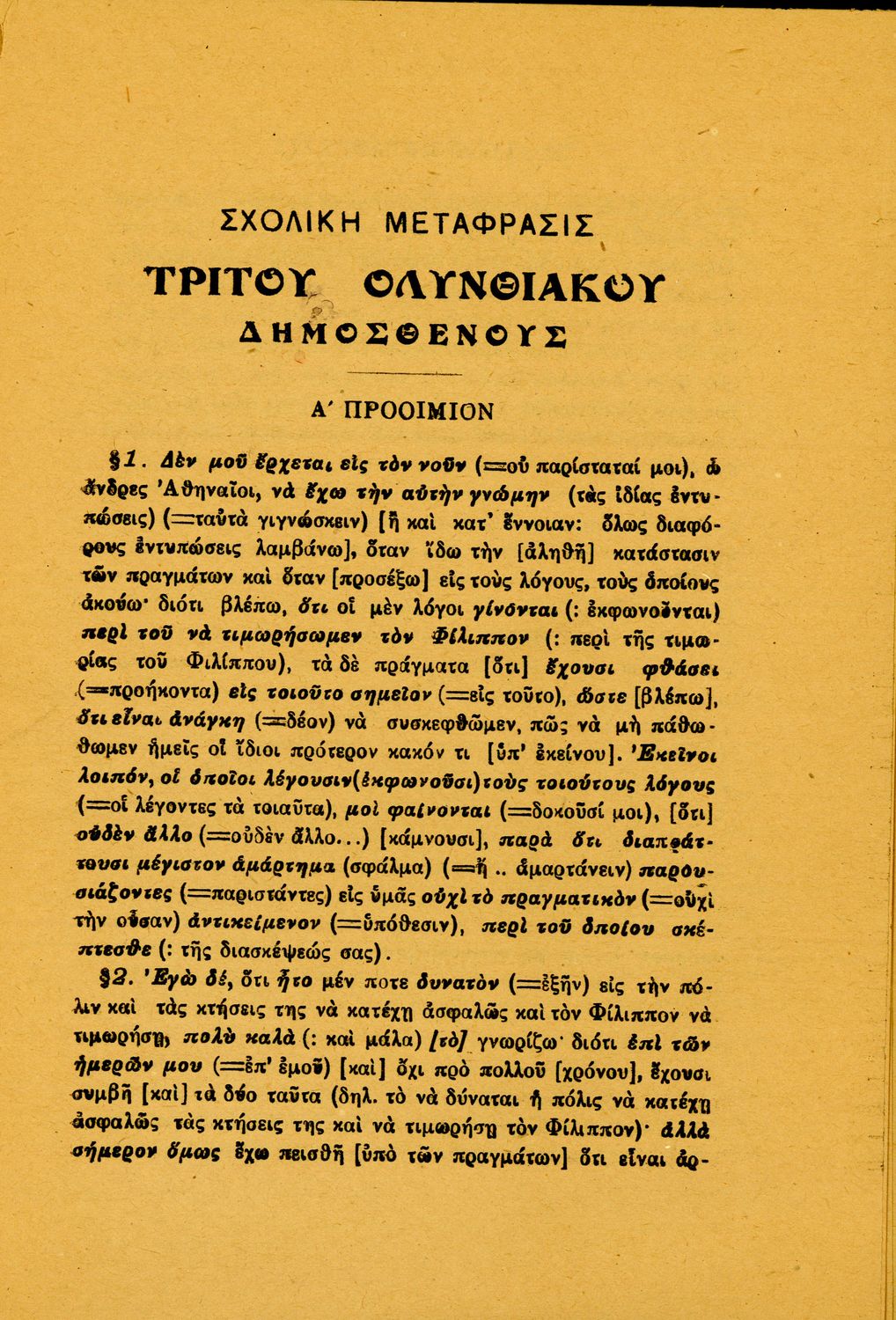 Μαθητικό βοήθημα Αρχαίων Ελληνικών Β΄ Τετραταξίου Γυμνασίου που περιλαμβάνει μετάφραση των Ολυνθιακών Α΄, Β΄ και Γ΄ του Δημοσθένη.