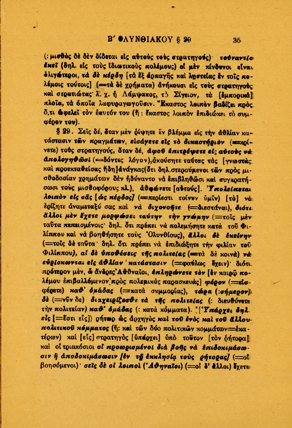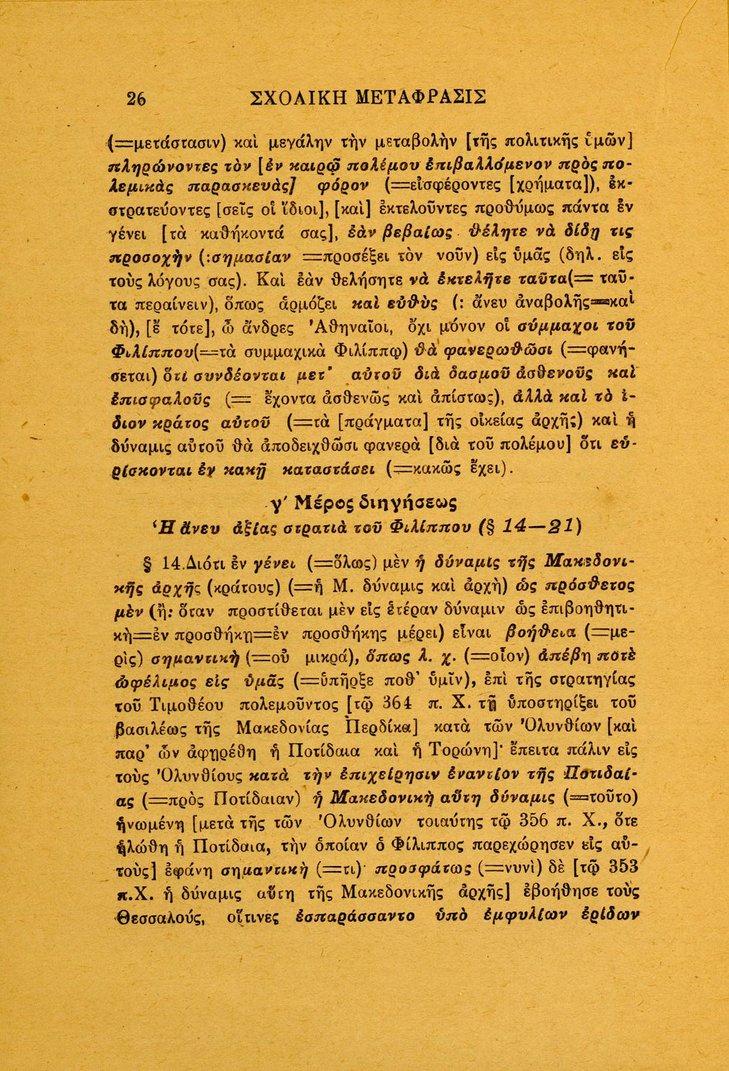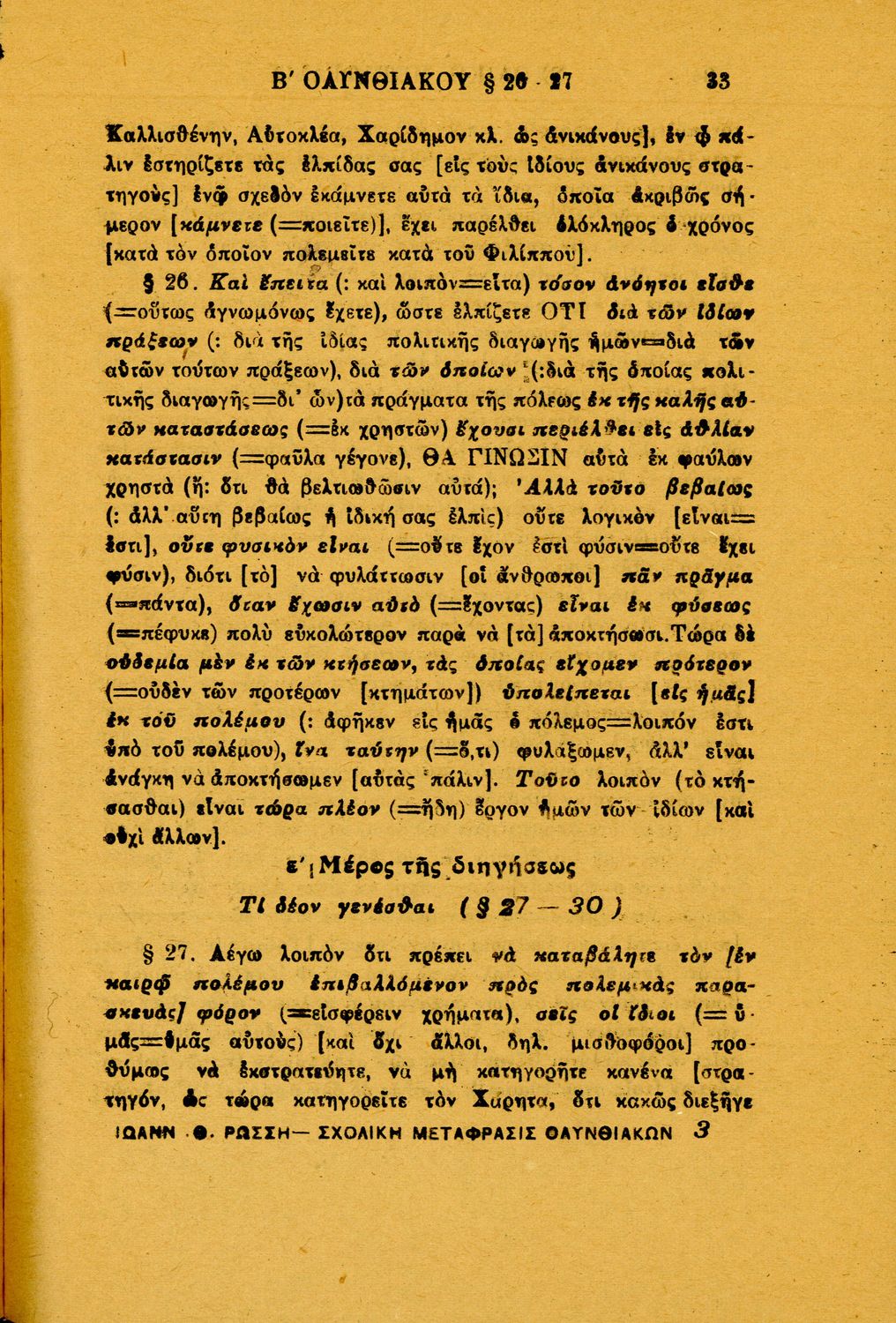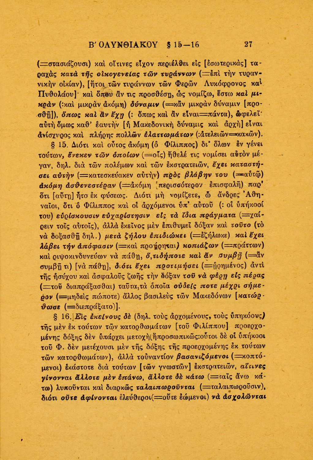 Μαθητικό βοήθημα Αρχαίων Ελληνικών Β΄ Τετραταξίου Γυμνασίου που περιλαμβάνει μετάφραση των Ολυνθιακών Α΄, Β΄ και Γ΄ του Δημοσθένη.