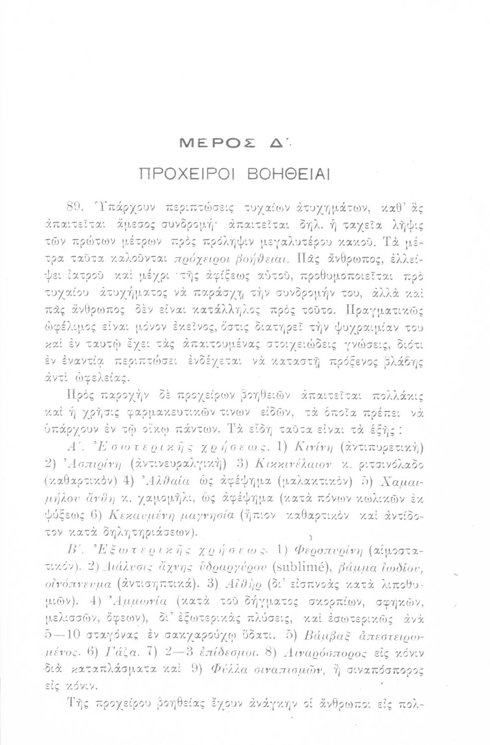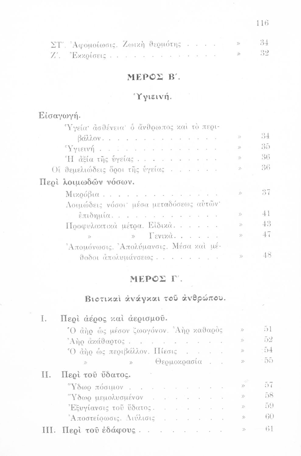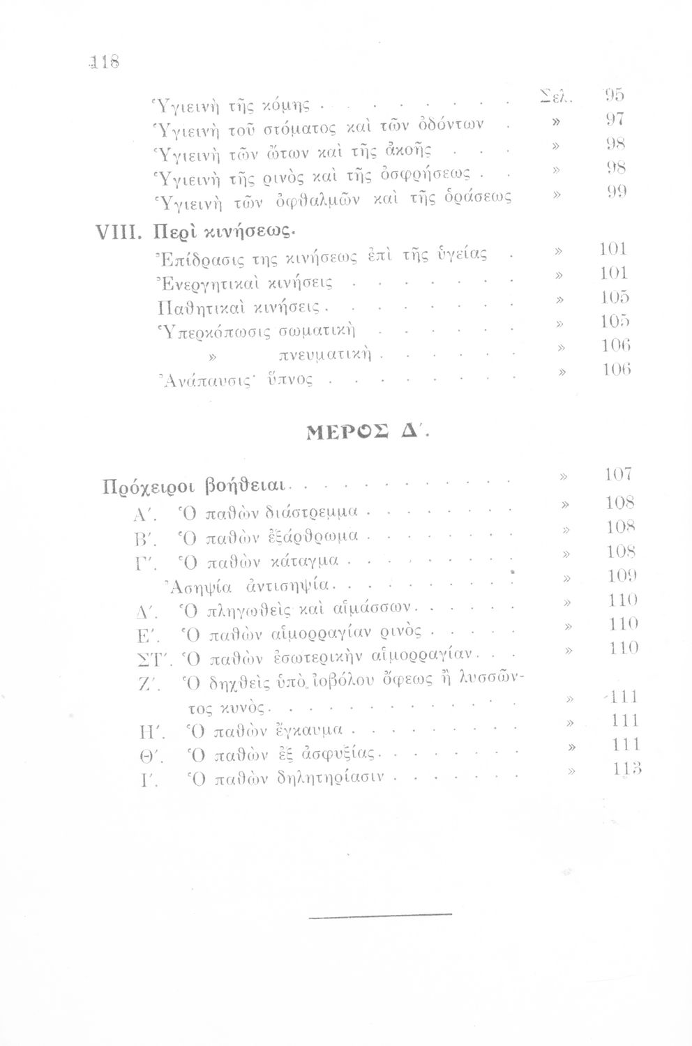 Βαθμίδα εκπαίδευσης: Δευτεροβάθμια Τάξη: Δ' Γυμνασίου Μάθημα: Υγιεινή Γλώσσα: Καθαρεύουσα Παρουσίαση περιεχομένου: Σχολικό εγχειρίδιο Υγιεινής Δ΄ Γυμνασίου που περιλαμβάνει ζητήματα όπως η διατροφή, τα λοιμώδη νοσήματα, οι βιολογικές ανάγκες του ανθρώπινου οργανισμού και η παροχή των πρώτων βοηθειών. |