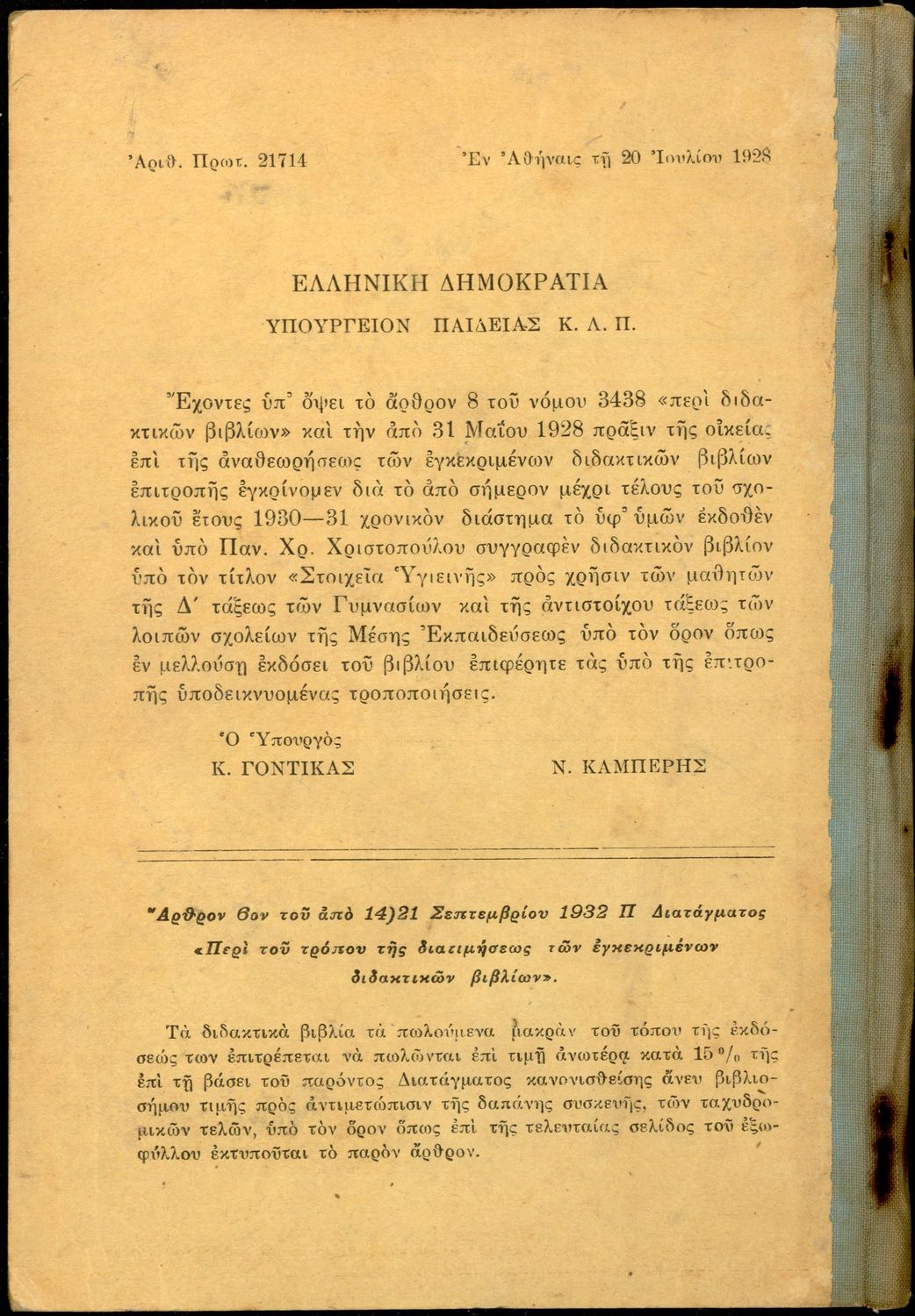 Τίτλος: Στοιχεία υγιεινής εγκεκριμένα προς χρήσιν των μαθητών της Δ΄ τάξεως των Γυμνασίων και των αντιστοίχων τάξεων των λοιπών σχολείων της Μέσης Εκπαίδευσης