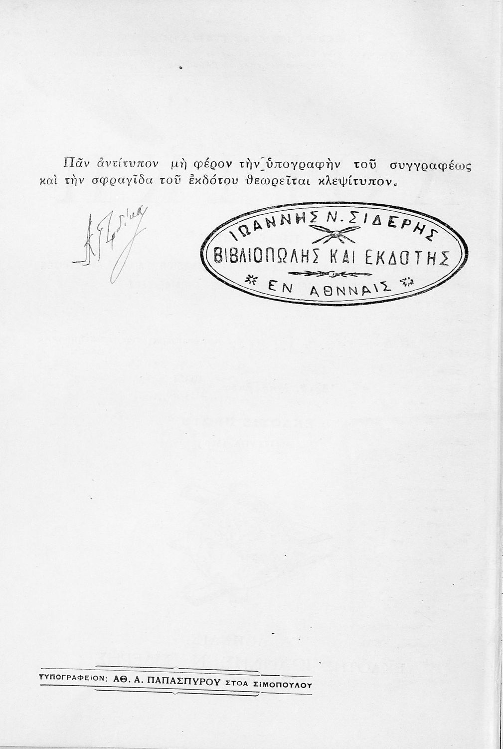Εκδότης: Ιωάννης Ν. Σιδέρης Έτος έκδοσης: 1933 Τόπος έκδοσης: Αθήνα Έκδοση: 1η Υπουργική απόφαση / Σύμβαση: 40357/ 27-7-1933 Έτος έγκρισης: 1933 |