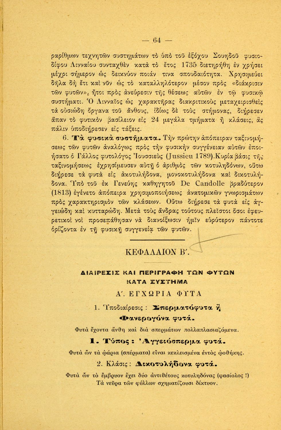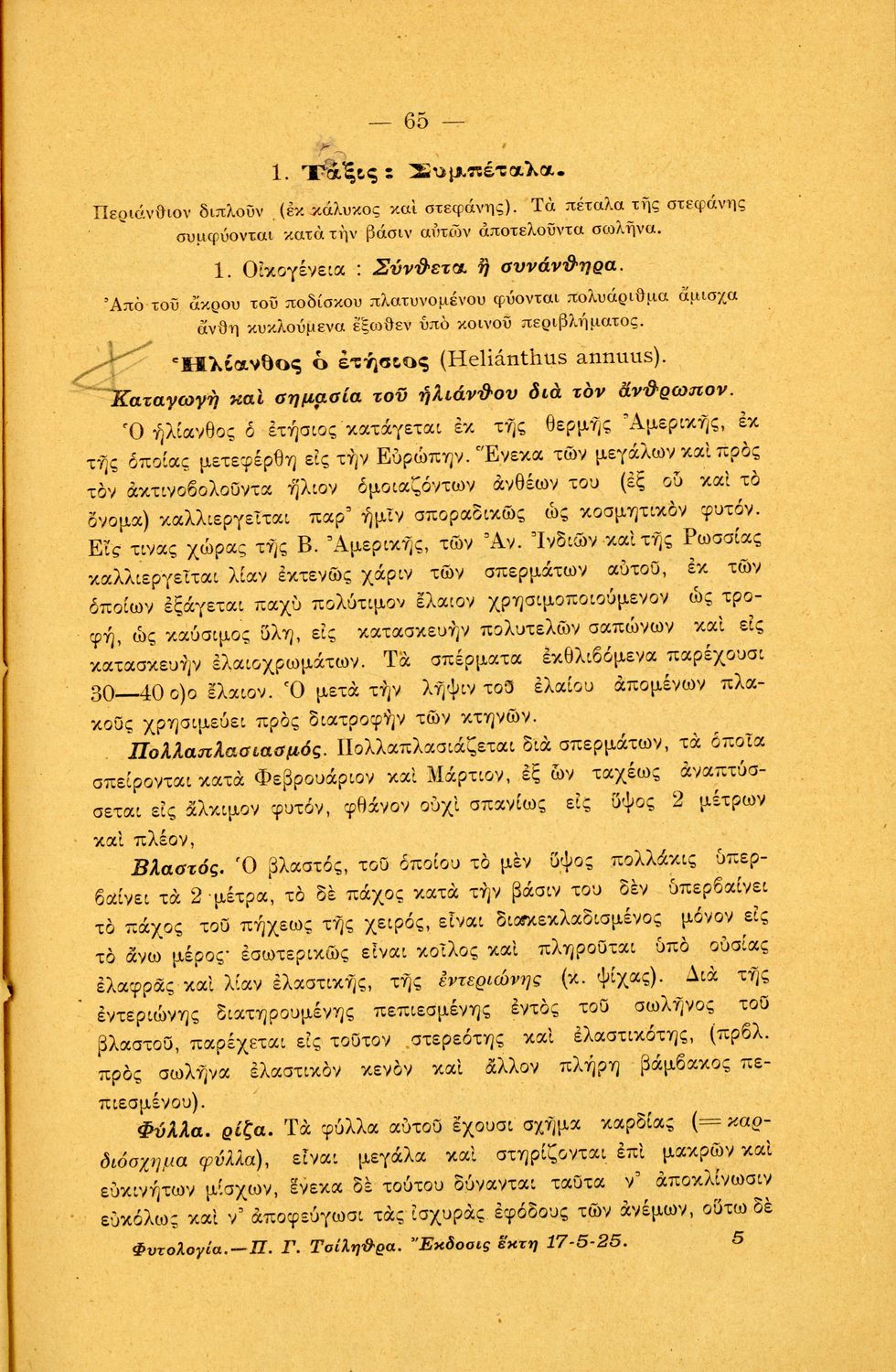 Σχολικό εγχειρίδιο Φυτολογίας για τα Γυμνάσια, τα Διδασκαλεία και τα Παρθεναγωγεία που παρουσιάζει τα διάφορα φυτά ανάλογα με την συνομοταξία στην οποία ανήκουν.