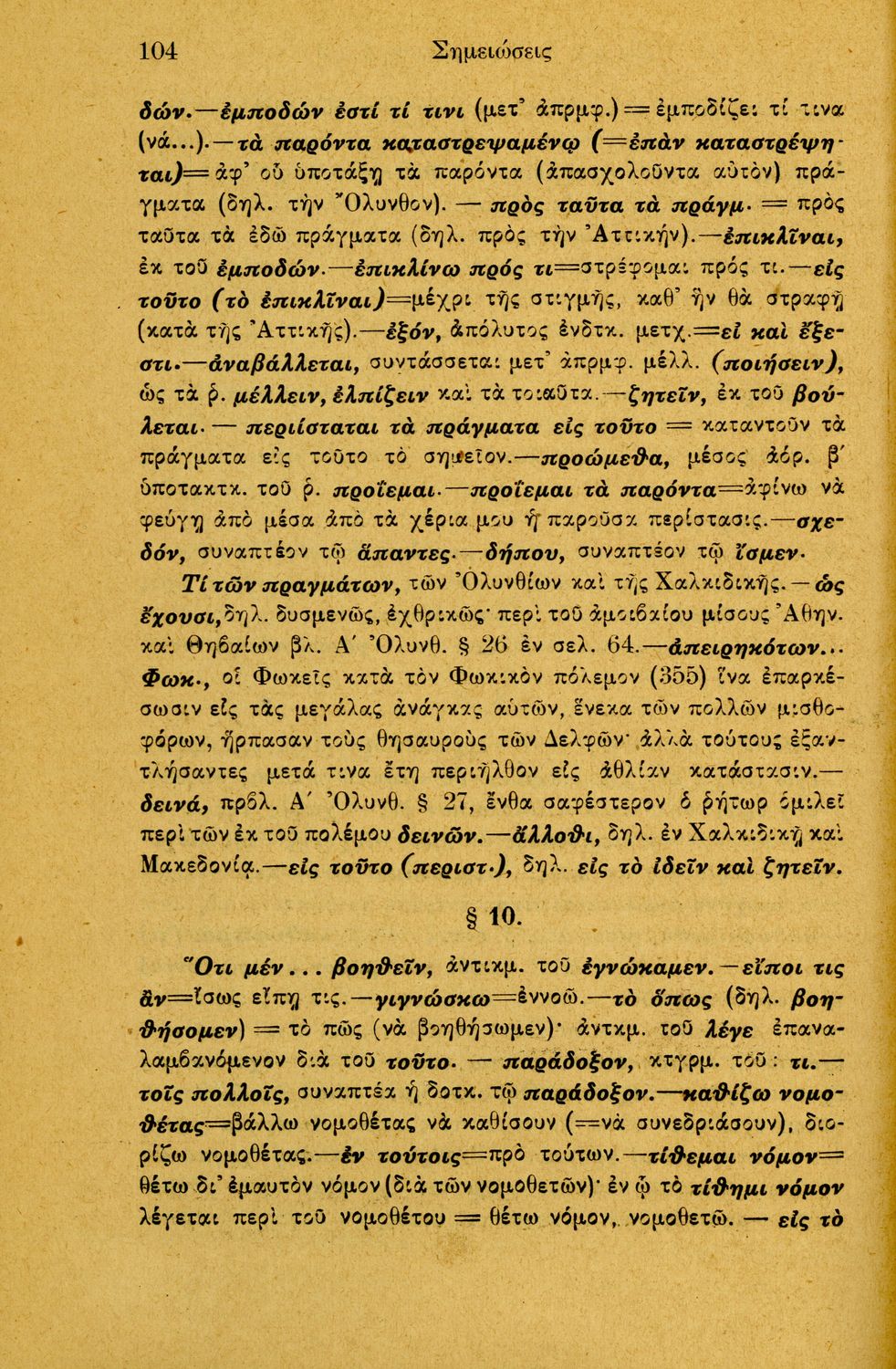 Σχολικό εγχειρίδιο Αρχαίων Ελληνικών Δ΄ Γυμνασίου που περιέχει τους Ολυνθιακούς Α΄ και Β΄ και τους Φιλιππικούς Α΄ και Β' του Δημοσθένη, ερμηνευτικά και πραγματολογικά σχόλια και γραμματικές παρατηρήσεις.