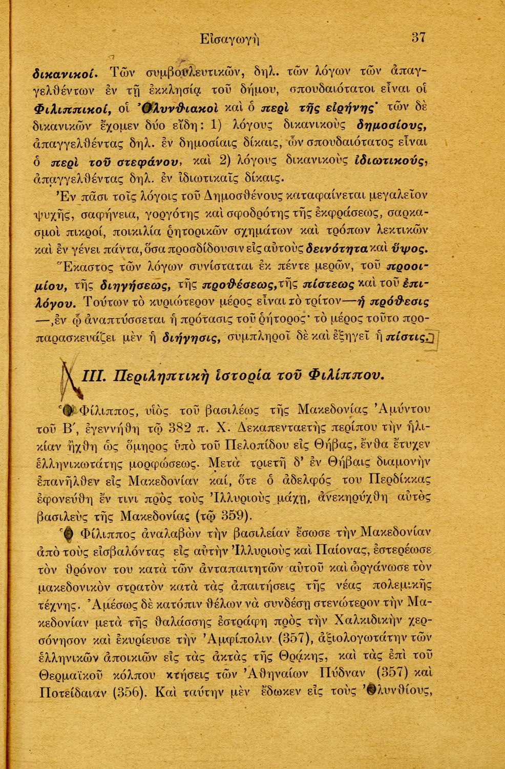 Σχολικό εγχειρίδιο Αρχαίων Ελληνικών Δ΄ και Ε΄ Γυμνασίου που περιέχει τους Ολυνθιακούς Α΄ και Β΄ και τους Φιλιππικούς Α΄ και Β΄ του Δημοσθένη, βιογραφικό σημείωμα, λεξιλόγιο και ερμηνευτικά και ετυμολογικά ...