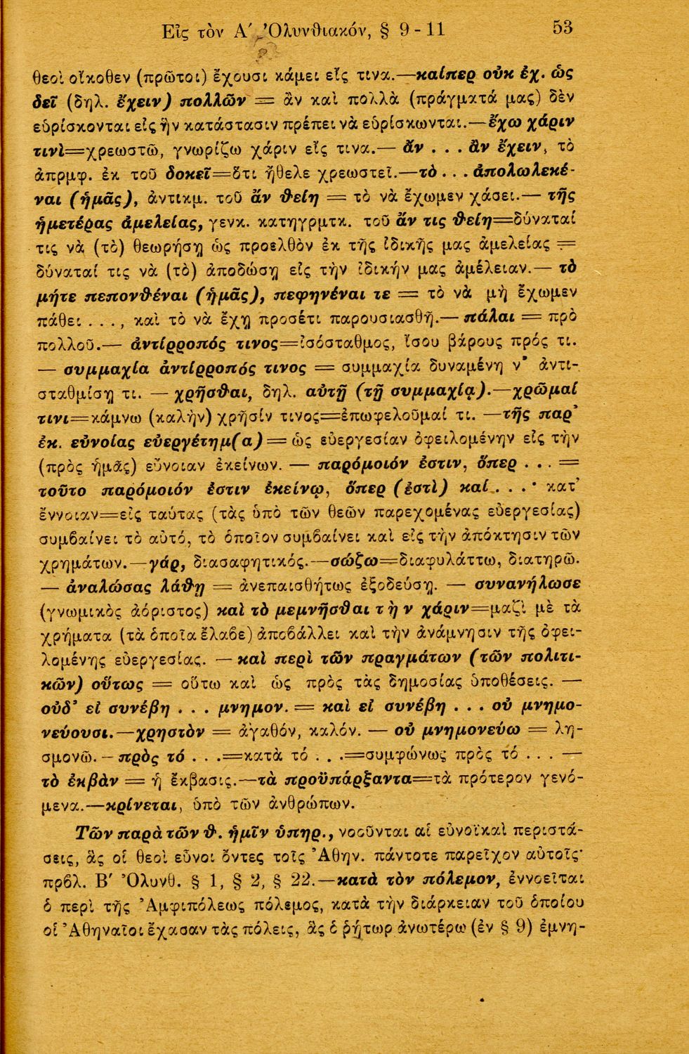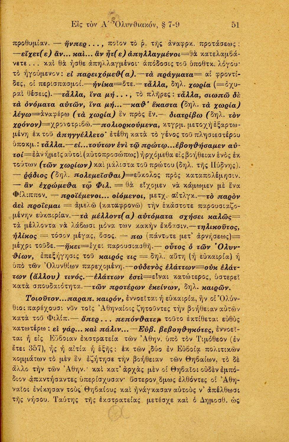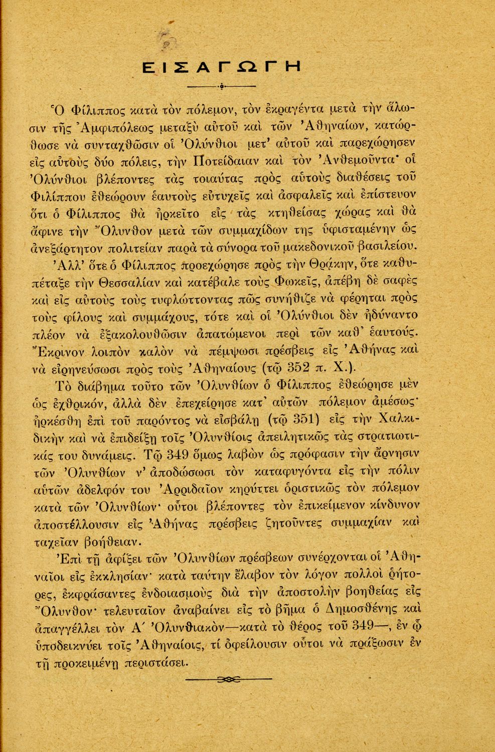 Σχολικό εγχειρίδιο Αρχαίων Ελληνικών Β΄ Γυμνασίου που περιλαμβάνει τους τρεις Ολυνθιακούς Λόγους του Δημοσθένη, εισαγωγικά σχόλια στη ζωή και το έργο του, την υπόθεση των Λόγων, και ερμηνευτικά, πραγματολογικά