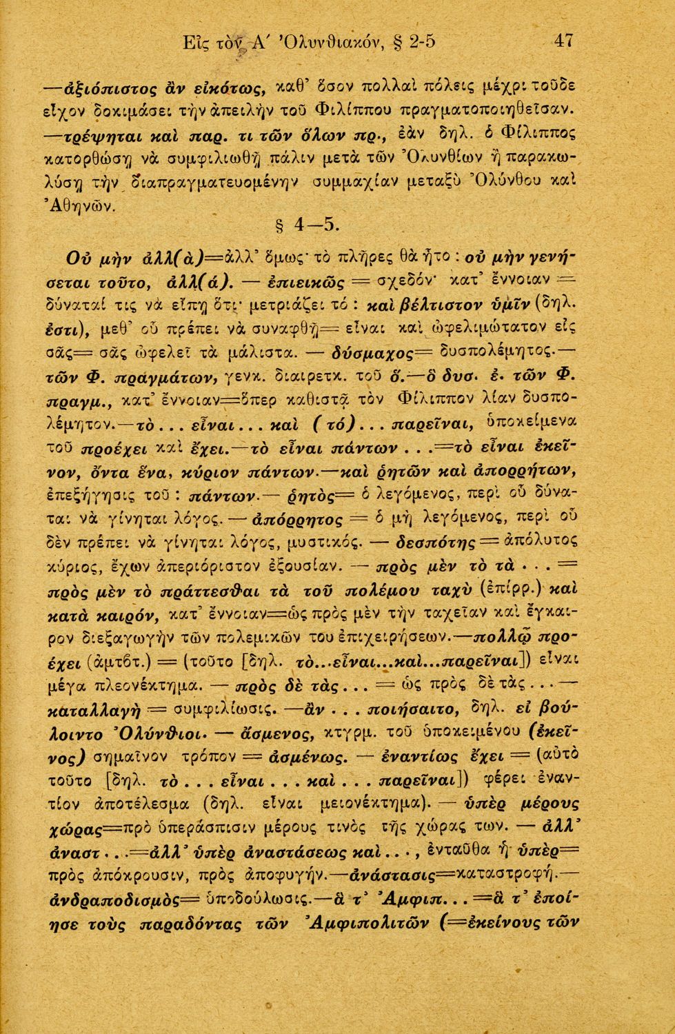 Σχολικό εγχειρίδιο Αρχαίων Ελληνικών Ε΄ Γυμνασίου που περιέχει τους Ολυνθιακούς Α΄ και Β΄ και τους Φιλιππικούς Α΄ και Β΄ του Δημοσθένη, βιογραφικό σημείωμα, λεξιλόγιο και ερμηνευτικά και ετυμολογικά σχόλια.