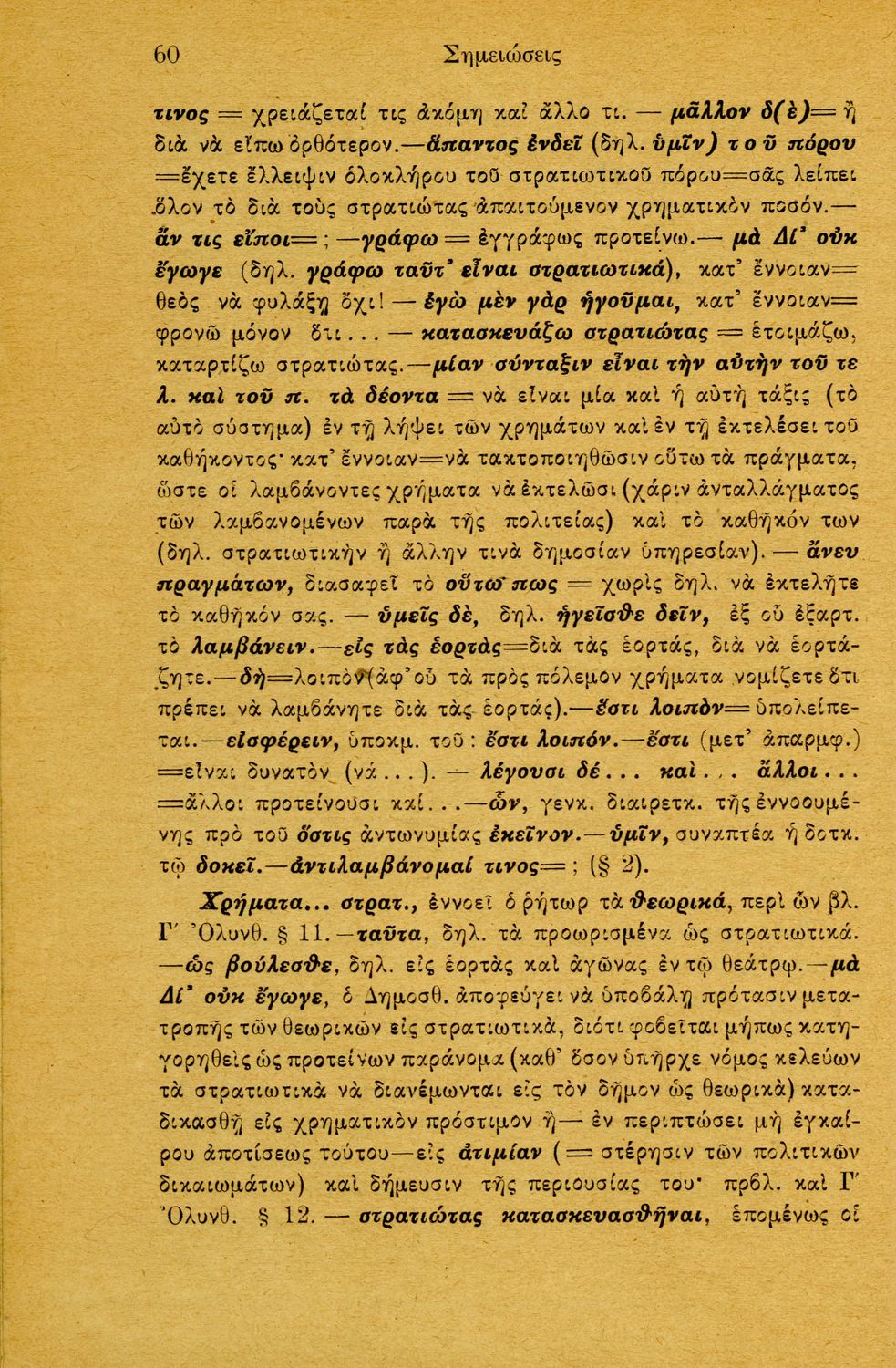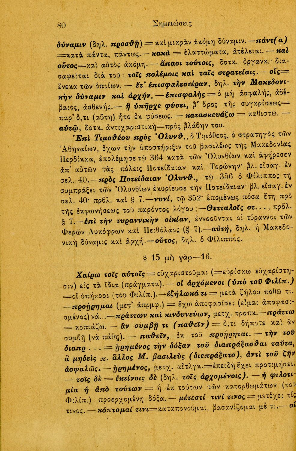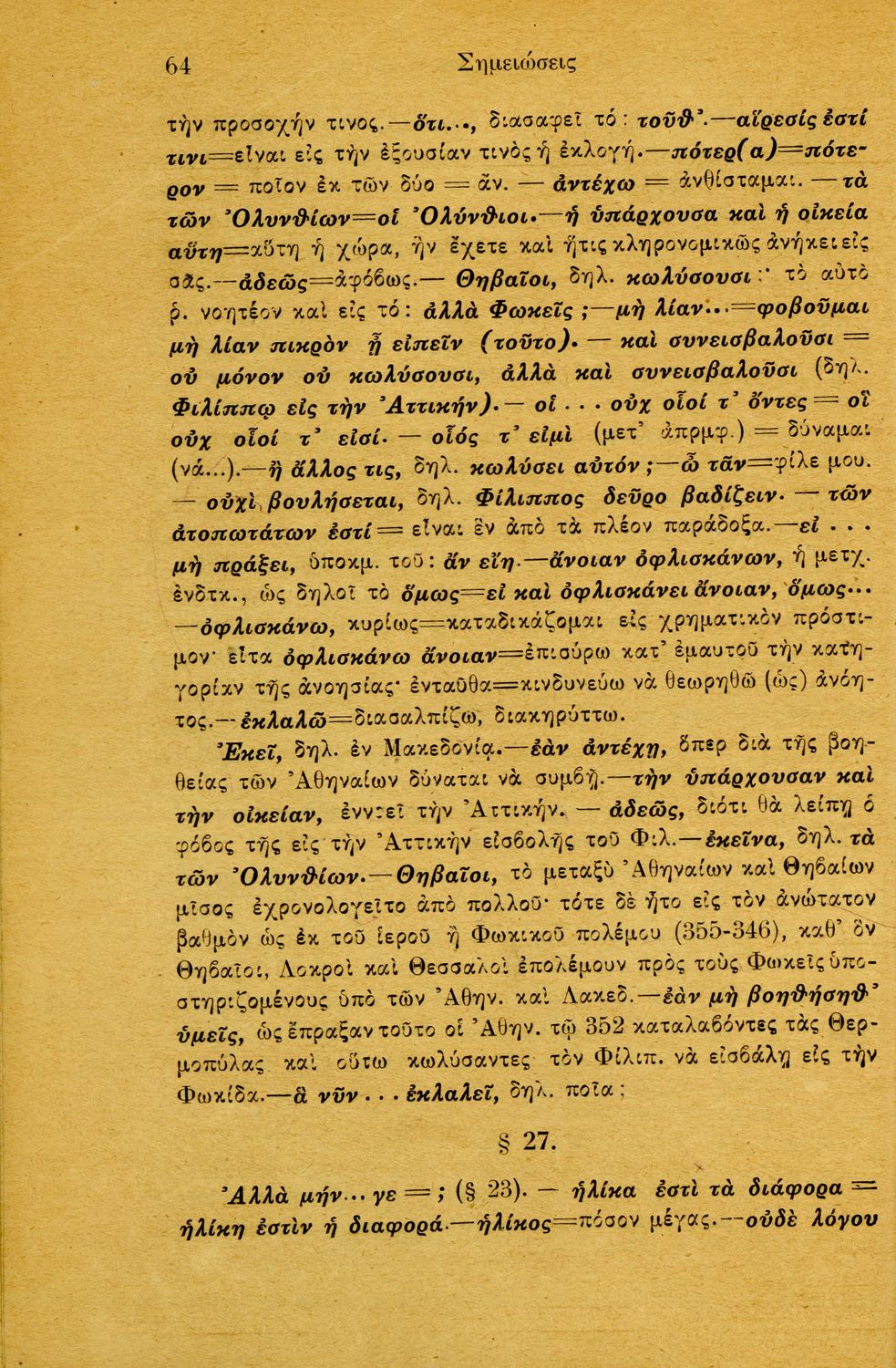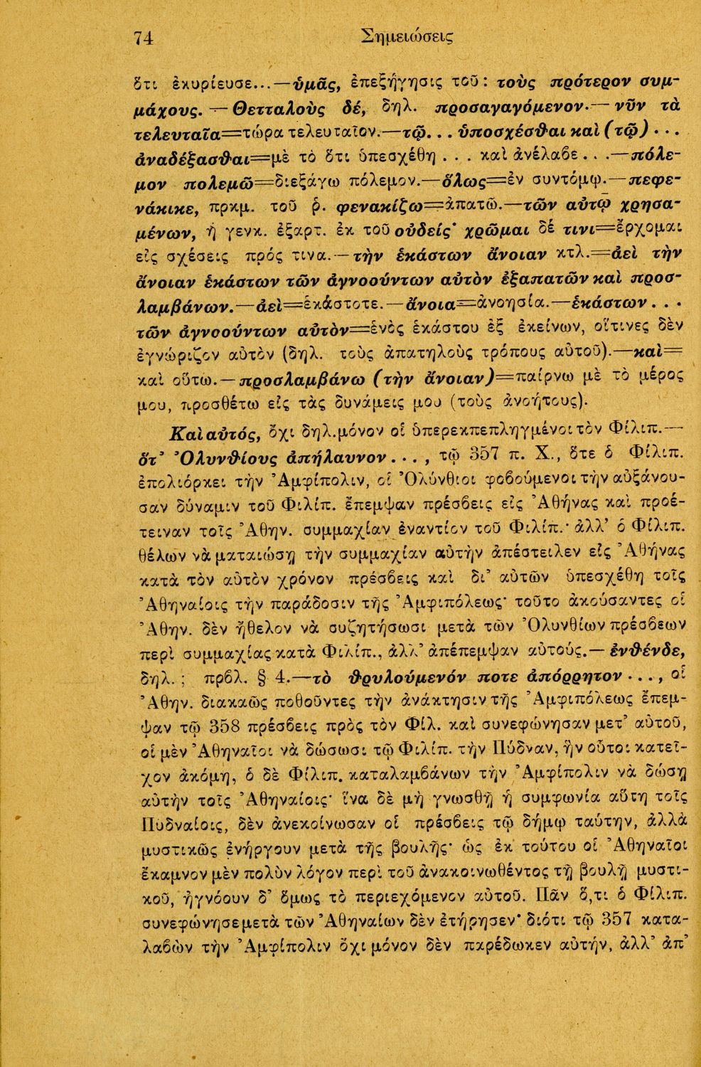 Σχολικό εγχειρίδιο Αρχαίων Ελληνικών Δ΄ Γυμνασίου που περιέχει τους Ολυνθιακούς Α΄ και Β΄ και τους Φιλιππικούς Α΄ και Β' του Δημοσθένη, ερμηνευτικά και πραγματολογικά σχόλια και γραμματικές παρατηρήσεις.