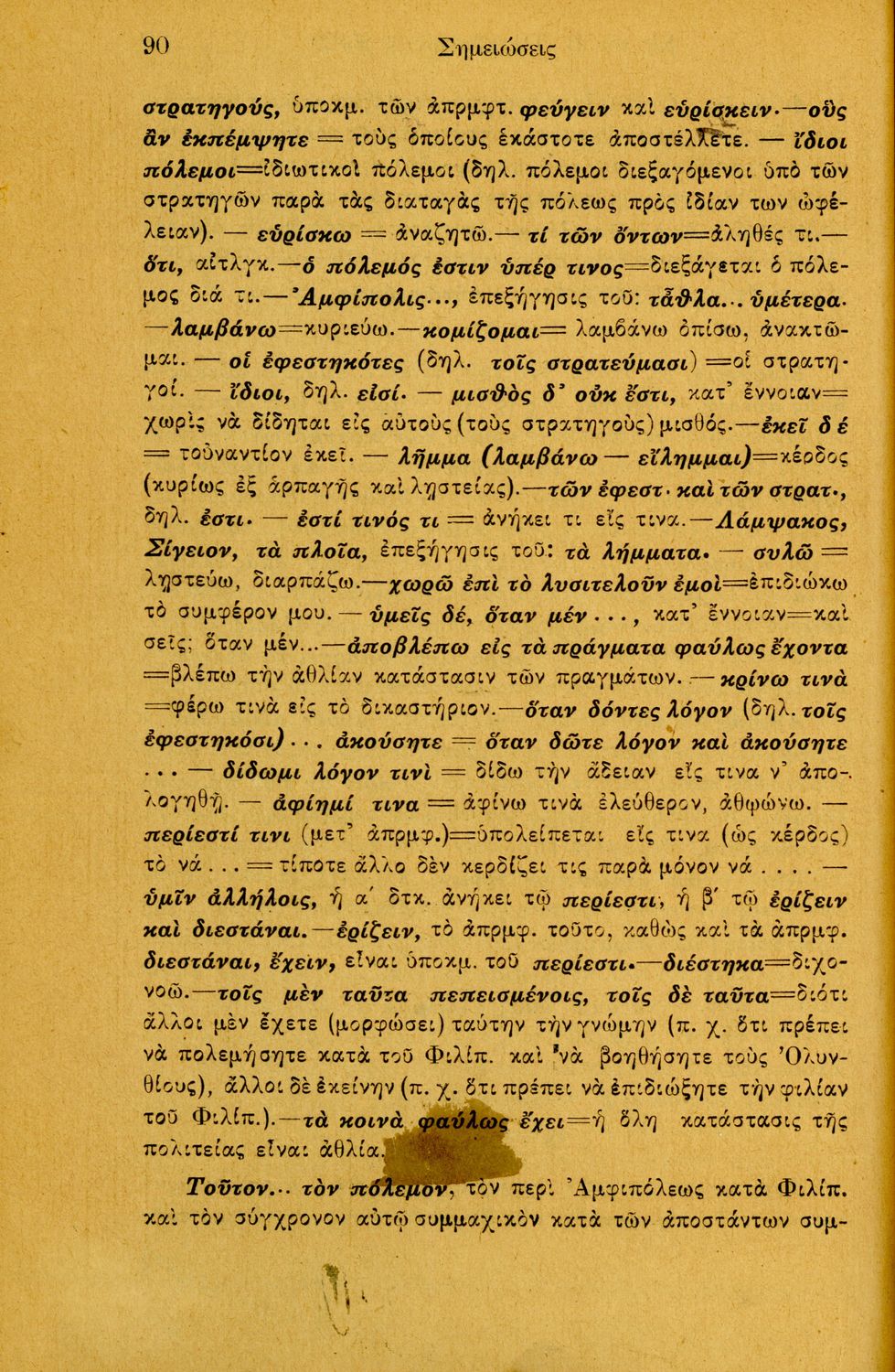 Σχολικό εγχειρίδιο Αρχαίων Ελληνικών Δ΄ Γυμνασίου που περιέχει τους Ολυνθιακούς Α΄ και Β΄ και τους Φιλιππικούς Α΄ και Β' του Δημοσθένη, ερμηνευτικά και πραγματολογικά σχόλια και γραμματικές παρατηρήσεις.