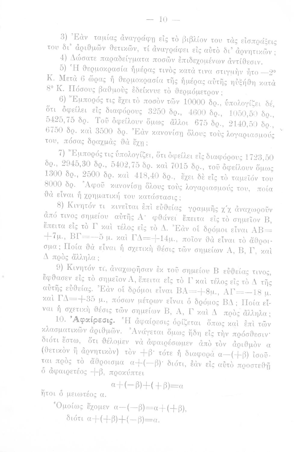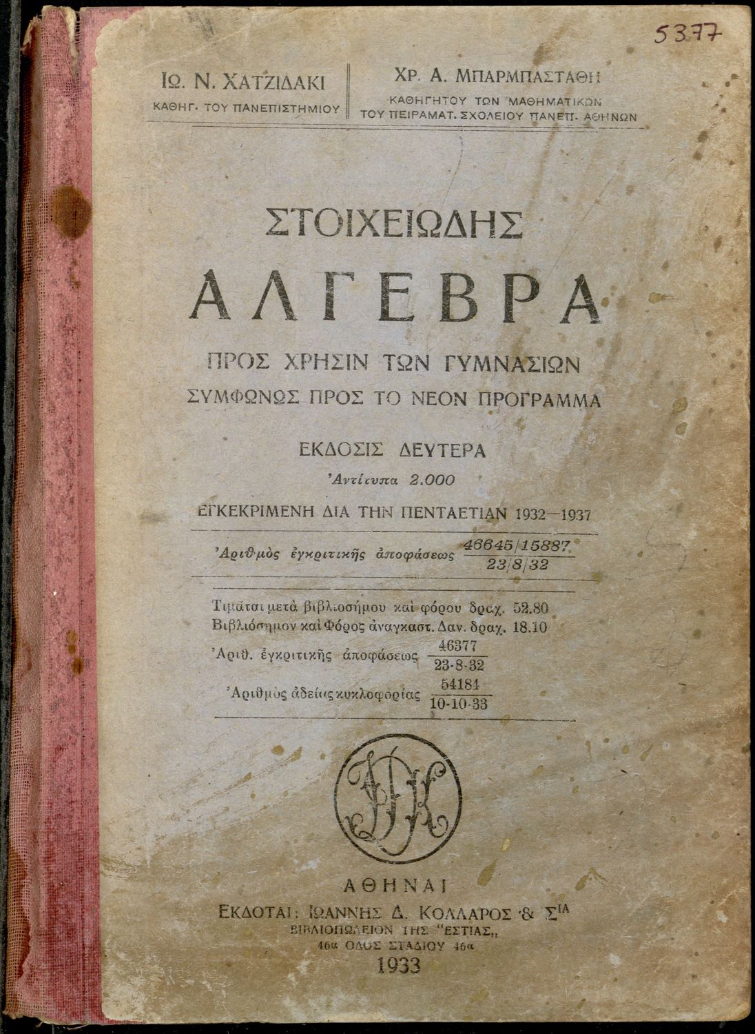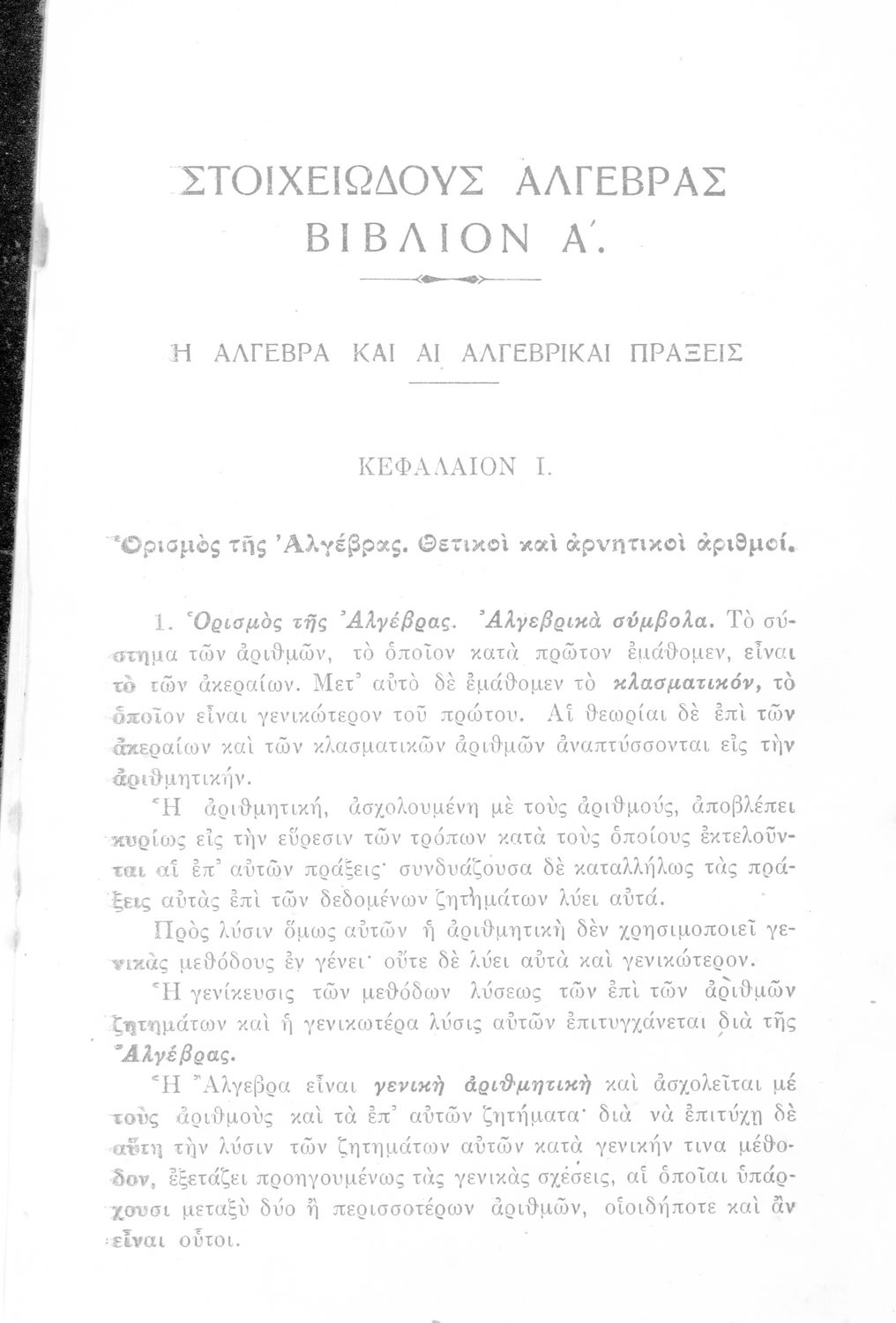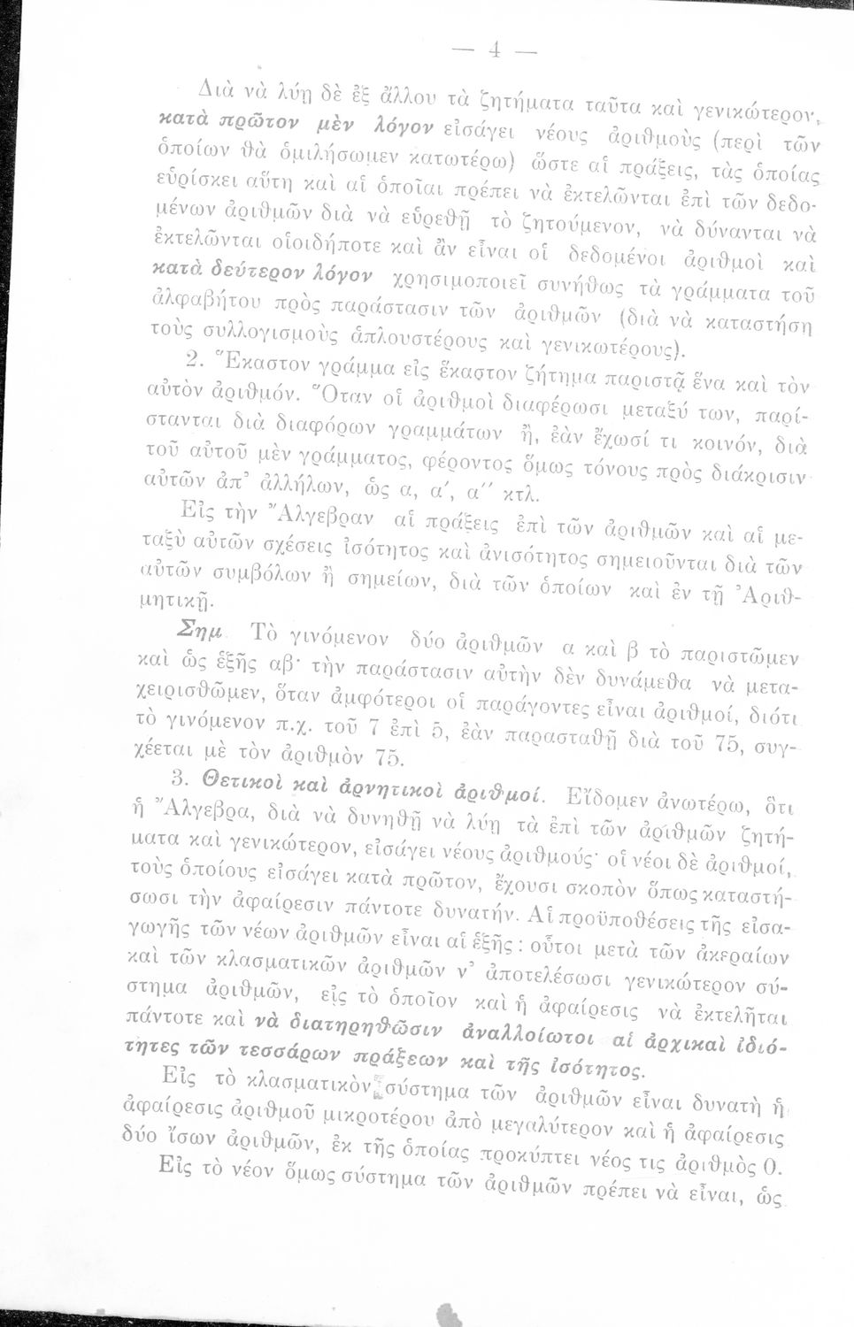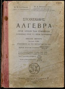 Σχολικό εγχειρίδιο Άλγεβρας Γυμνασίου που περιέχει θεωρία και ασκήσεις. Ο συγγραφέας ήταν υφηγητής στο Εθνικό Πανεπιστήμιο.