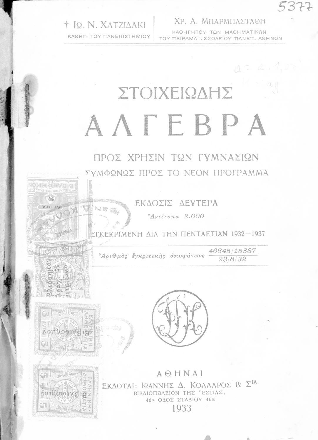 Τίτλος: Στοιχειώδης άλγεβρα προς χρήσιν των Γυμνασίων