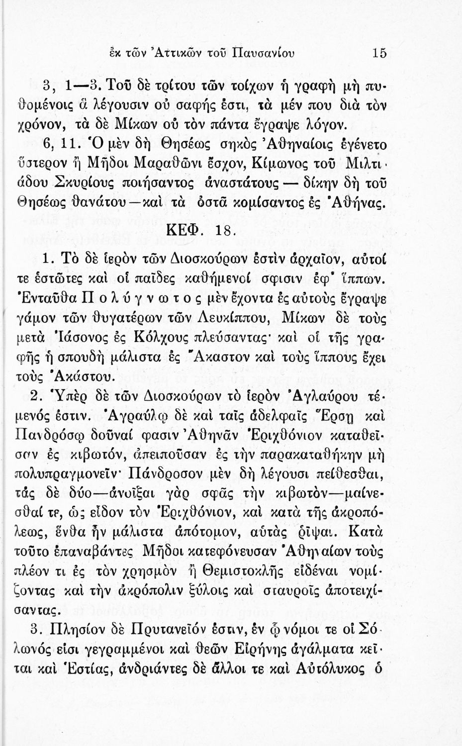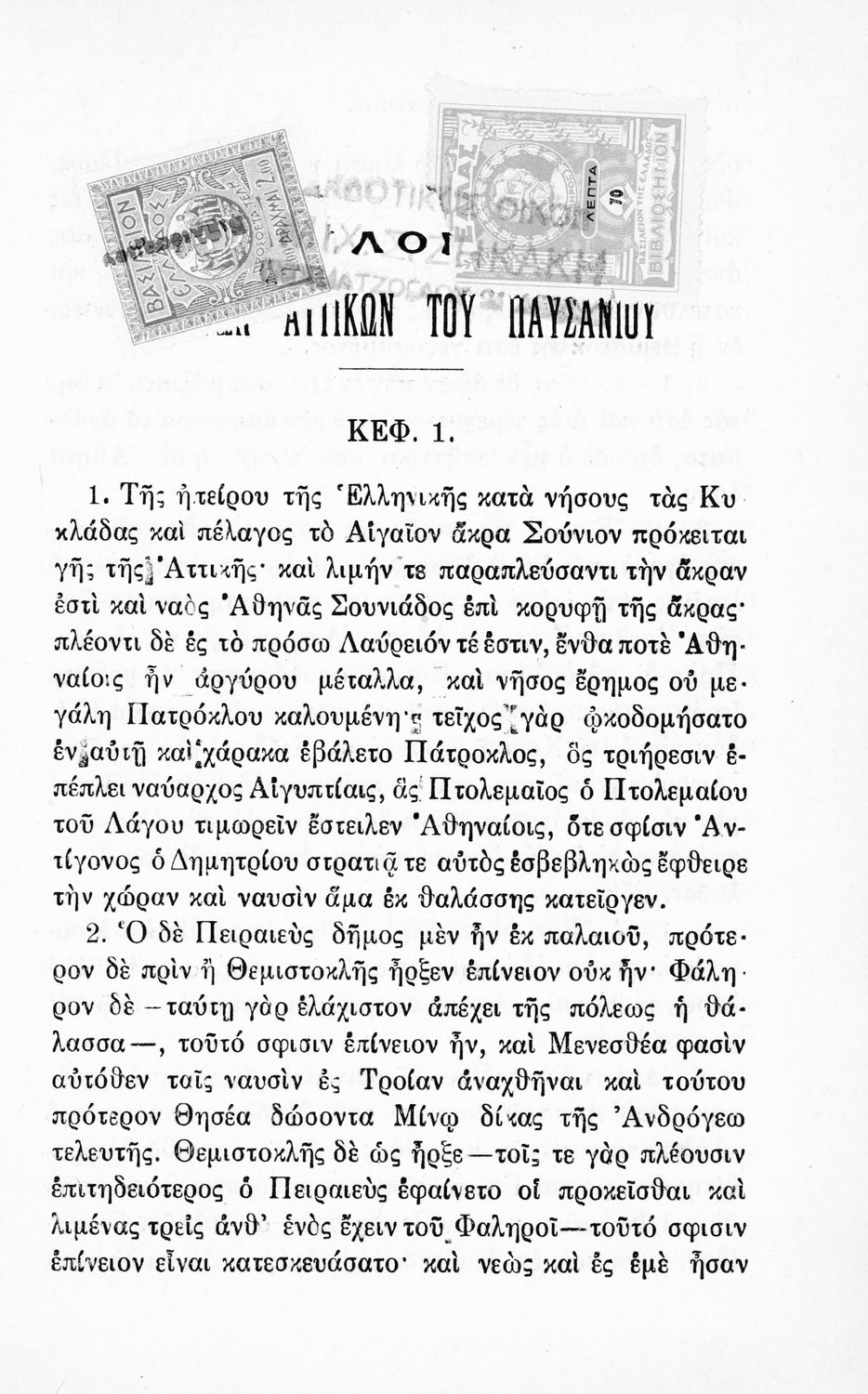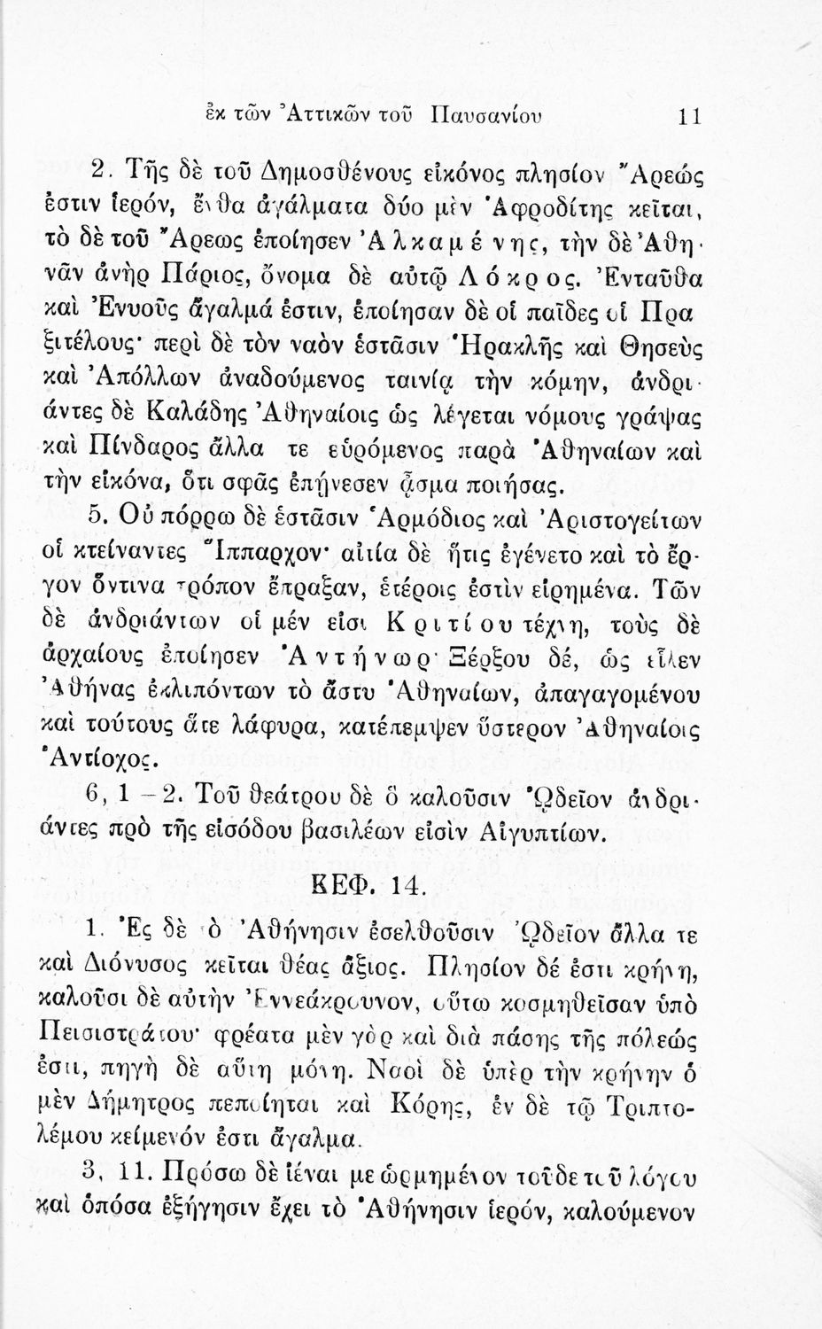 Σχολικό εγχειρίδιο Αρχαίων Ελληνικών Δ΄ Γυμνασίου που περιλαμβάνει αποσπάσματα από τα Αττικά του Παυσανία, εισαγωγή στη ζωή και το έργο του, και ερμηνευτικά και πραγματολογικά σχόλια.