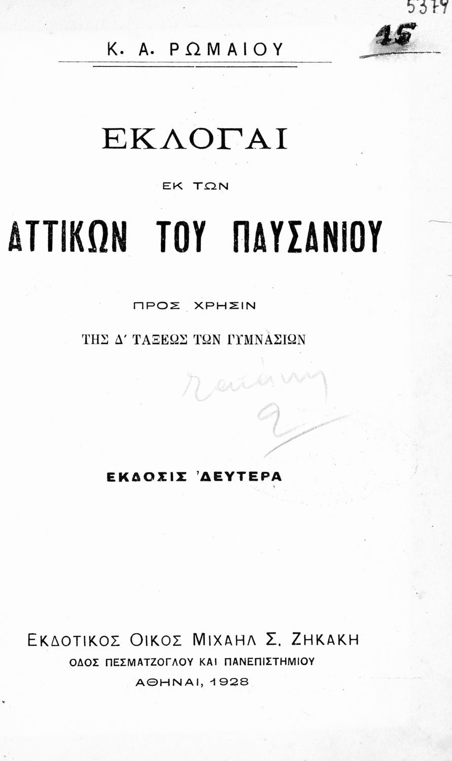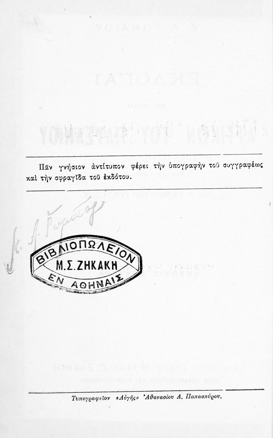 Εκδότης: Μ. Ζηκάκης Έτος έκδοσης: 1928 Τόπος έκδοσης: Αθήνα Έκδοση: 2η |
