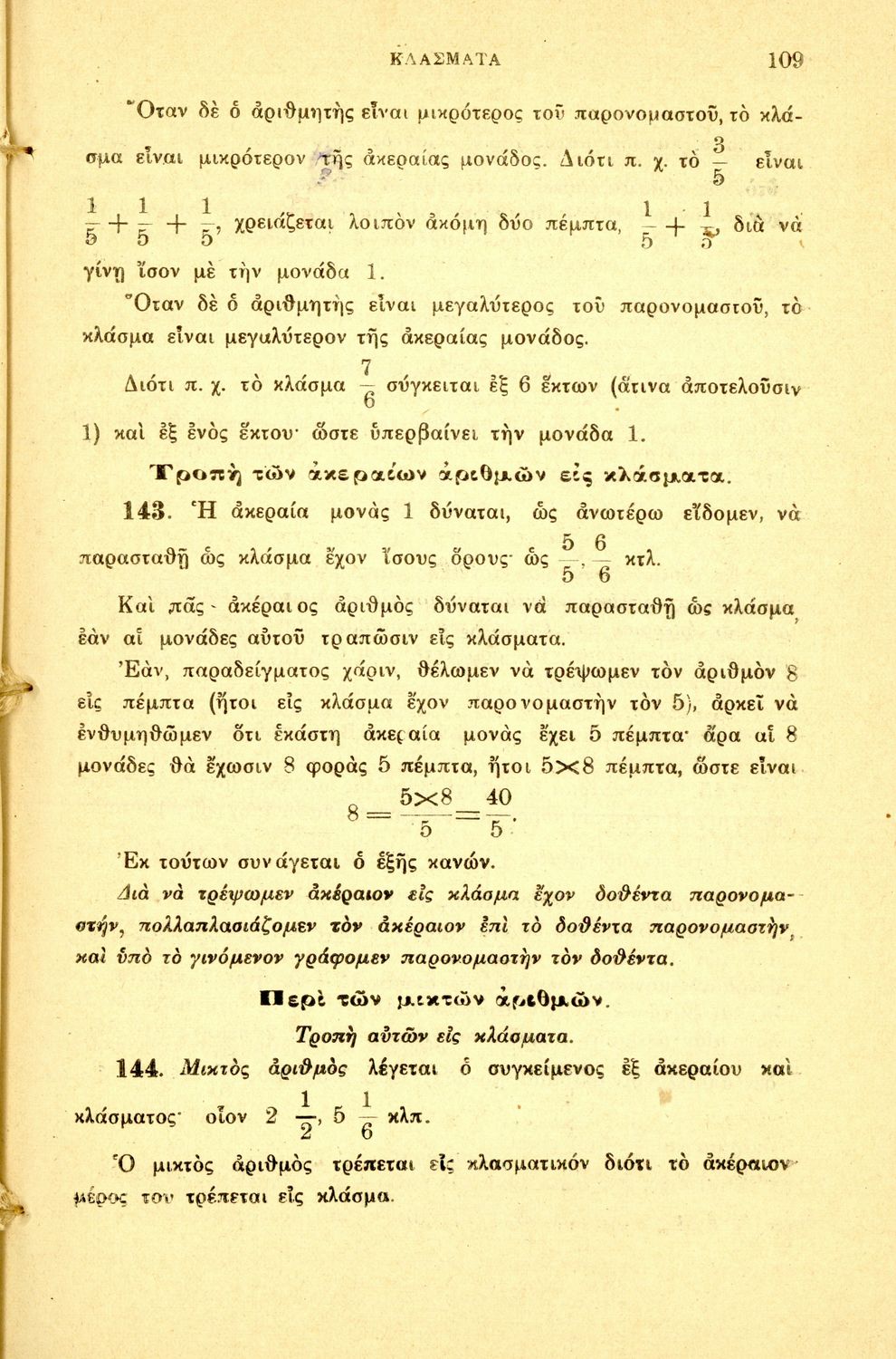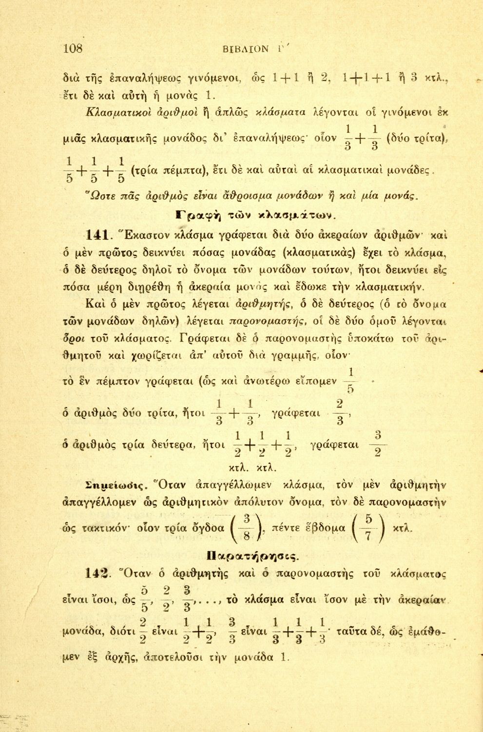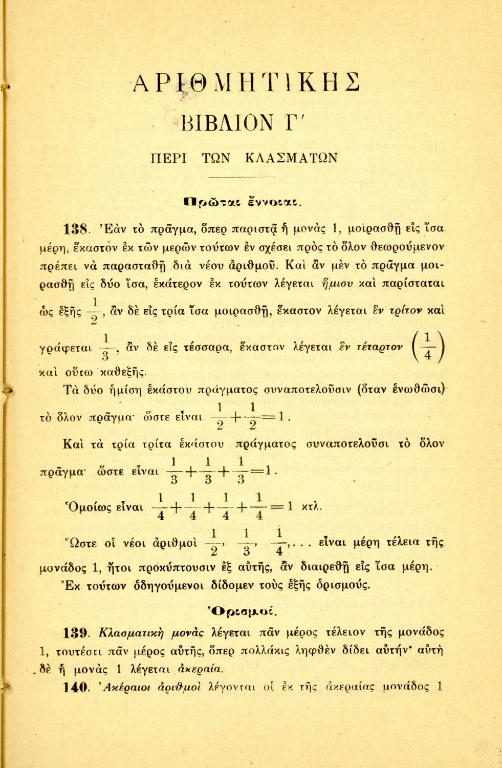 Σχολικό εγχειρίδιο Αριθμητικής για τα Γυμνάσια και Λύκεια που εστιάζει στις αριθμητικές πράξεις με ακέραιους αριθμούς και κλάσματα και είναι χωρισμένο σε ορισμούς, θεωρήματα και ασκήσεις.