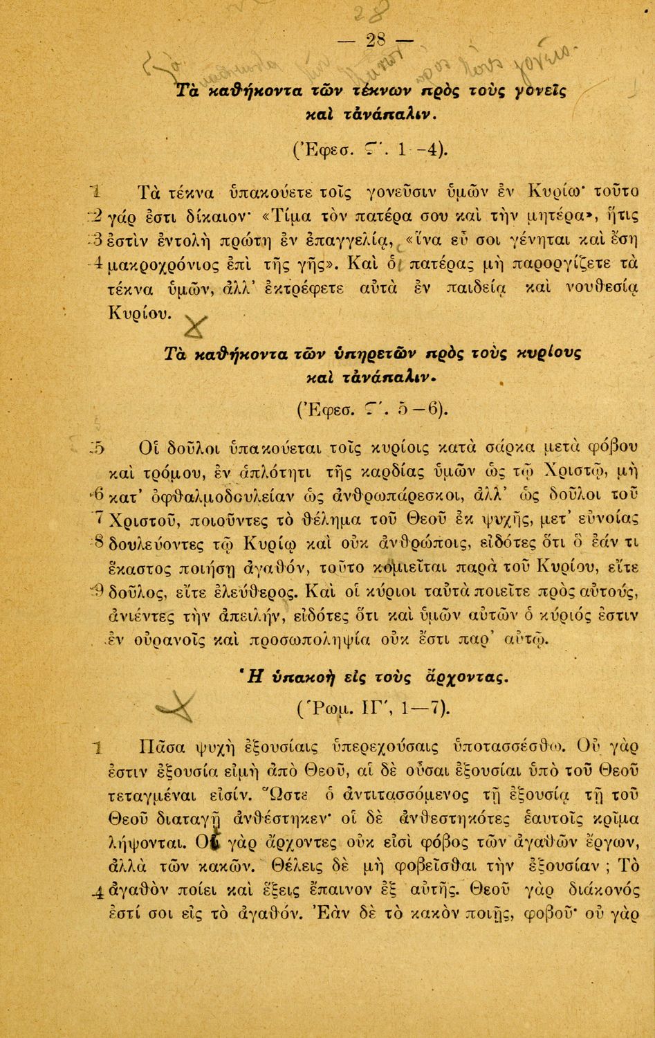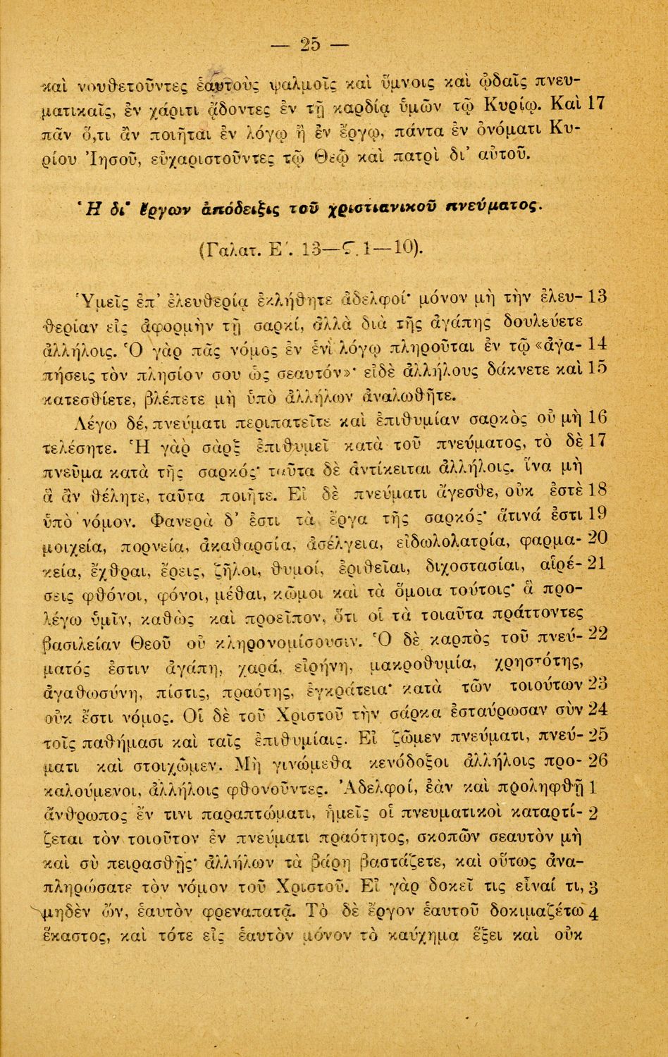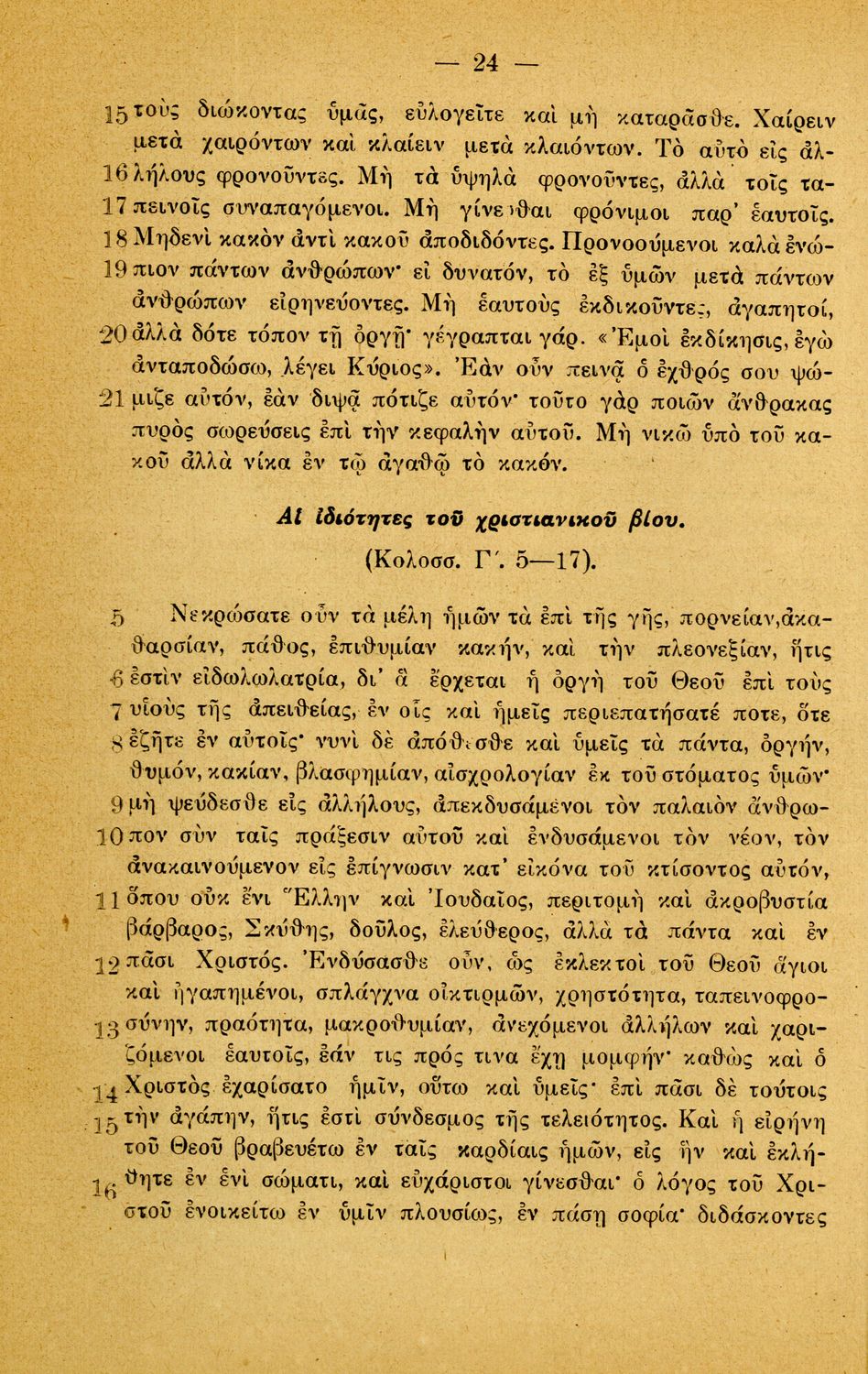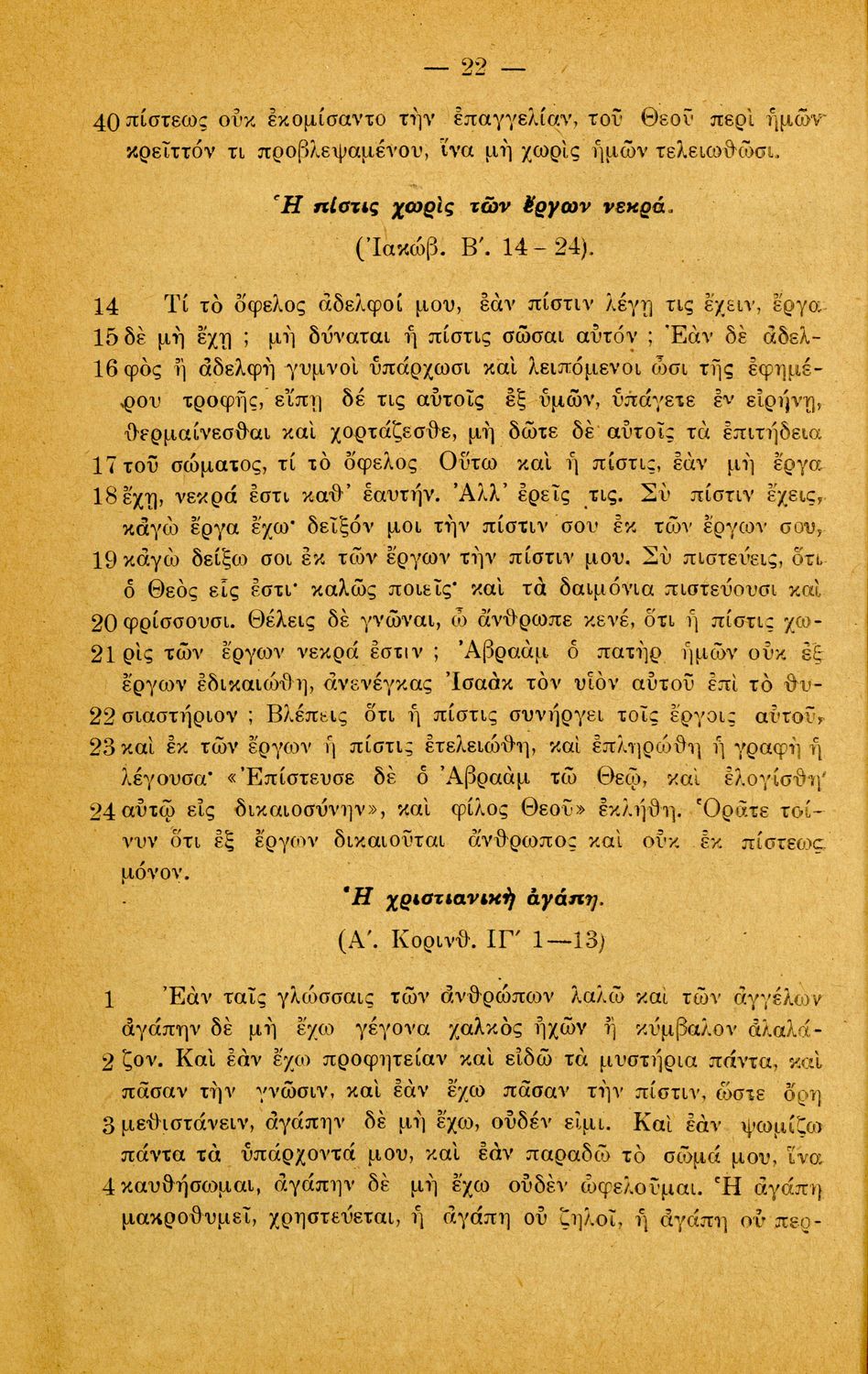 Σχολικό εγχειρίδιο Θρησκευτικών για τα Γυμνάσια, τα Διδασκαλεία και τα Παρθεναγωγεία που περιλαμβάνει αποσπάσματα από τις πράξεις των Αποστόλων, περικοπές ύμνων και ψαλμωδιών και επιστολές του Αποστόλου Παύλου.