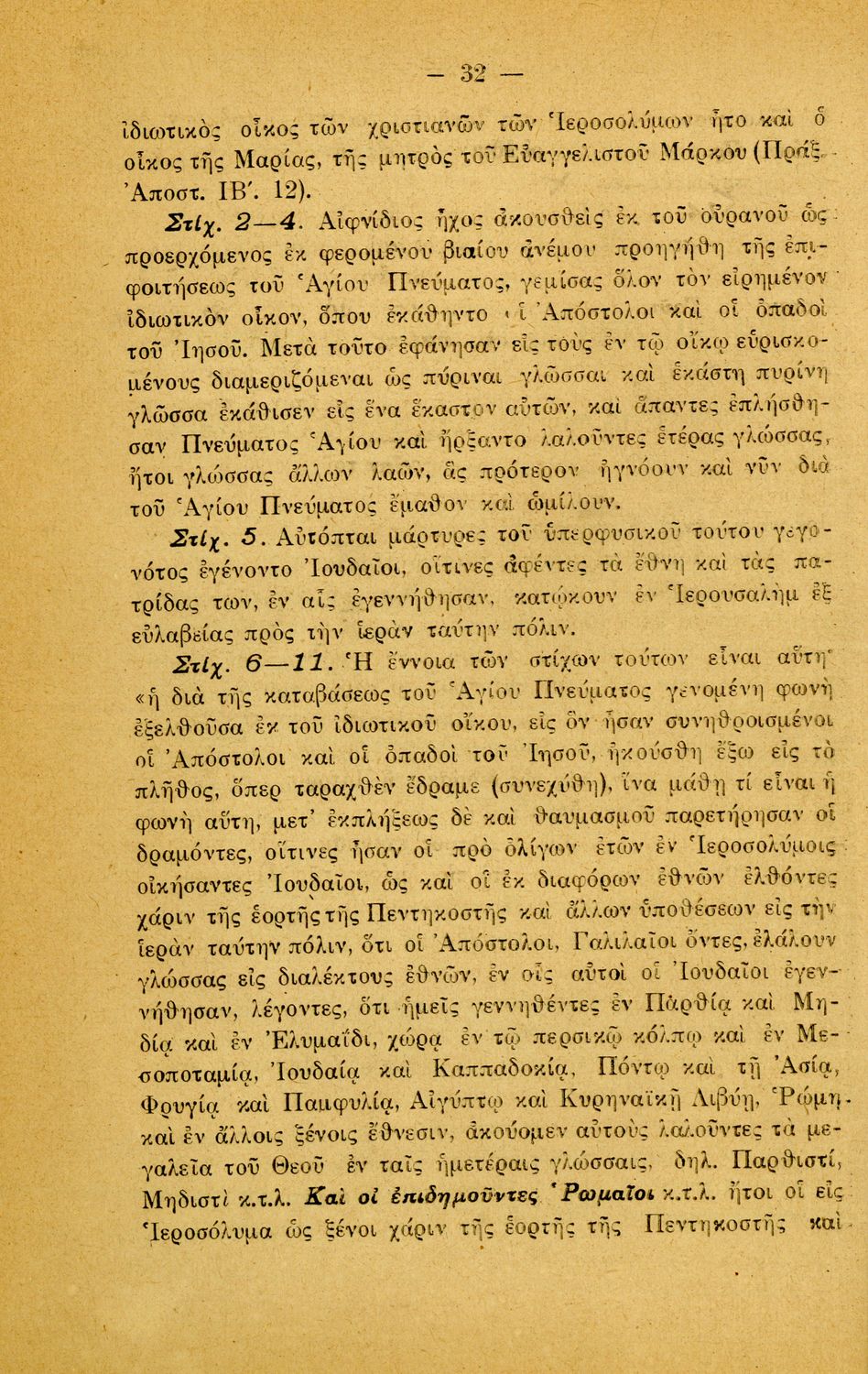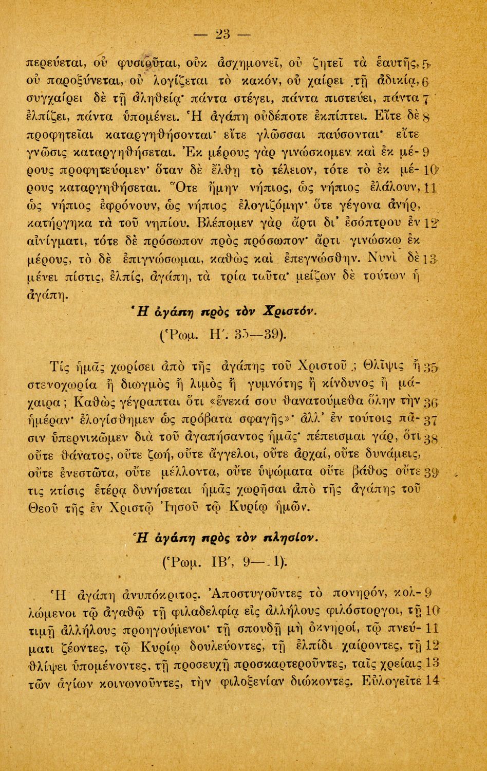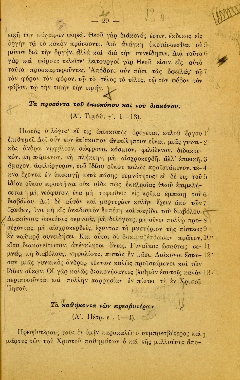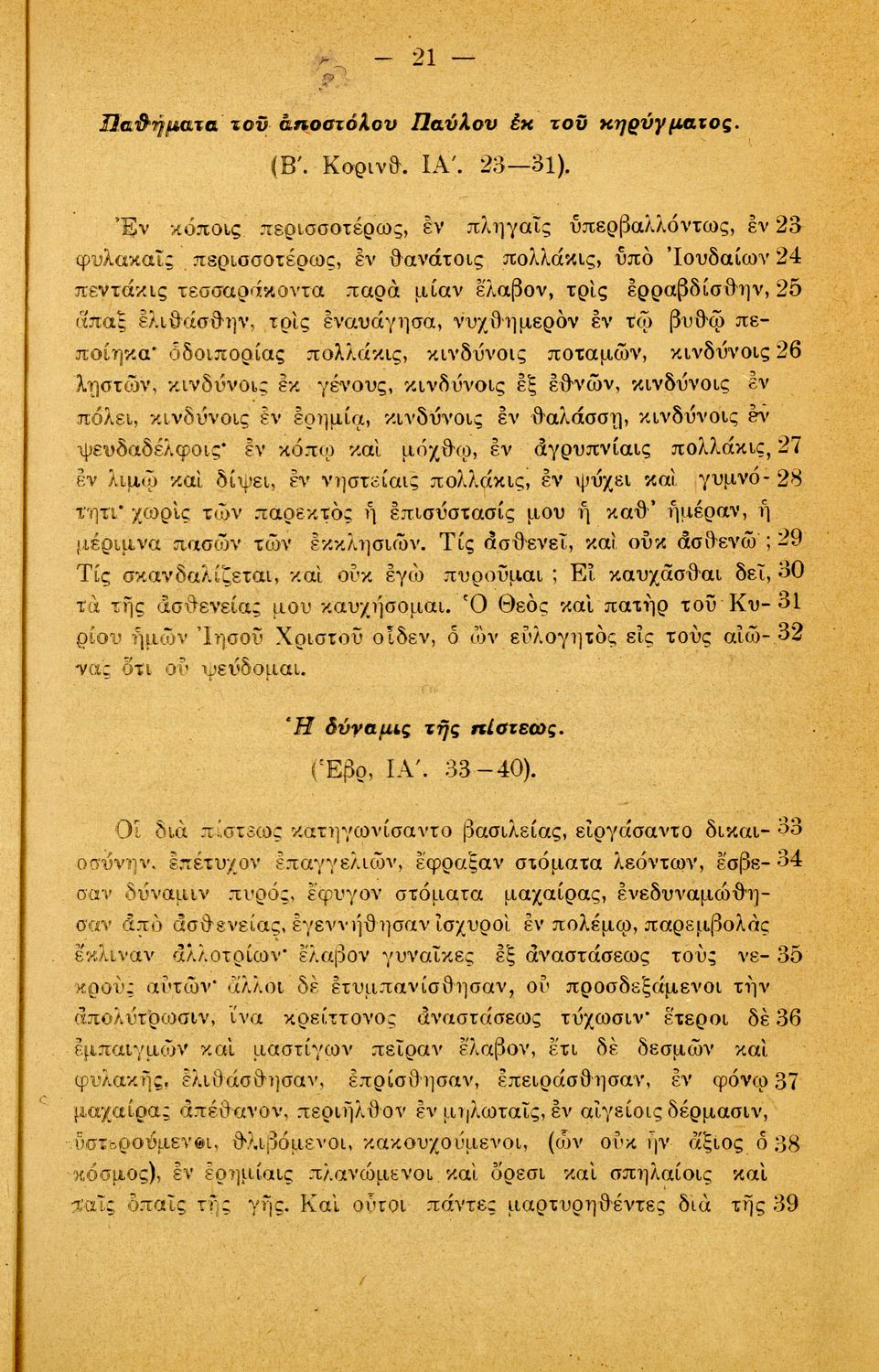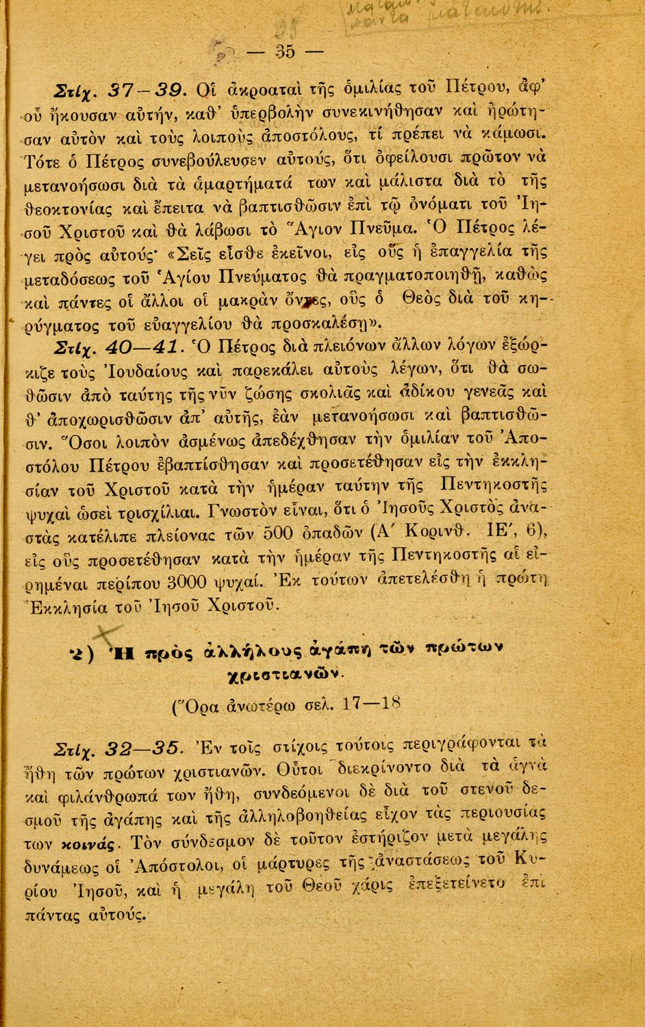 Σχολικό εγχειρίδιο Θρησκευτικών για τα Γυμνάσια, τα Διδασκαλεία και τα Παρθεναγωγεία που περιλαμβάνει αποσπάσματα από τις πράξεις των Αποστόλων, περικοπές ύμνων και ψαλμωδιών και επιστολές του Αποστόλου Παύλου.