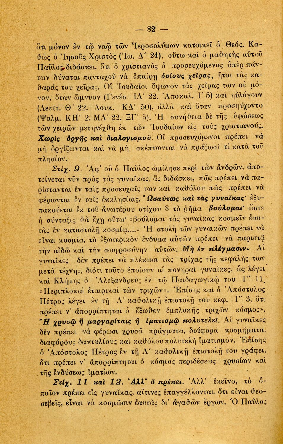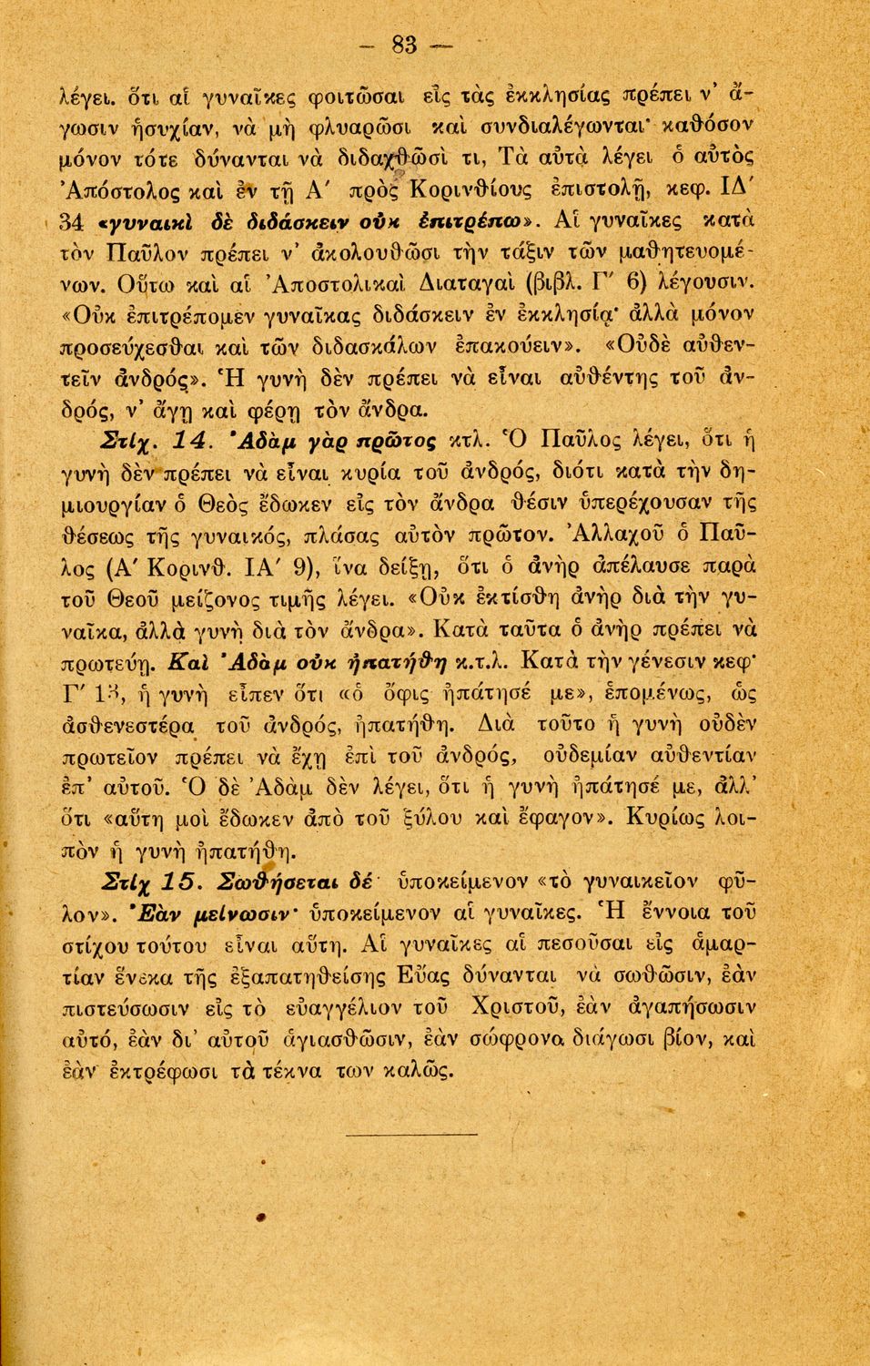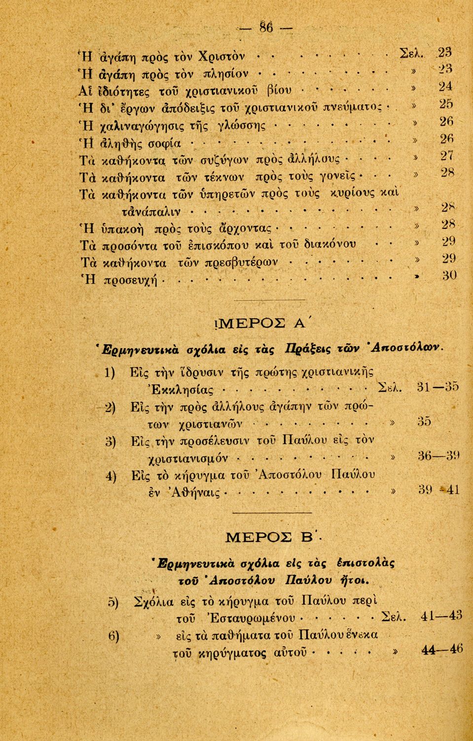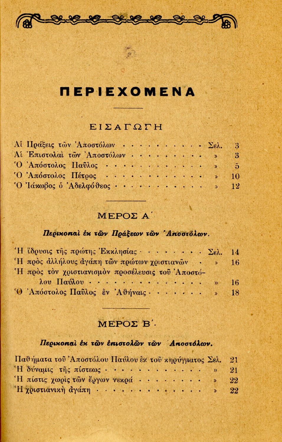 Σχολικό εγχειρίδιο Θρησκευτικών για τα Γυμνάσια, τα Διδασκαλεία και τα Παρθεναγωγεία που περιλαμβάνει αποσπάσματα από τις πράξεις των Αποστόλων, περικοπές ύμνων και ψαλμωδιών και επιστολές του Αποστόλου Παύλου.