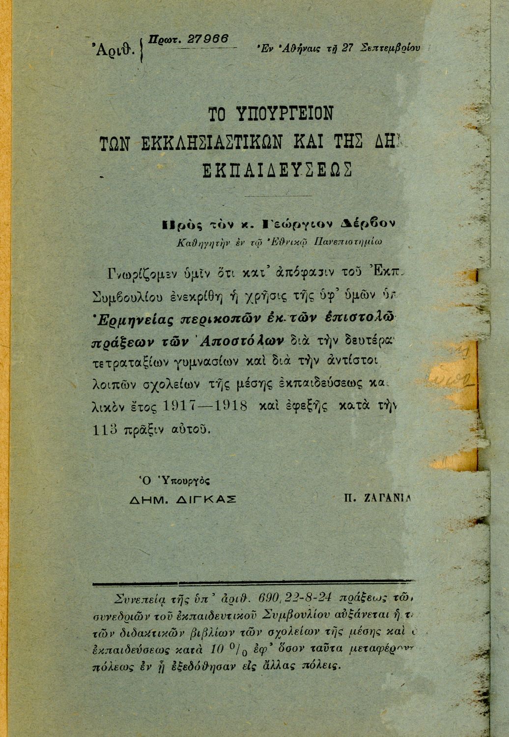 Τίτλος: Ερμηνεία περικοπών των Αποστόλων και των Πράξεων των Αποστόλων προς χρήσιν της Β΄ τάξεως των Γυμνασίων