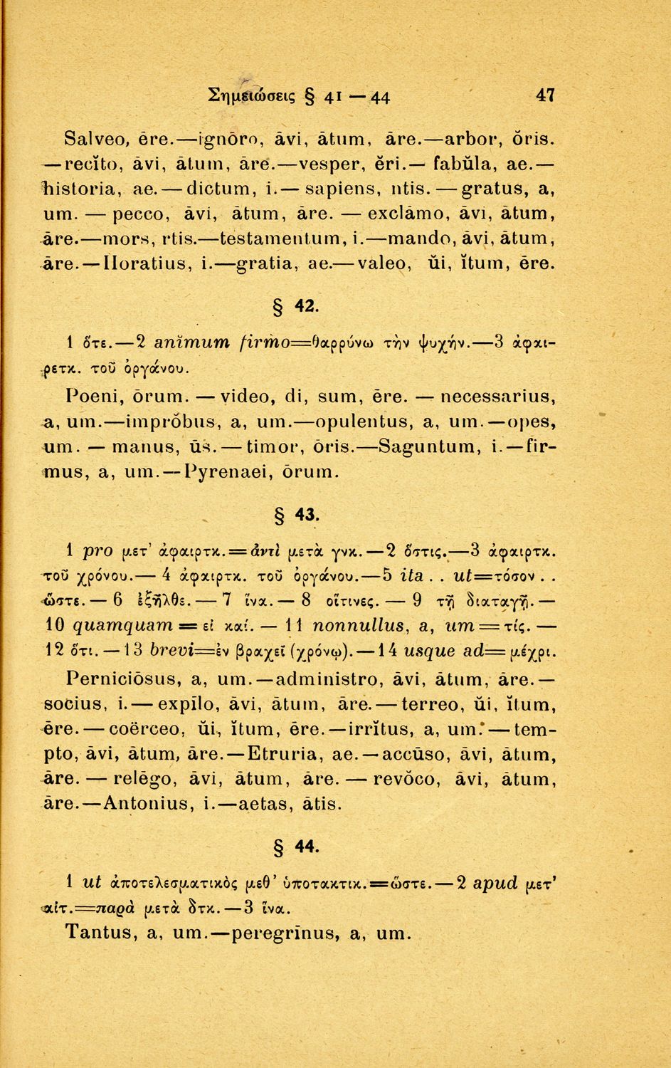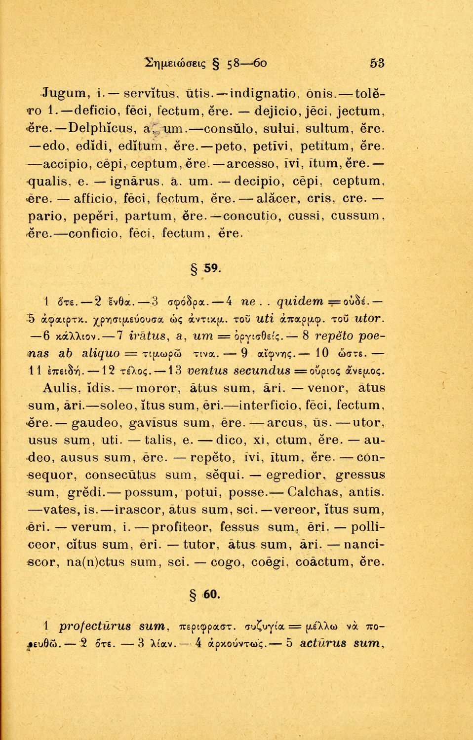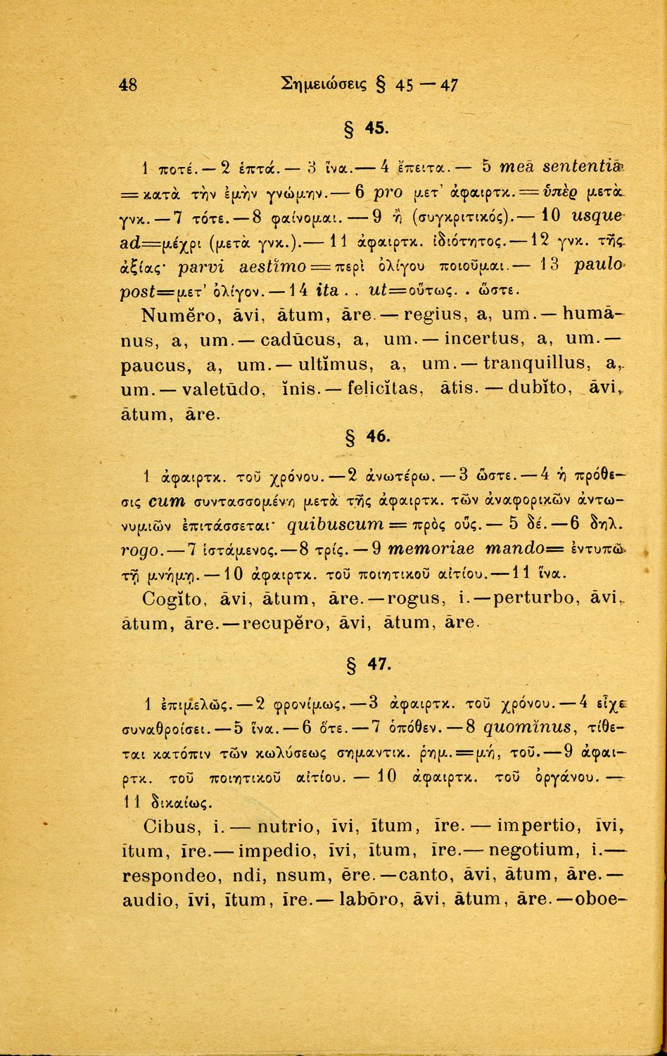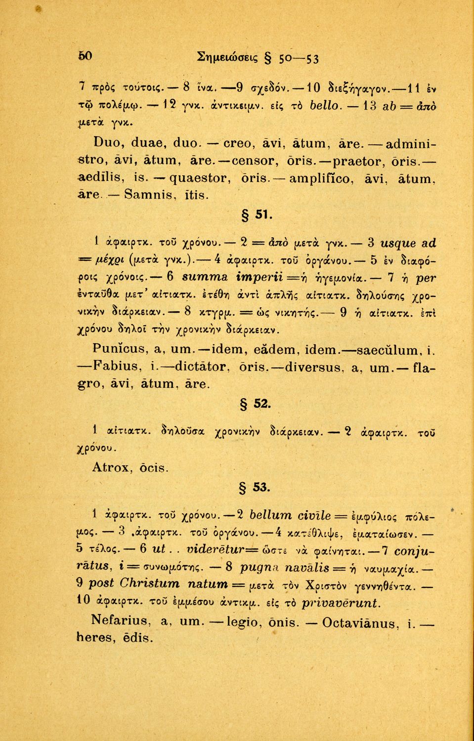Σχολικό εγχειρίδιο Λατινικών για τη Γ΄ Γυμνασίου που περιέχει 54 κείμενα/περικοπές στα λατινικά, ερμηνευτικά υπομνήματα, λεξιλόγιο και κατάλογο με τα συντακτικά φαινόμενα (αφαιρετική, προθέσεις, σύνδεσμοι) που