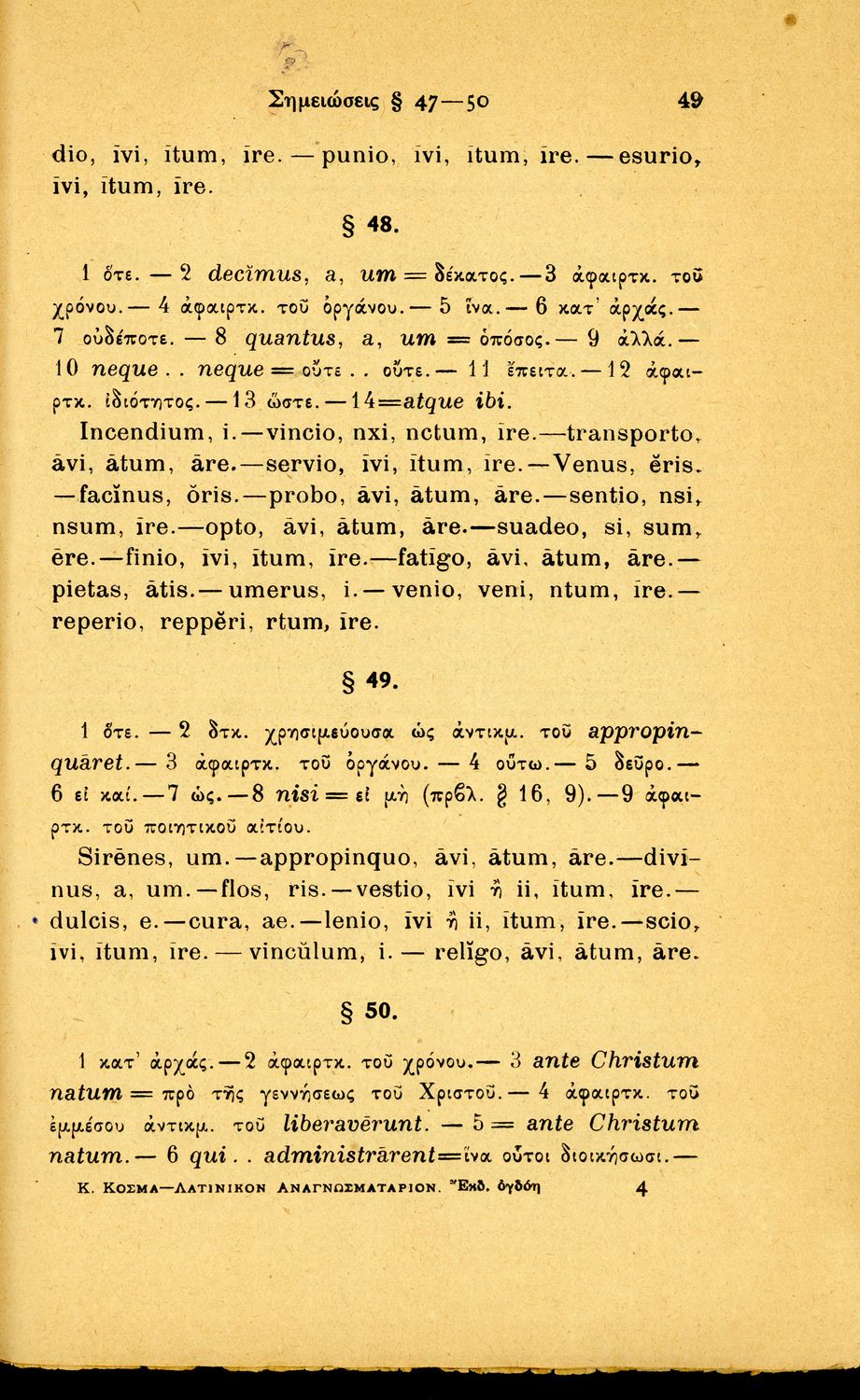Σχολικό εγχειρίδιο Λατινικών για τη Δ΄ Γυμνασίου που περιέχει 54 κείμενα/περικοπές στα λατινικά, ερμηνευτικά υπομνήματα, λεξιλόγιο και κατάλογο με τα συντακτικά φαινόμενα (αφαιρετική, προθέσεις, σύνδεσμοι) που