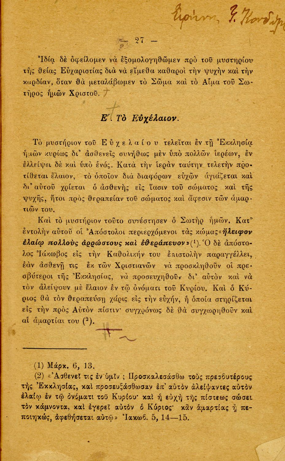 LDR 01311 2200217 4500 035 ## _a20-05387 040 ## _aΚΕΝΕΚ - Εταιρεία Σπουδών Νεοελληνικού Πολιτισμού και Παιδείας 041 ## _ael 100 ## _aΓεώργιος Δ. Σουμελίδης 110 ## _a5387 245 0# _aΟρθόδοξος χριστιανική κατήχησις προς χρήσιν των μαθητών της Γ΄ τάξεως των Ελληνικών Σχολείων 250 ## _a1η Έκδοση 260 ## _aΑθήνα _bΙωάννης Ν. Σιδέρης _c1921 300 ## _a58 _c20 520 ## _aΣχολικό εγχειρίδιο Θρησκευτικών Γ' Ελληνικού Σχολείου που περιλαμβάνει εισαγωγή στη χριστιανική κατήχηση και τα δόγματά της και πραγματεύεται δογματικά και ηθικά ζητήματα της ορθόδοξης παράδοσης. 521 ## _aΓ' Ελληνικού Σχολείου 522 ## _aΕλλάδα 546 ## _aΚαθαρεύουσα 563 ## _aΜαλακό Εξώφυλλο 583 ## _a38839/21-9-1920 _c1920 650 #4 _aΕορτές _aΗθικές αξίες χριστιανών _aΘεία μυστήρια _aΠροσευχές