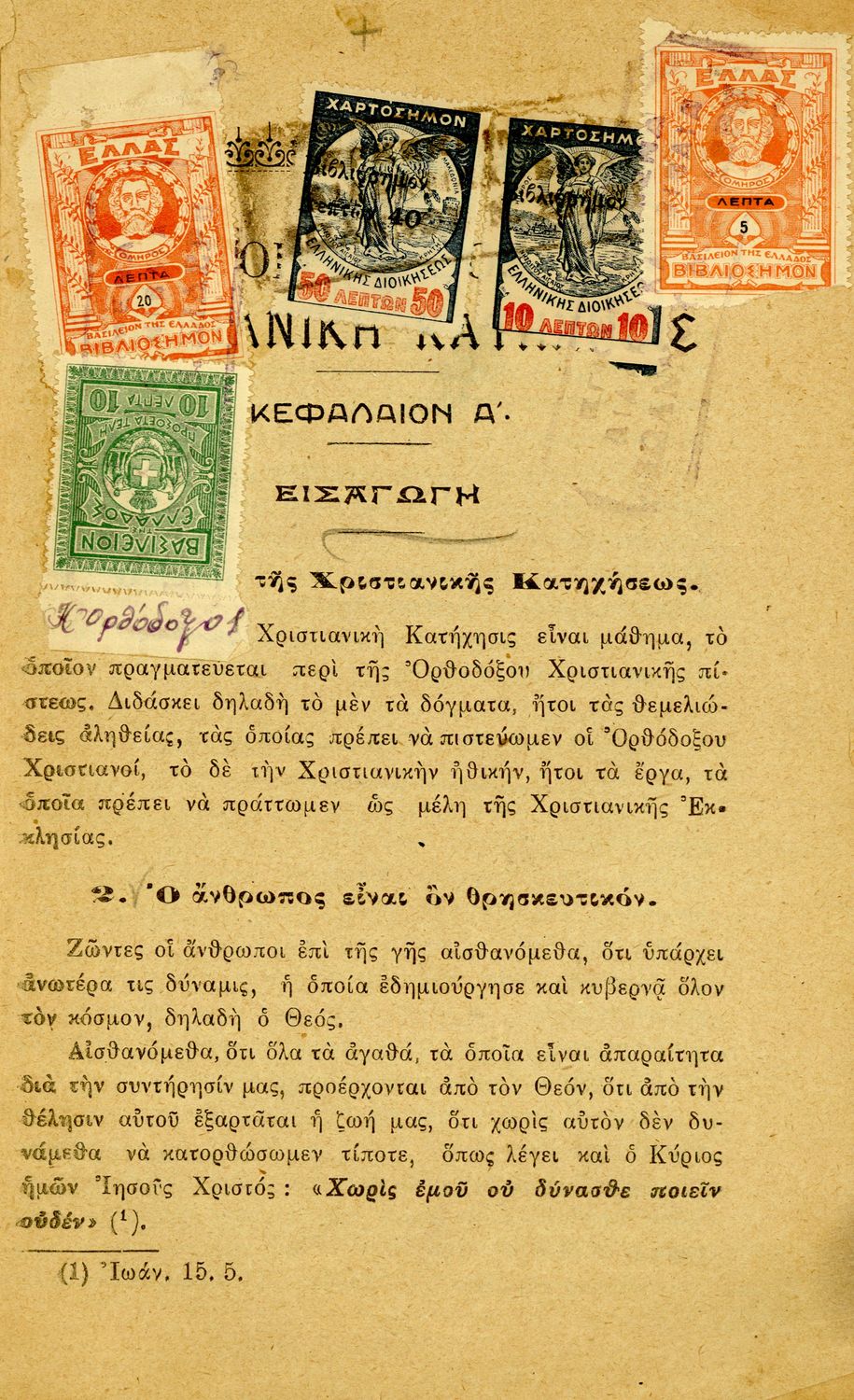 Σχολικό εγχειρίδιο για τις τάξεις του Ελληνικού για το μάθημα των Θρησκευτικών. Το εγχειρίδιο περιλαμβάνει εισαγωγικά τους ορισμούς της κατήχησης, τα ιερά βιβλία της χριστιανικής εκκλησίας, τις δέκα εντολές. Ο