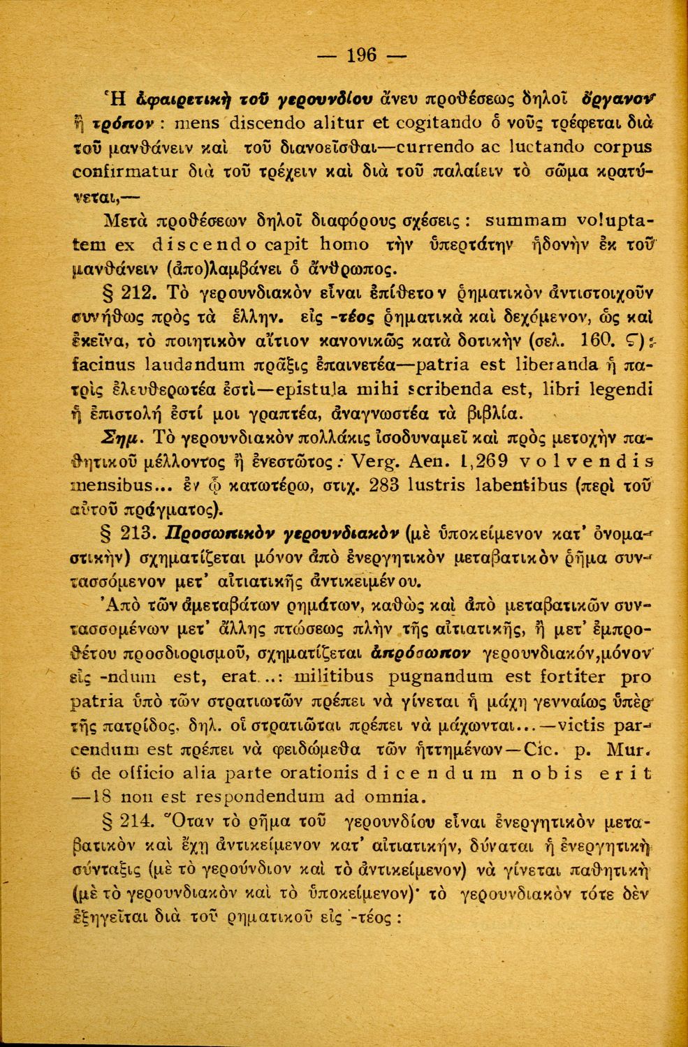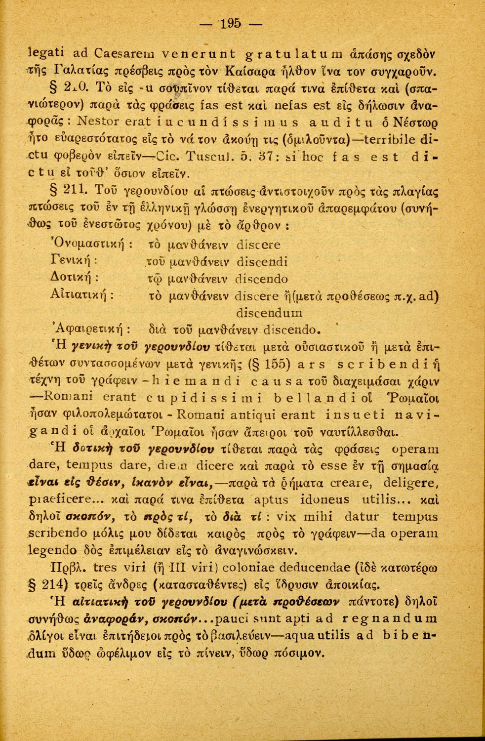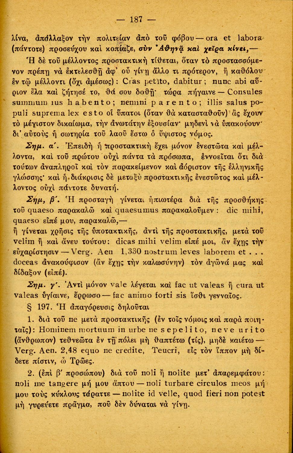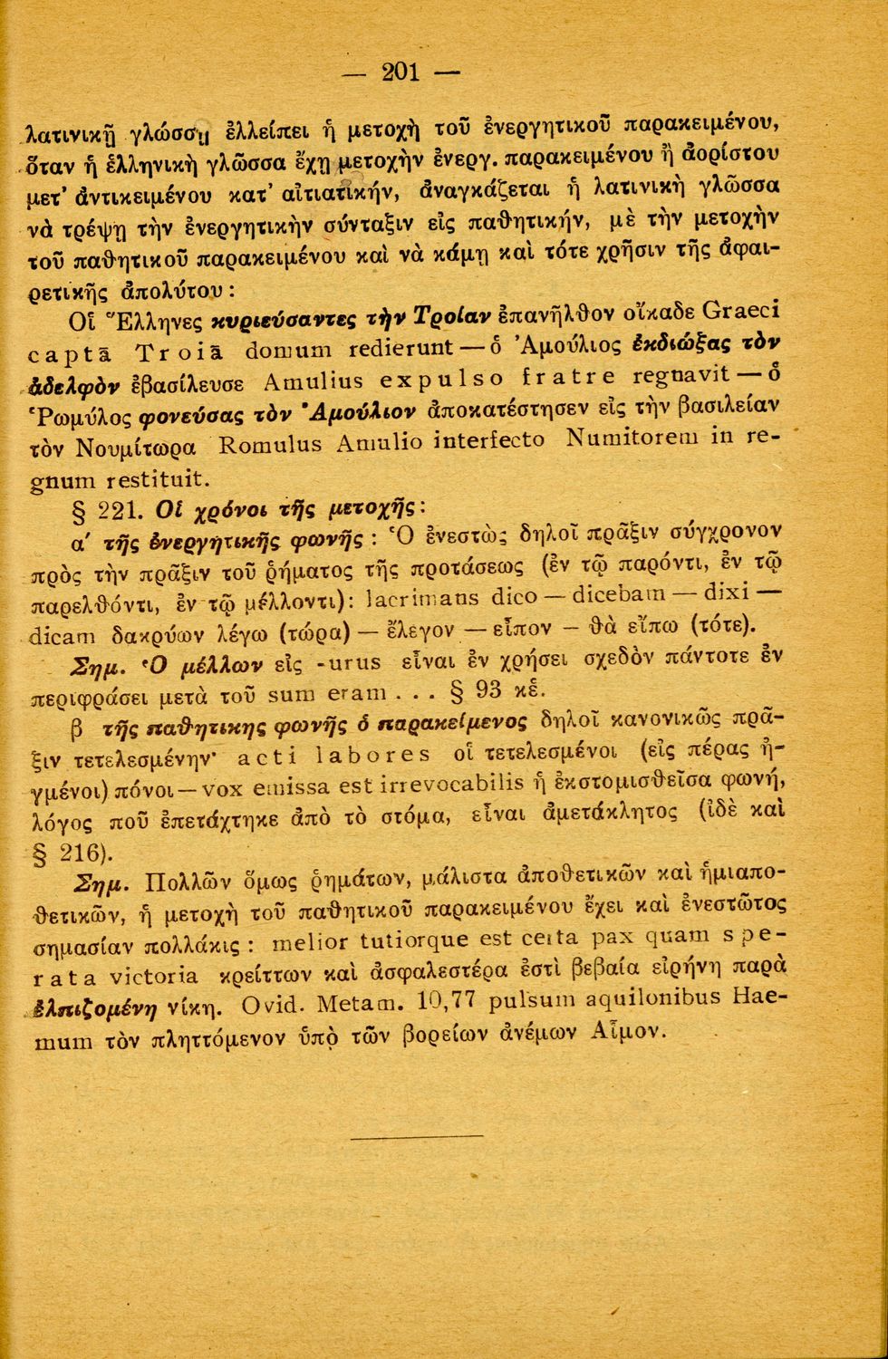 Σχολικό εγχειρίδιο Λατινικών Α΄, Β΄, Γ' Γυμνασίου που περιλαμβάνει γραμματική και συντακτικό και είναι χωρισμένο σε φθογγολογικό, τυπολογικό και ετυμολογικό μέρος.