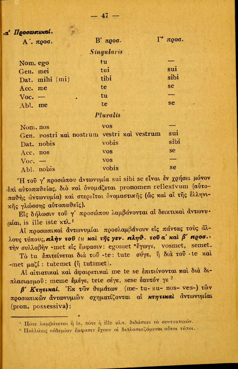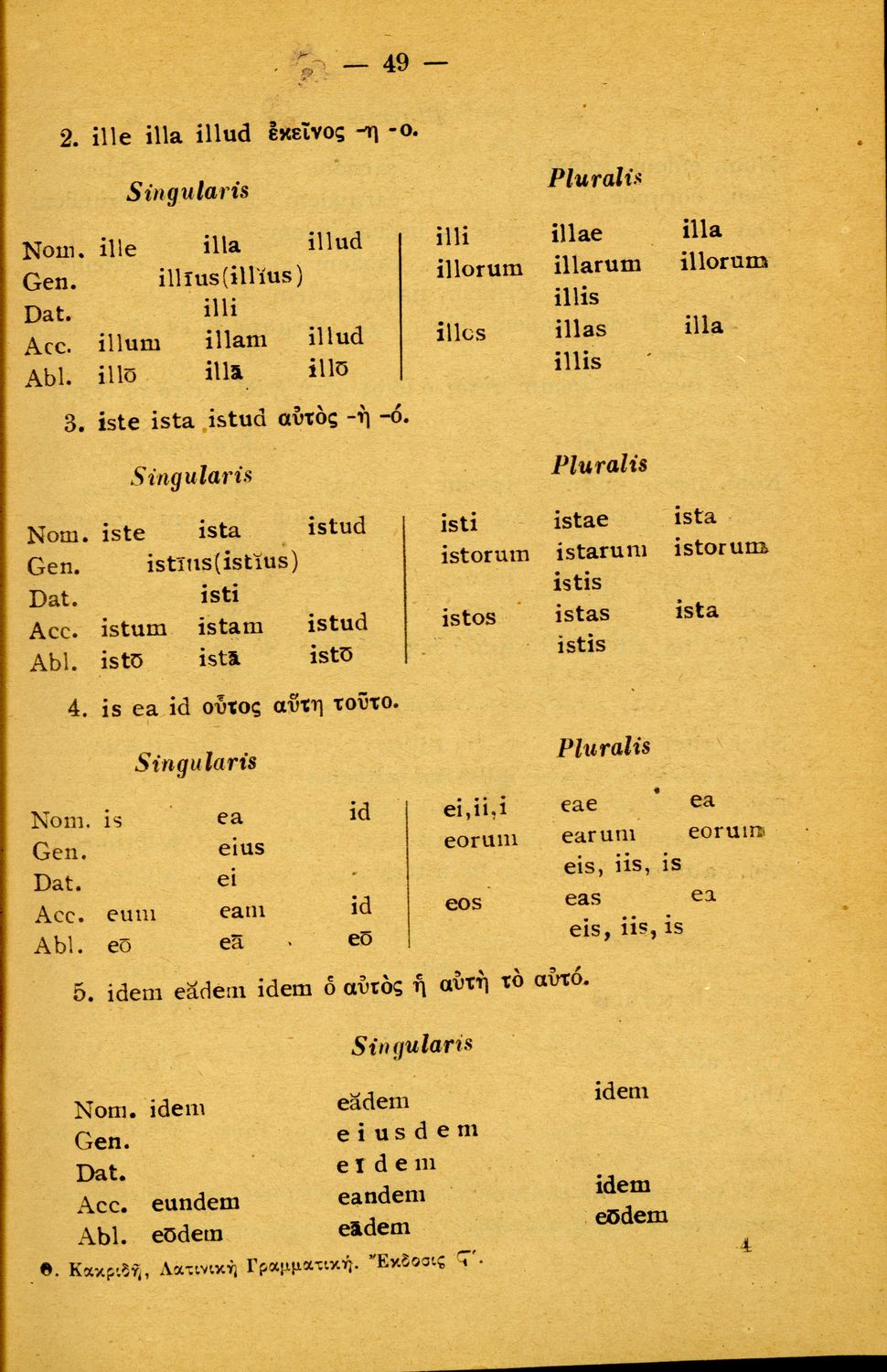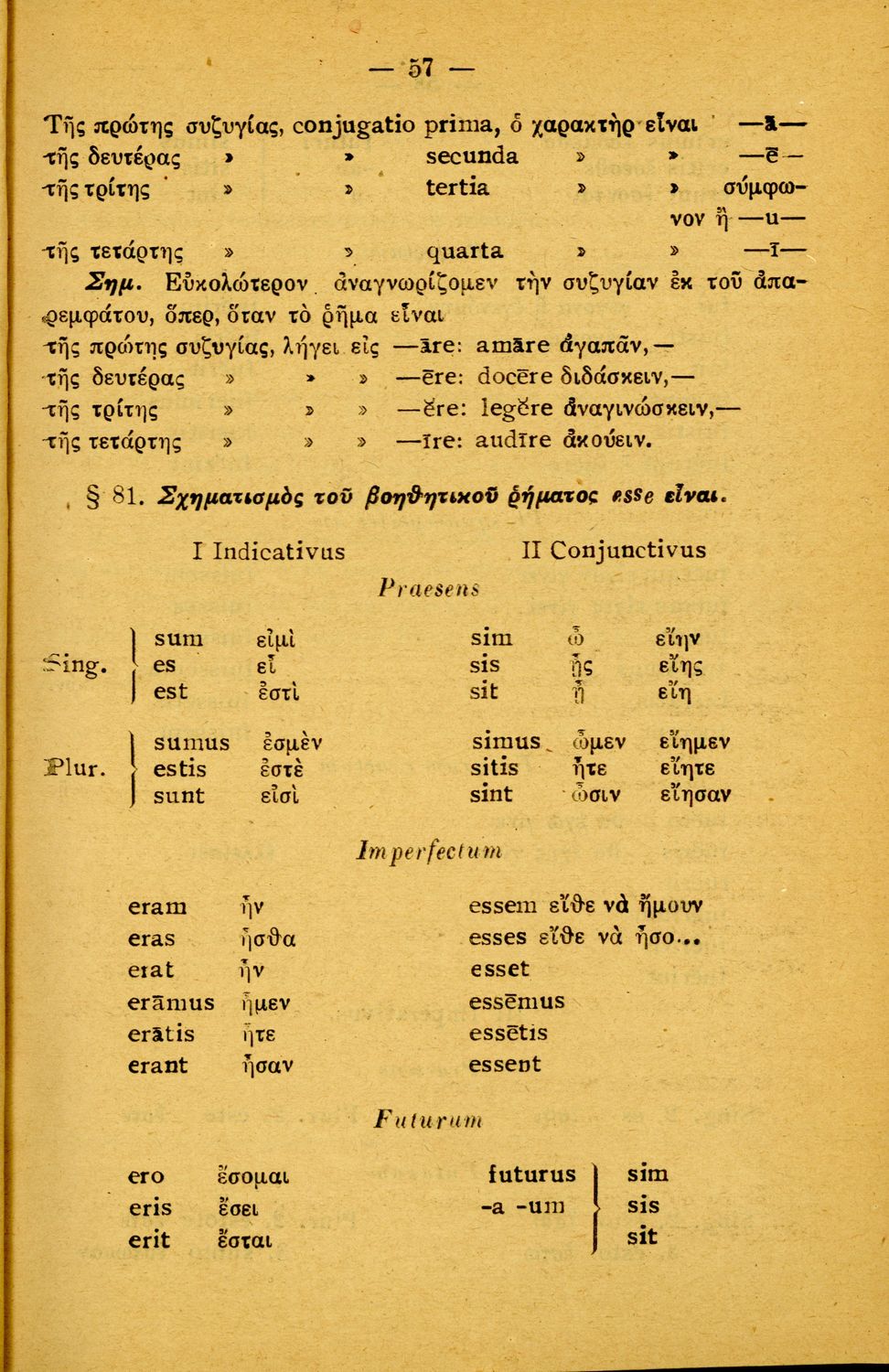 Σχολικό εγχειρίδιο Λατινικών Α΄, Β΄, Γ' Γυμνασίου που περιλαμβάνει γραμματική και συντακτικό και είναι χωρισμένο σε φθογγολογικό, τυπολογικό και ετυμολογικό μέρος.