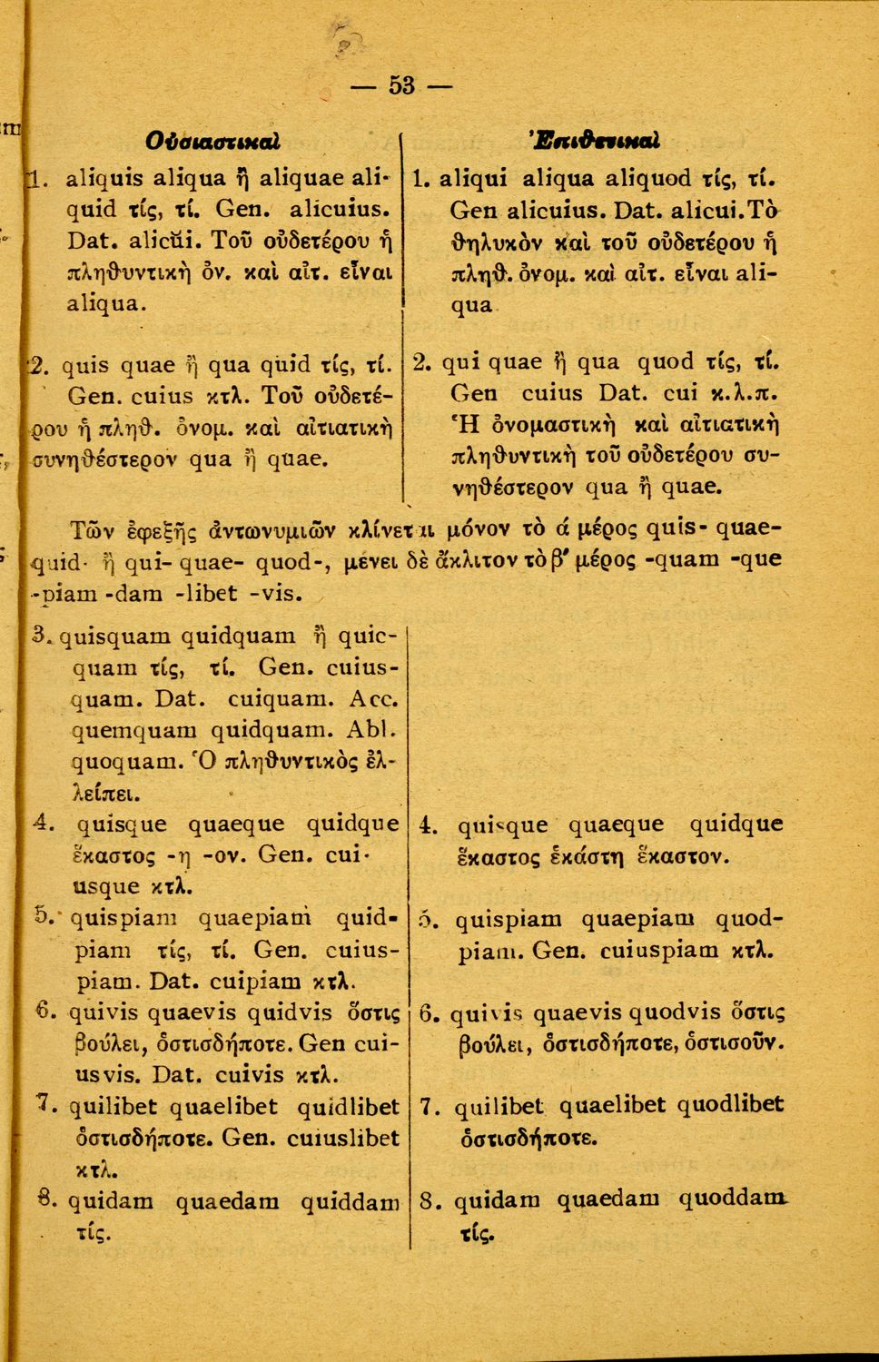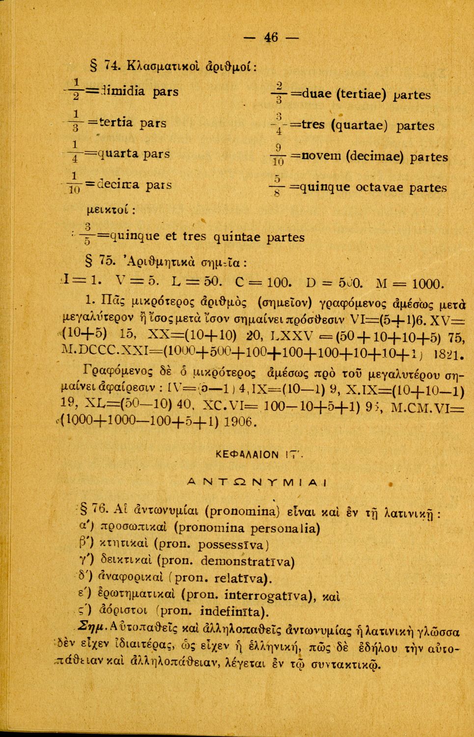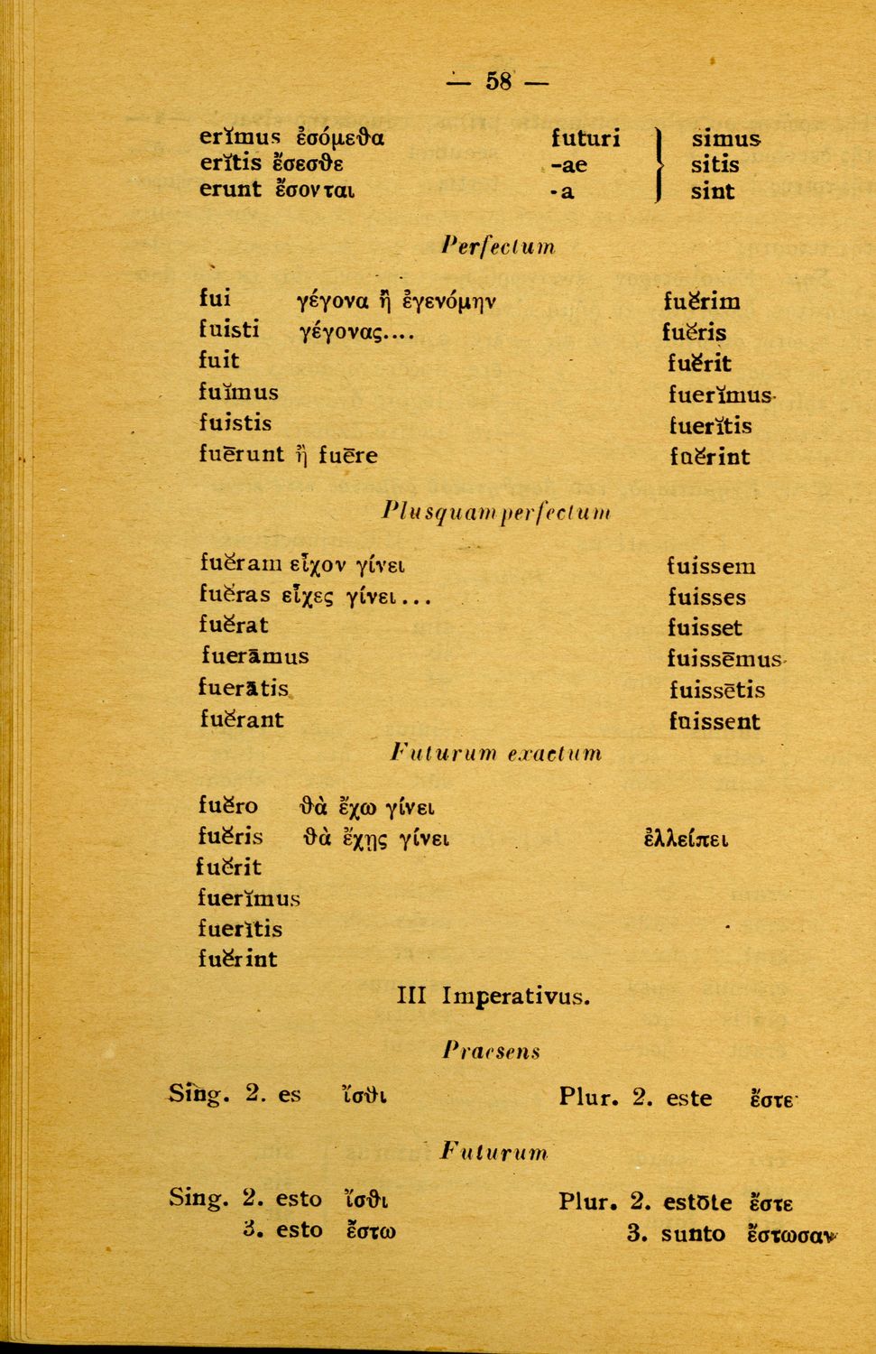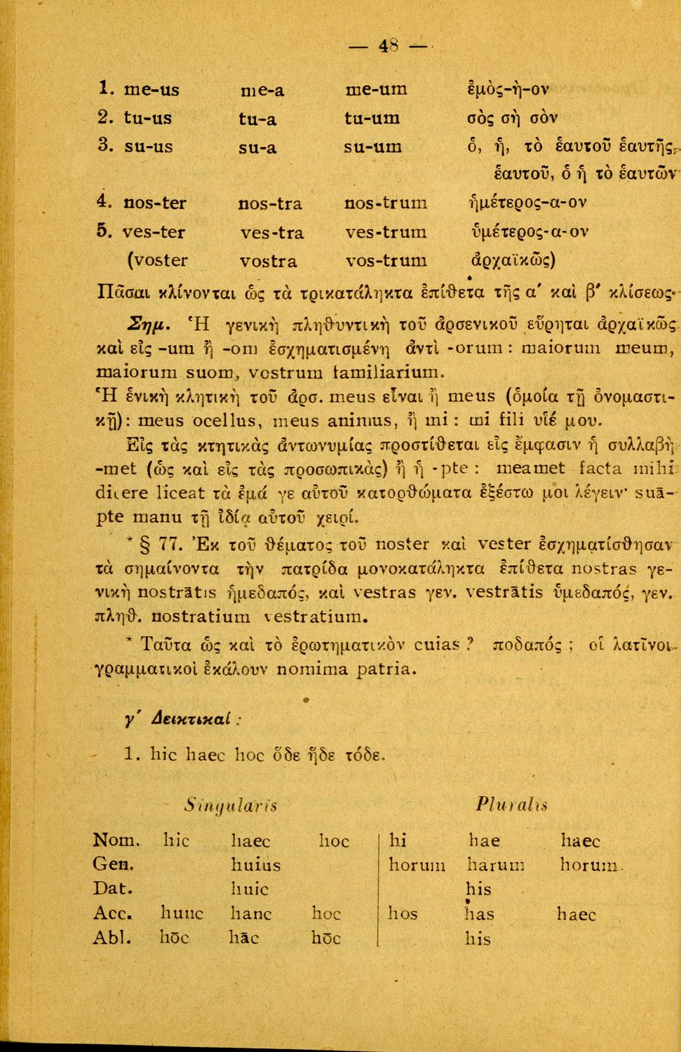 Σχολικό εγχειρίδιο Λατινικών Α΄, Β΄, Γ' Γυμνασίου που περιλαμβάνει γραμματική και συντακτικό και είναι χωρισμένο σε φθογγολογικό, τυπολογικό και ετυμολογικό μέρος.