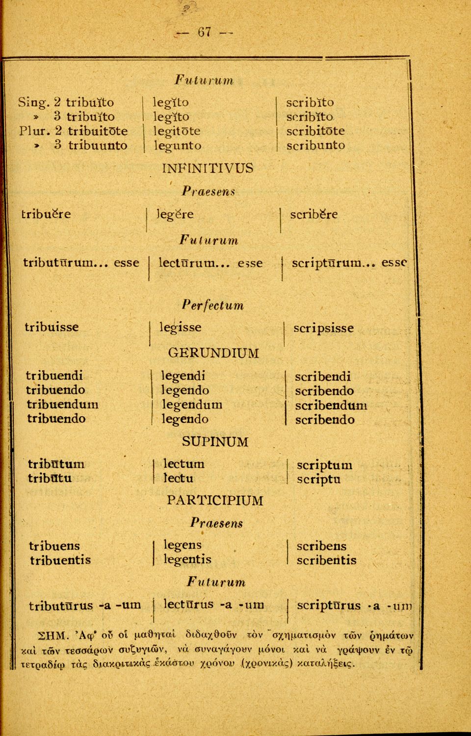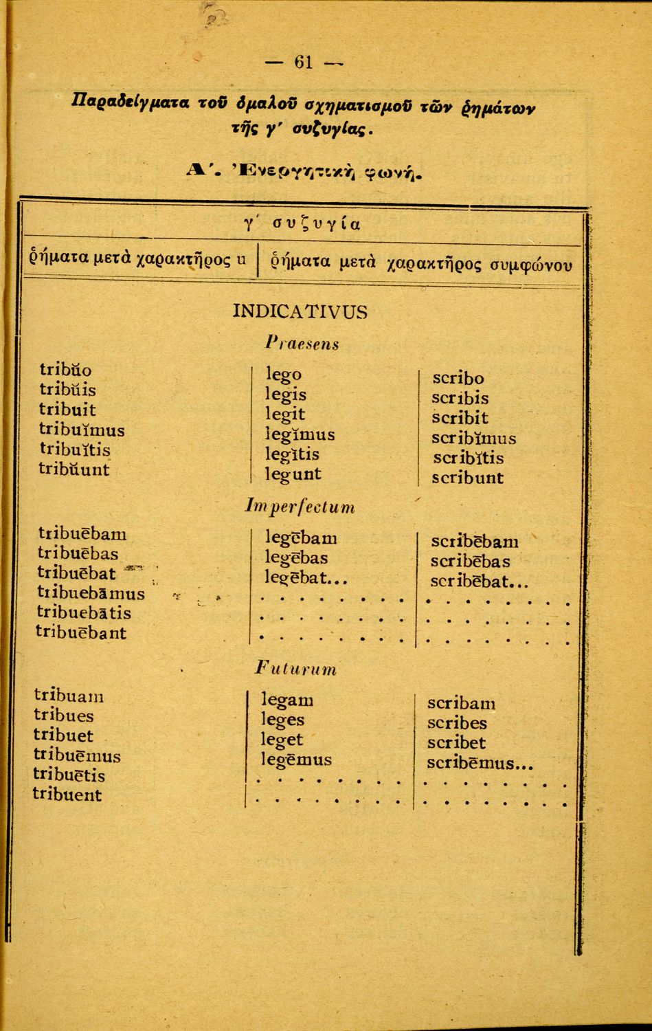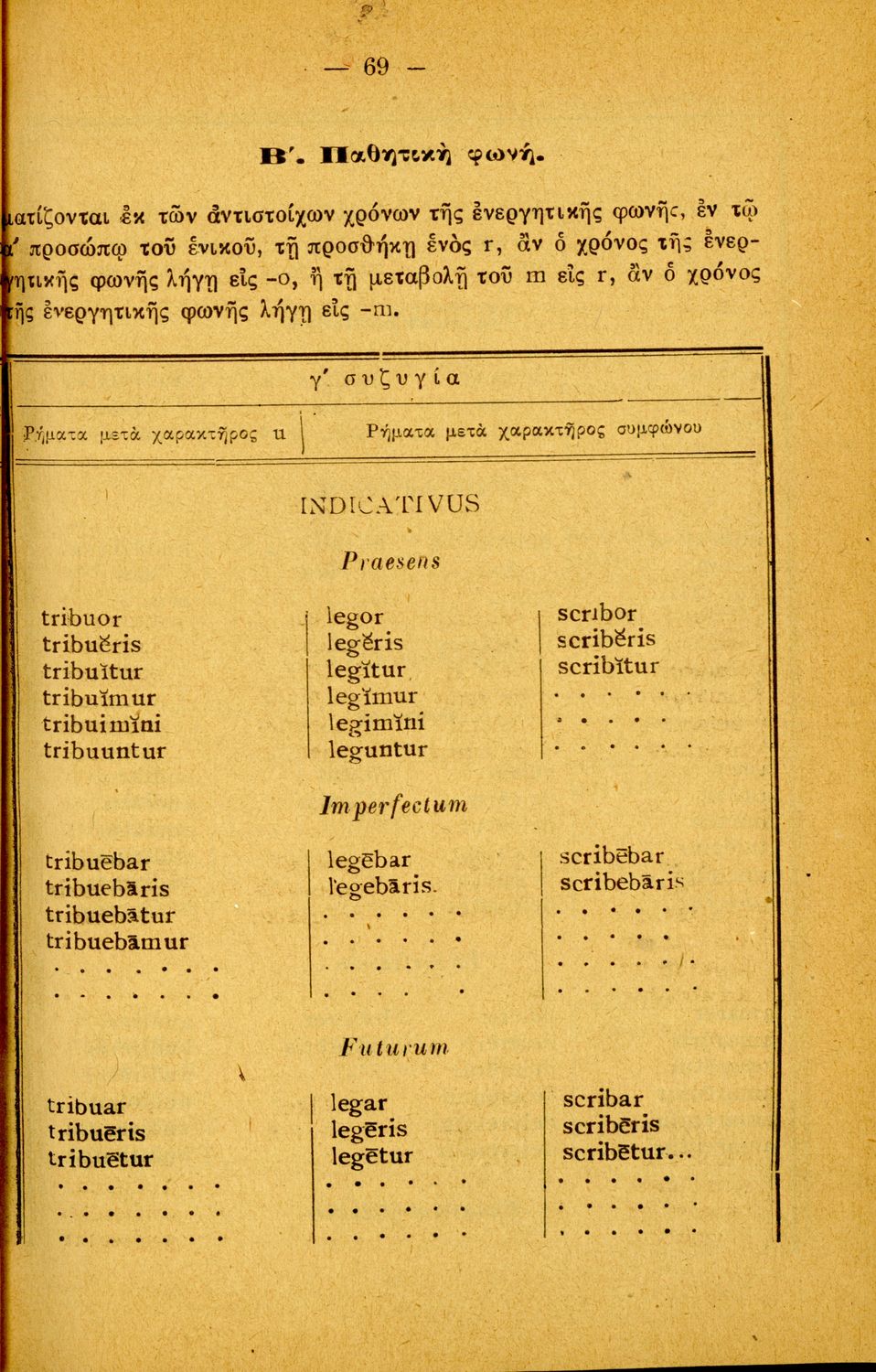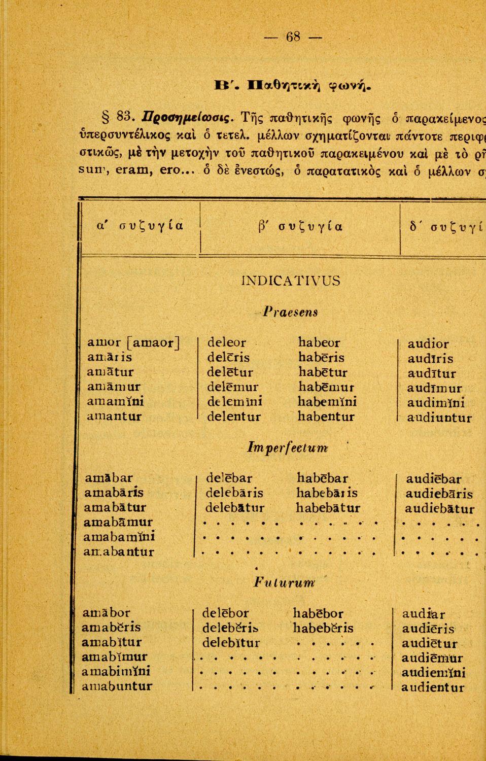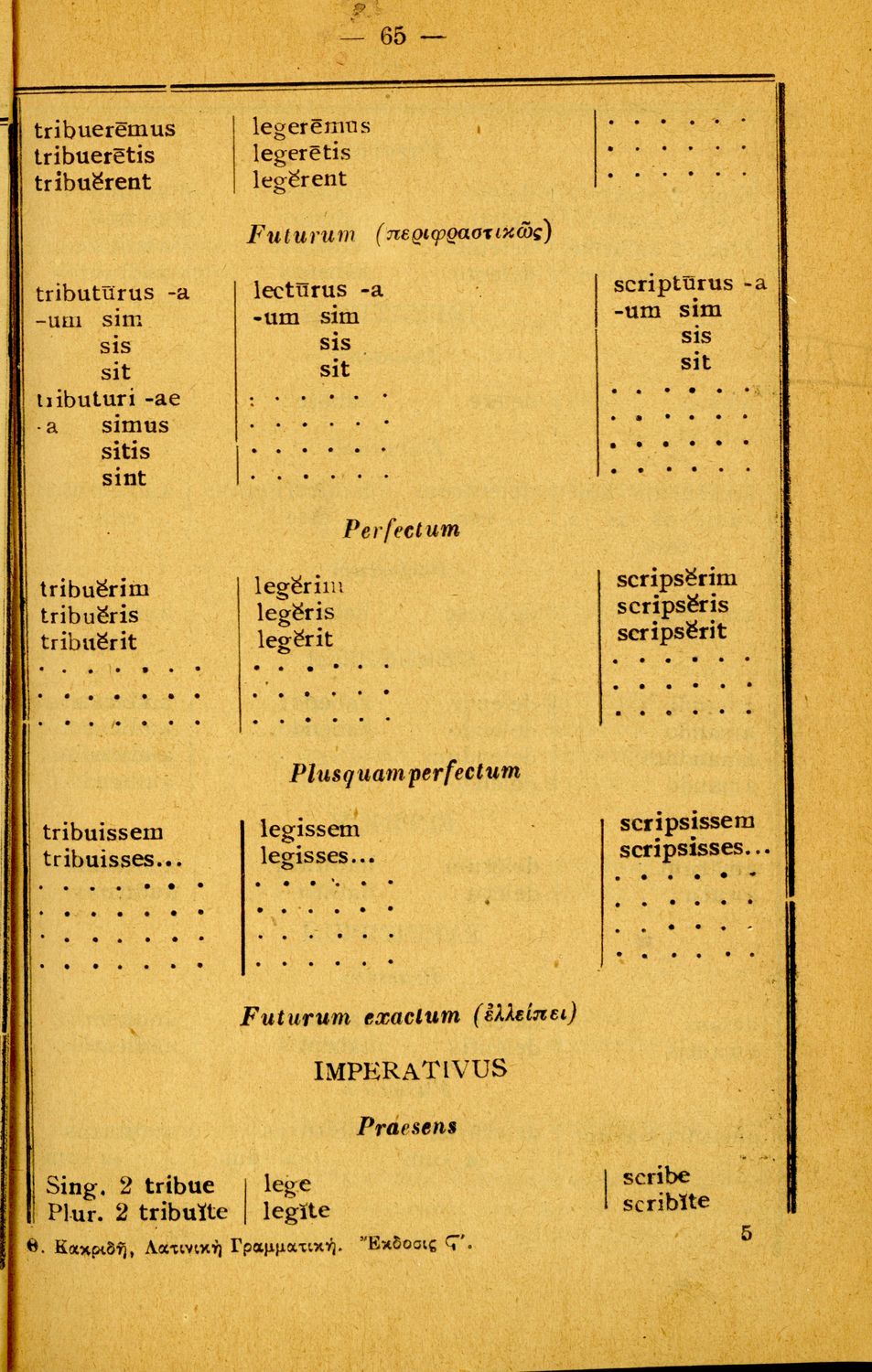 Σχολικό εγχειρίδιο Λατινικών Α΄, Β΄, Γ' Γυμνασίου που περιλαμβάνει γραμματική και συντακτικό και είναι χωρισμένο σε φθογγολογικό, τυπολογικό και ετυμολογικό μέρος.