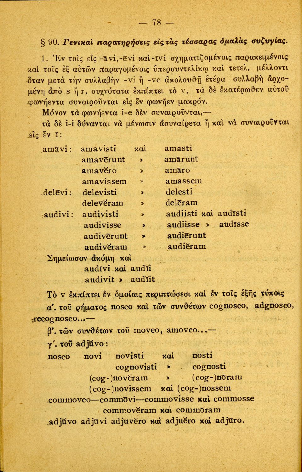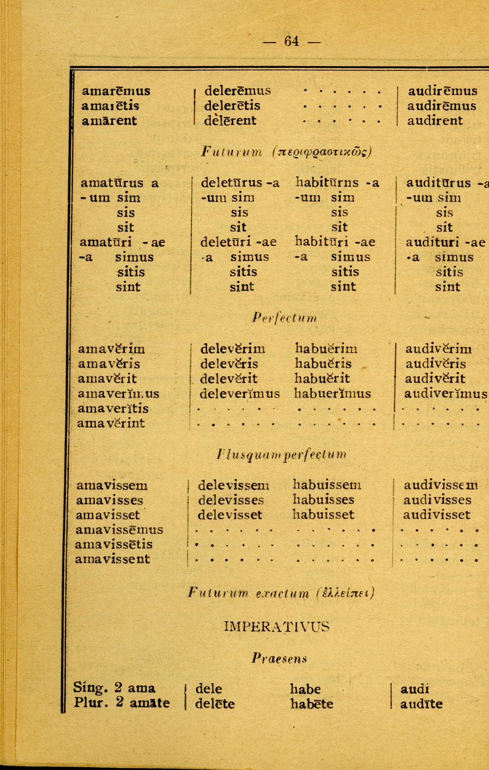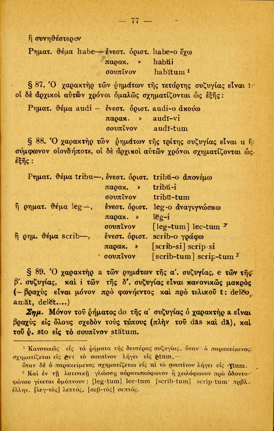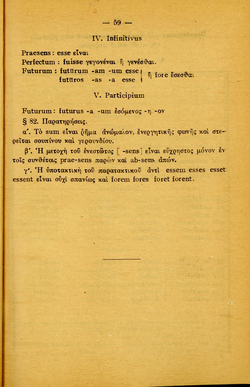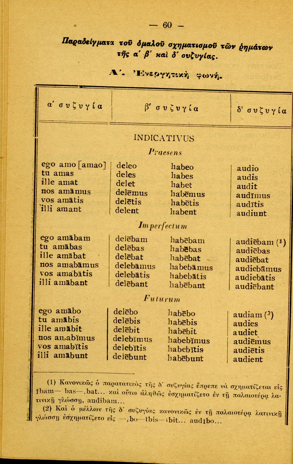 Σχολικό εγχειρίδιο Λατινικών Α΄, Β΄, Γ' Γυμνασίου που περιλαμβάνει γραμματική και συντακτικό και είναι χωρισμένο σε φθογγολογικό, τυπολογικό και ετυμολογικό μέρος.