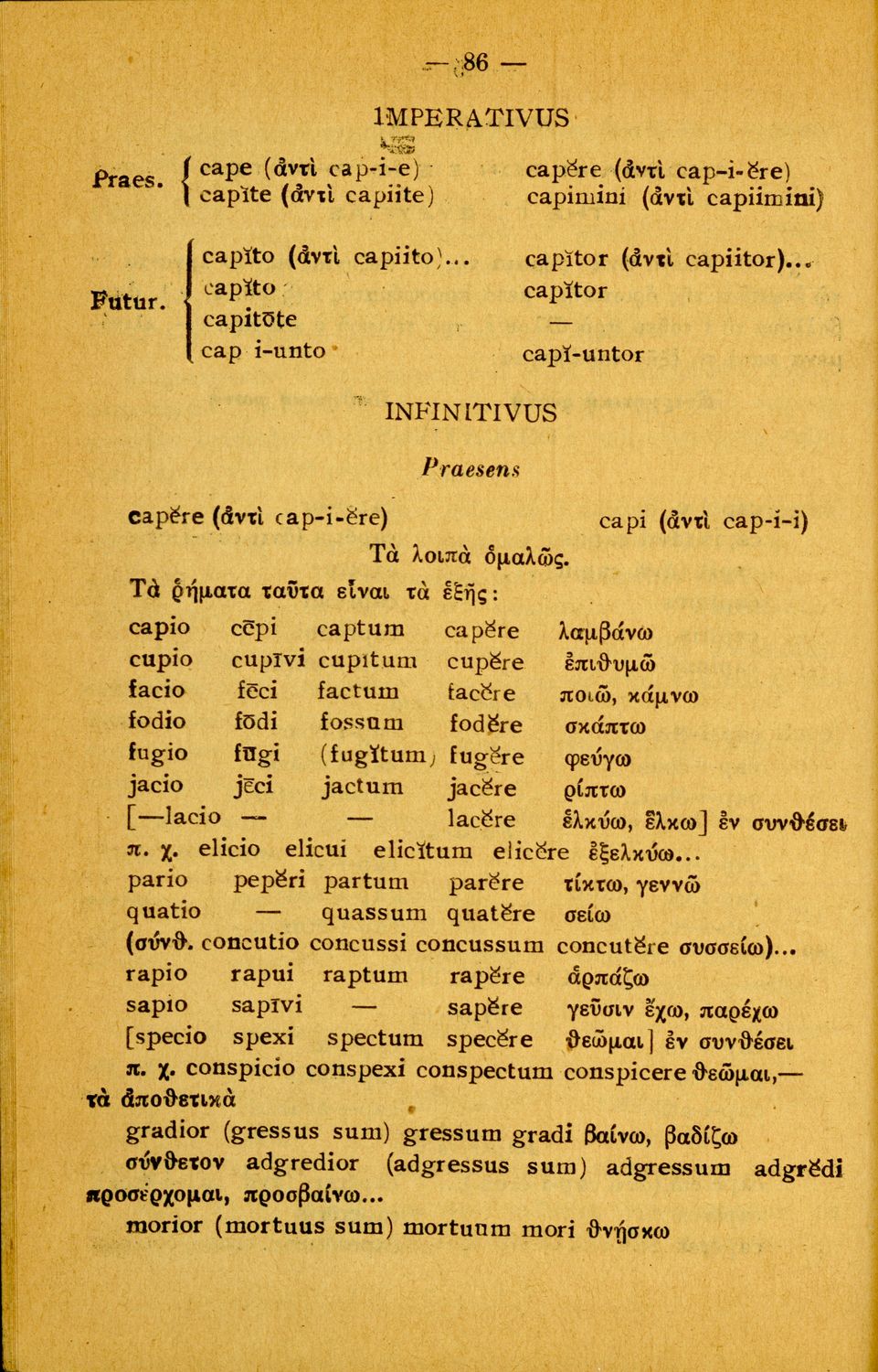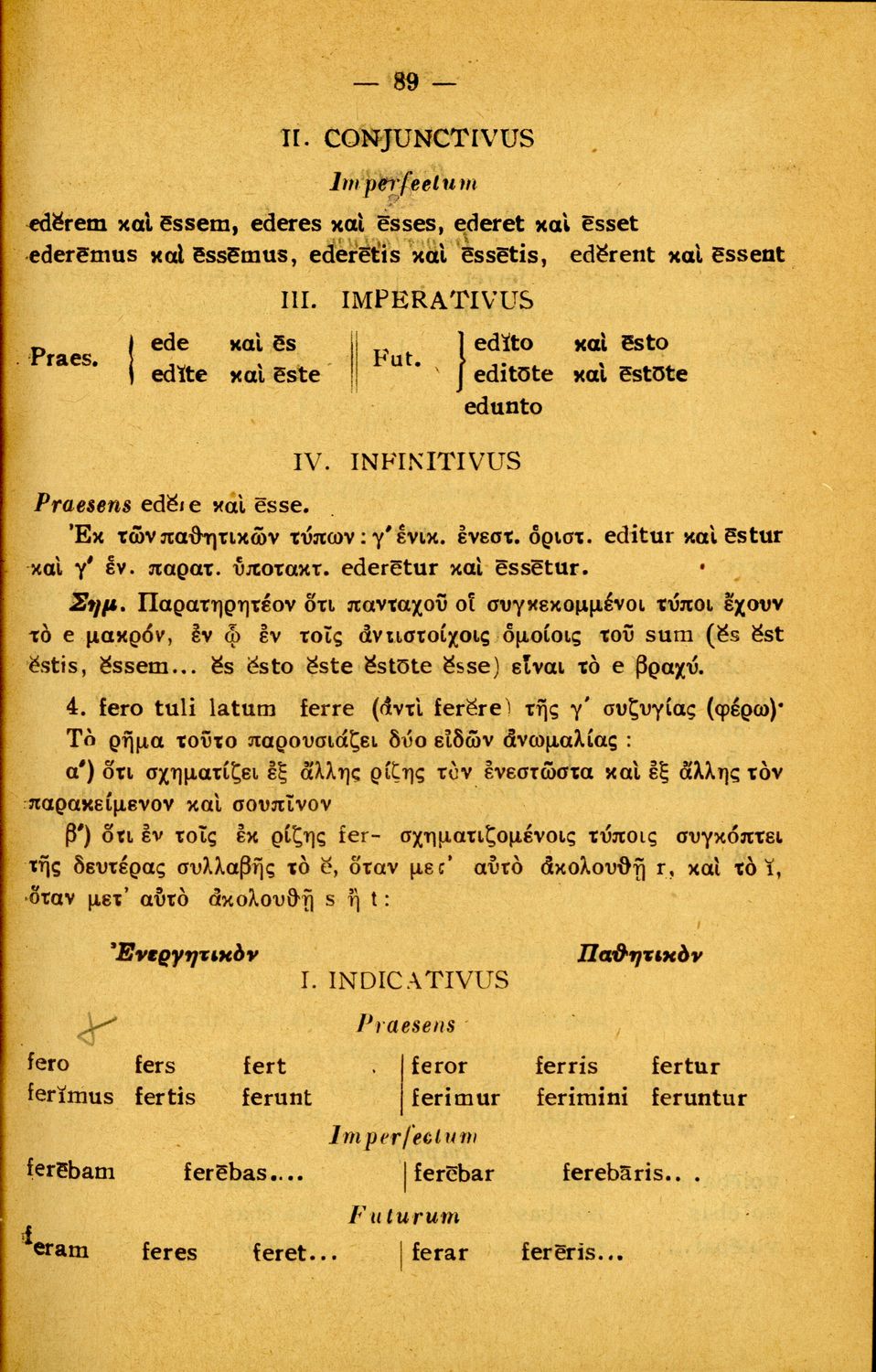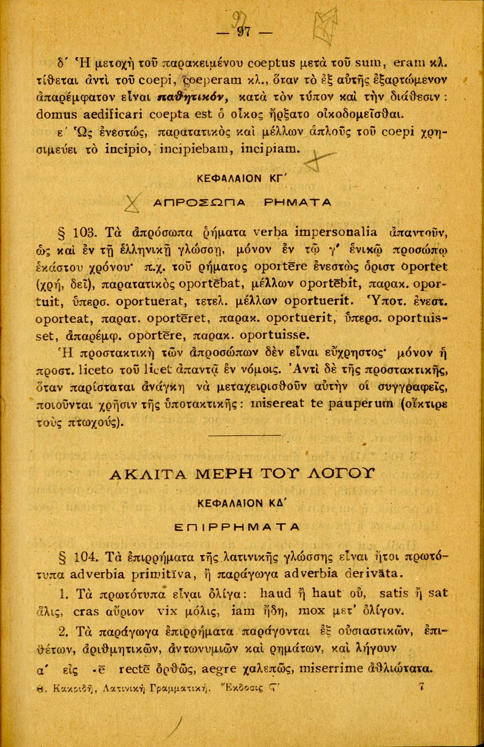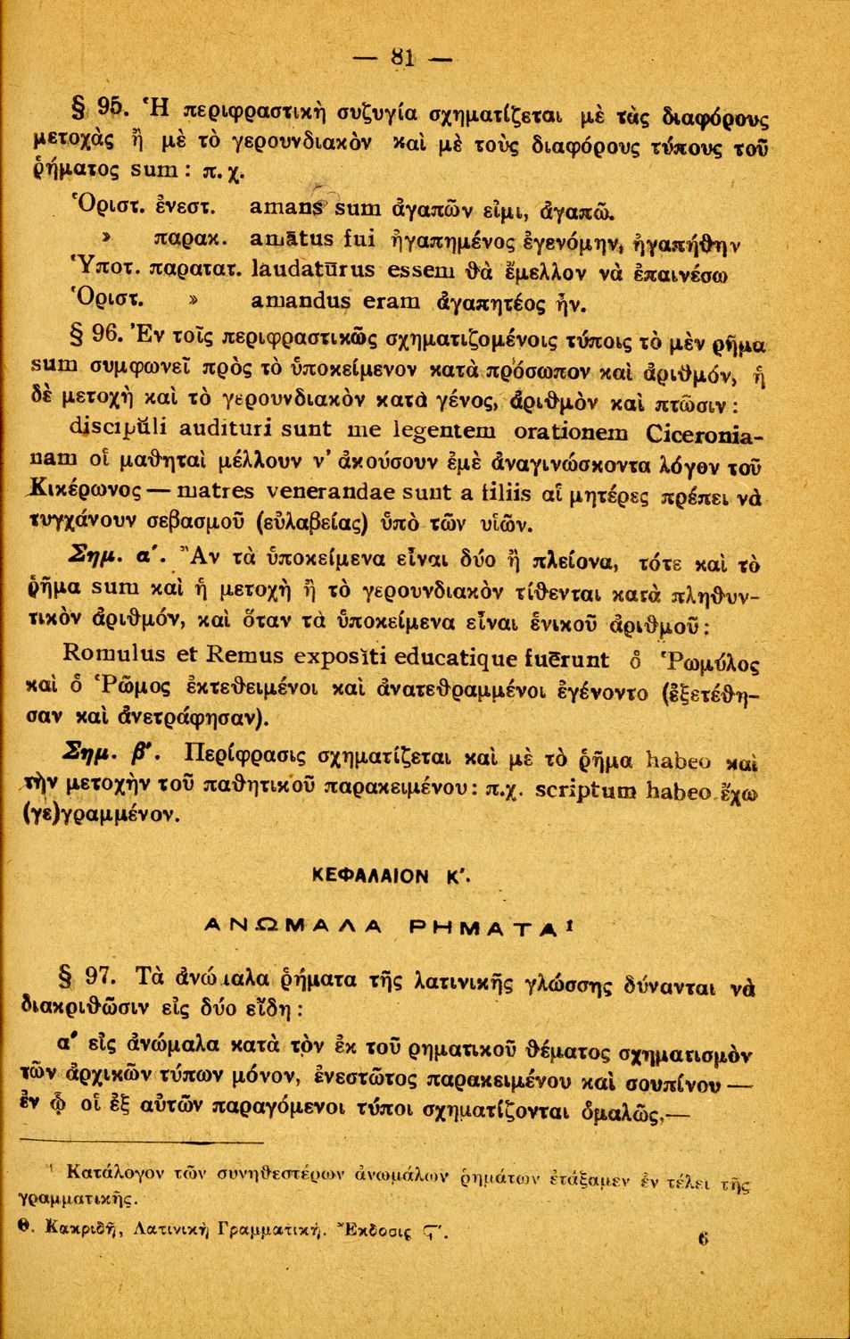 Σχολικό εγχειρίδιο Λατινικών Α΄, Β΄, Γ' Γυμνασίου που περιλαμβάνει γραμματική και συντακτικό και είναι χωρισμένο σε φθογγολογικό, τυπολογικό και ετυμολογικό μέρος.