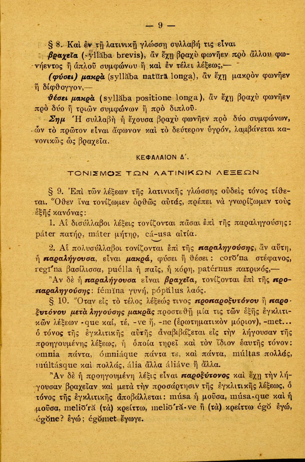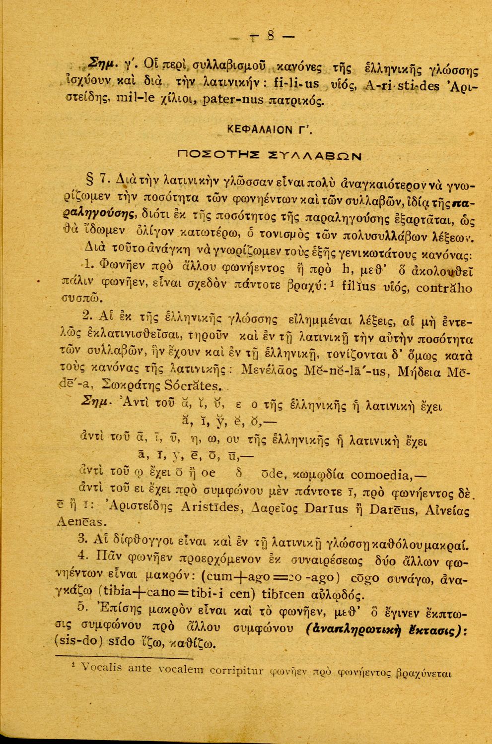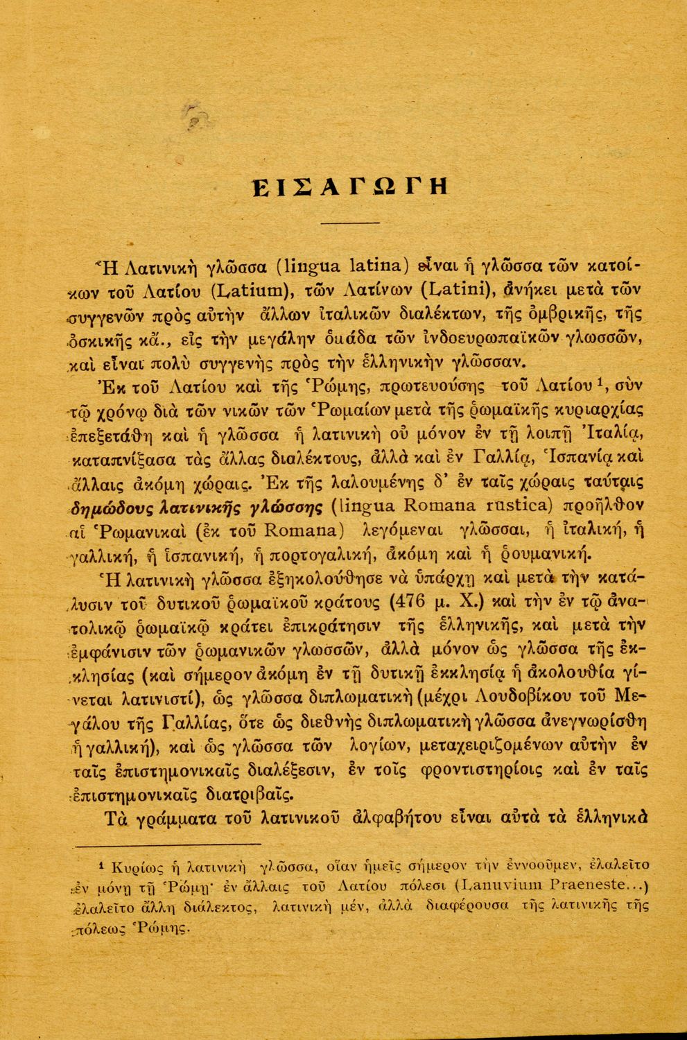 Σχολικό εγχειρίδιο Λατινικών Α΄, Β΄, Γ' Γυμνασίου που περιλαμβάνει γραμματική και συντακτικό και είναι χωρισμένο σε φθογγολογικό, τυπολογικό και ετυμολογικό μέρος.