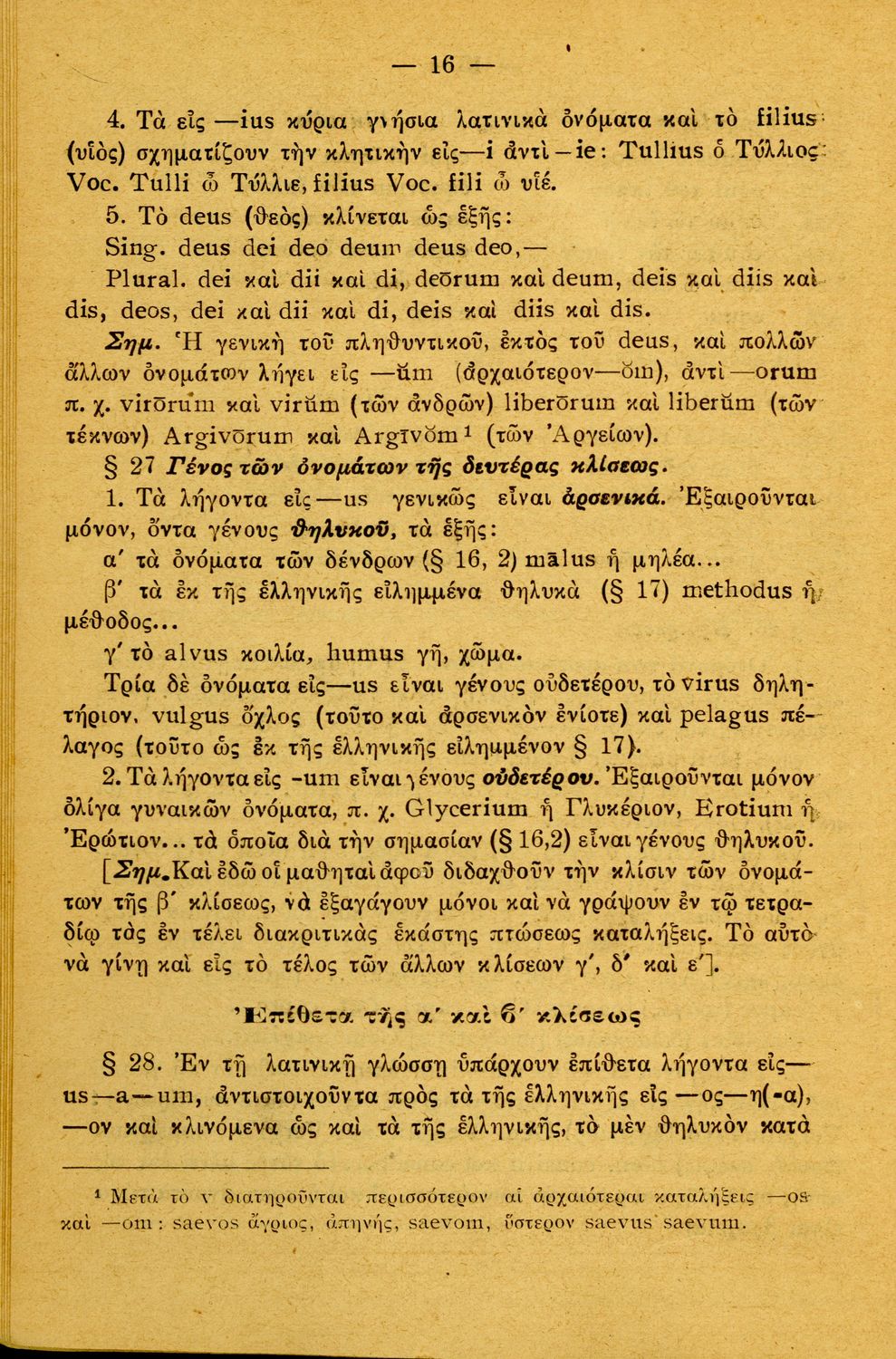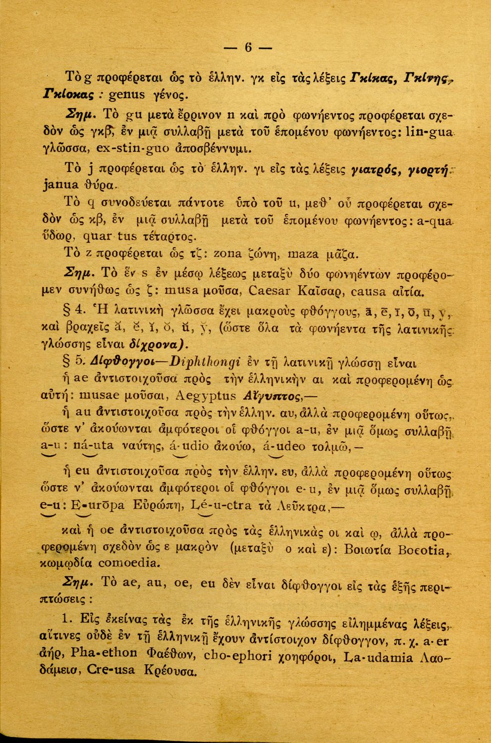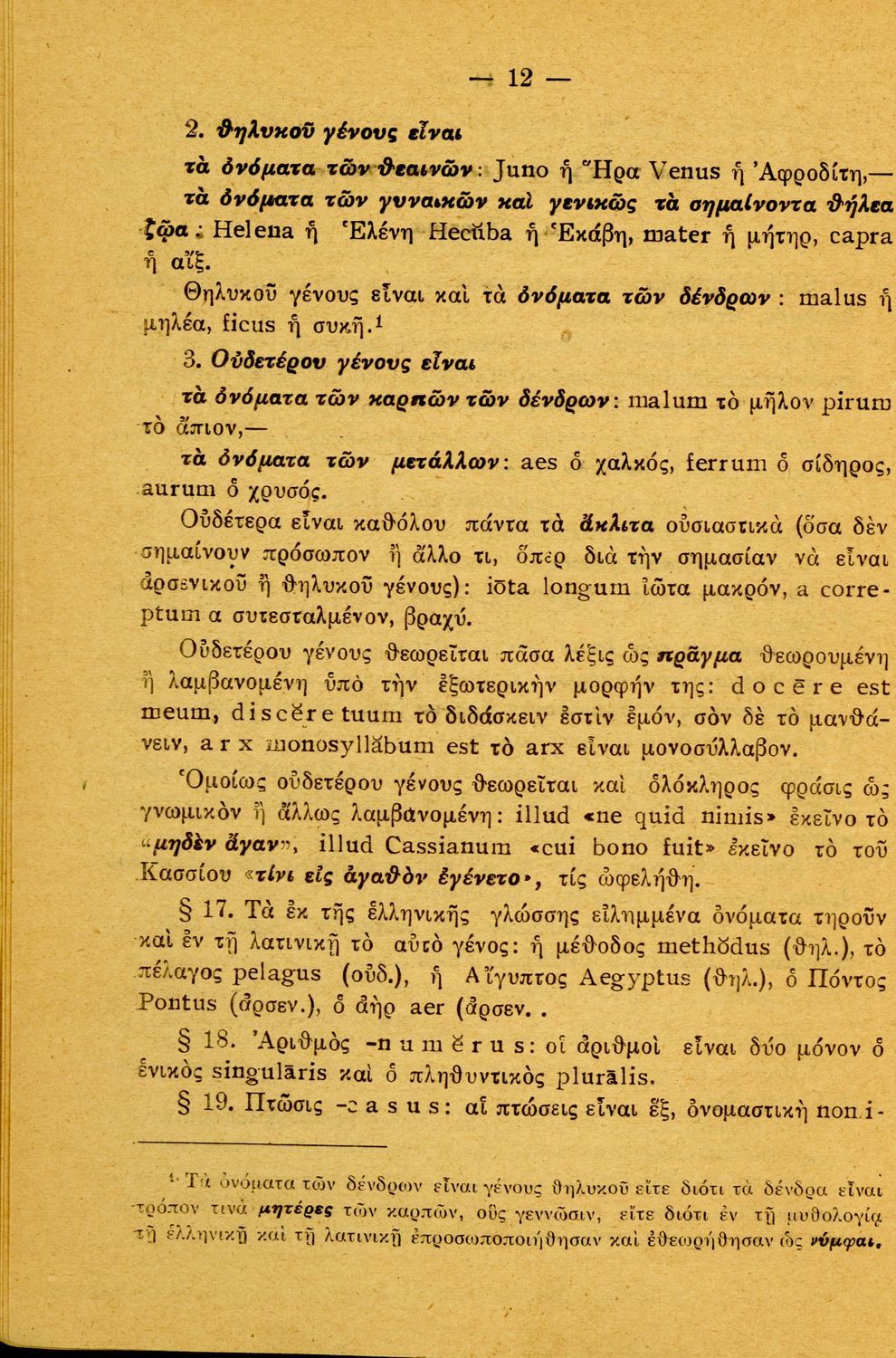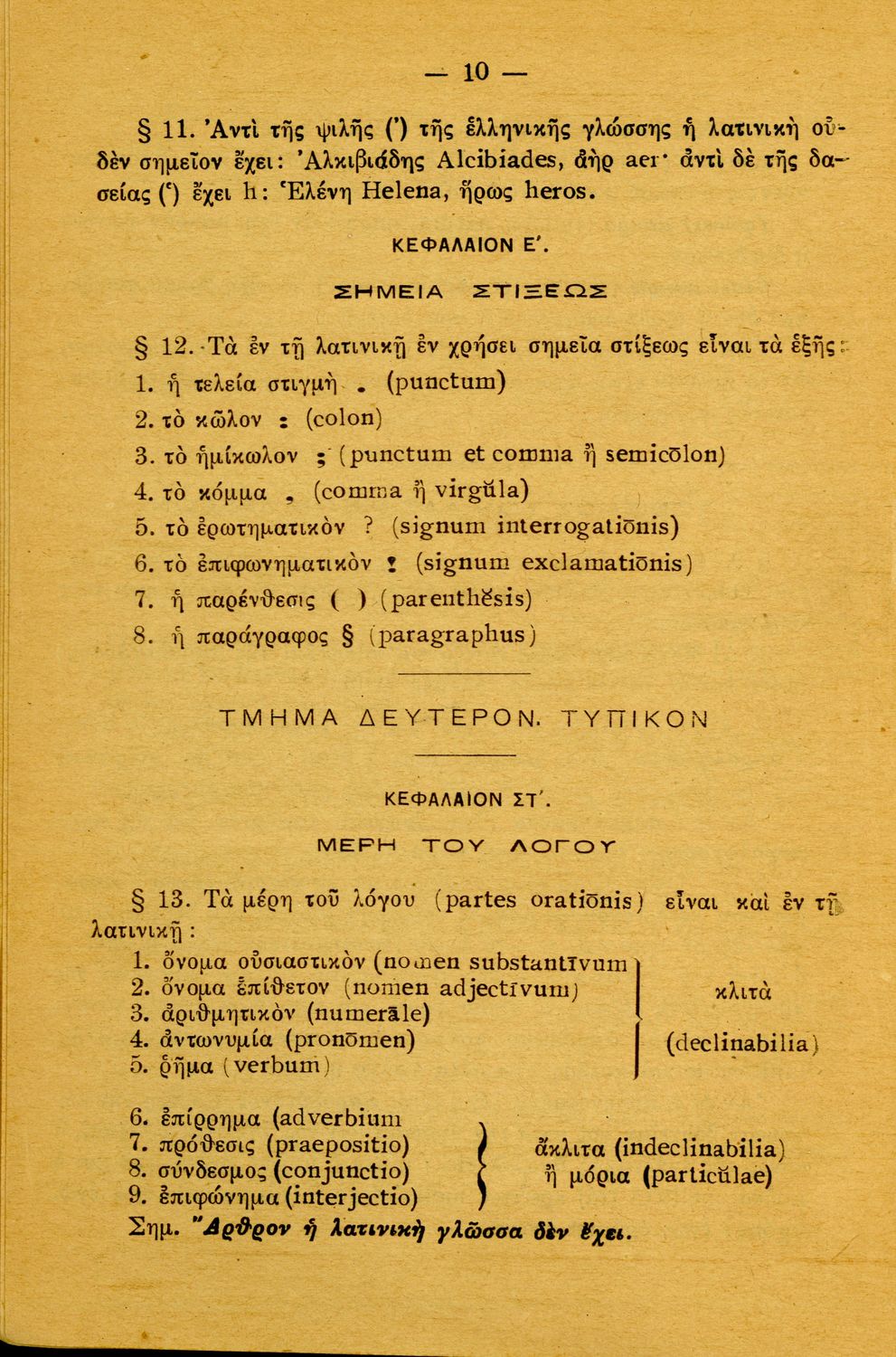 Σχολικό εγχειρίδιο Λατινικών Α΄, Β΄, Γ' Γυμνασίου που περιλαμβάνει γραμματική και συντακτικό και είναι χωρισμένο σε φθογγολογικό, τυπολογικό και ετυμολογικό μέρος.