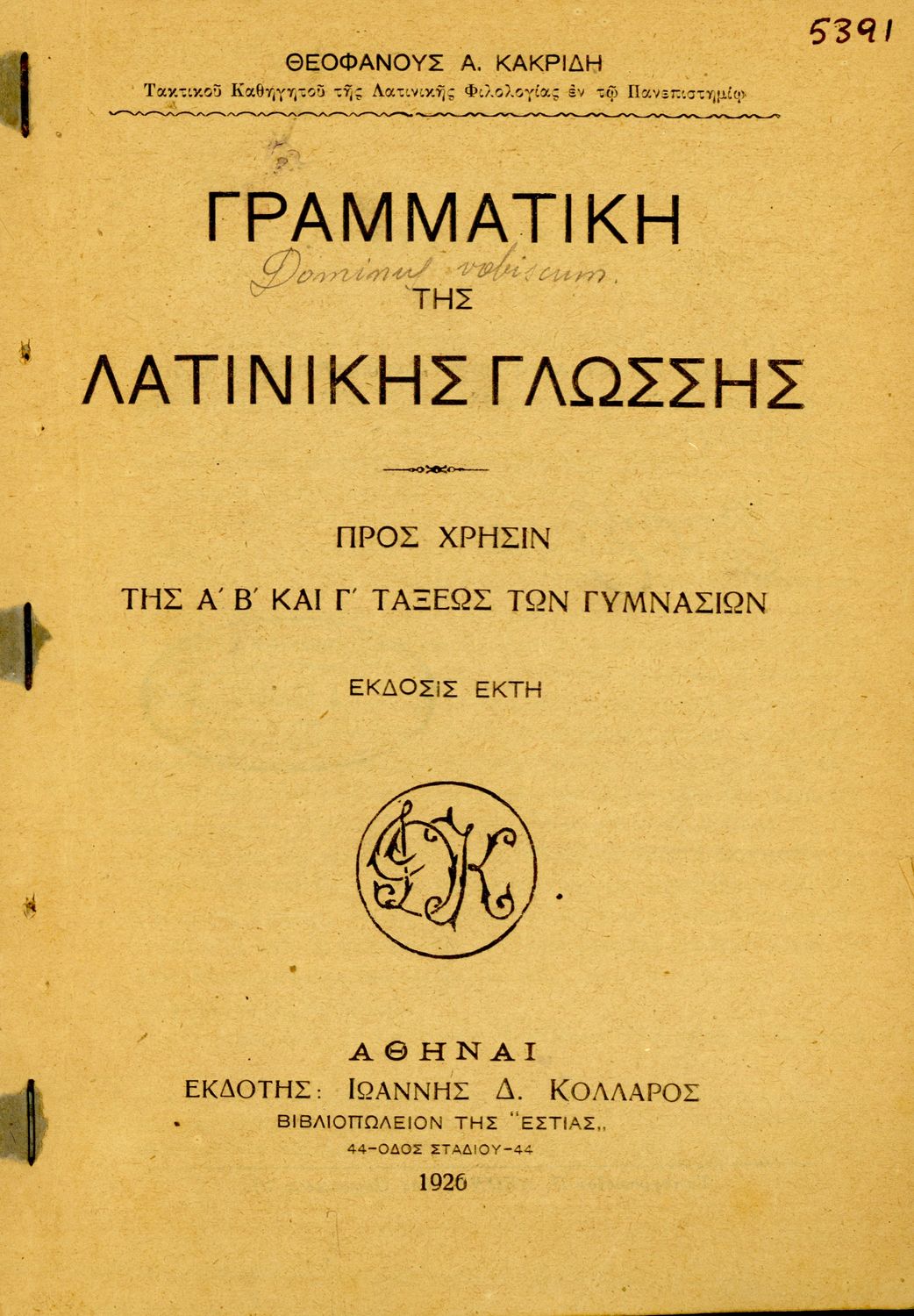 Τίτλος: Γραμματική της λατινικής γλώσσης προς χρήσιν των μαθητών της Α΄, Β΄ και Γ΄ τάξεως των Γυμνασίων
