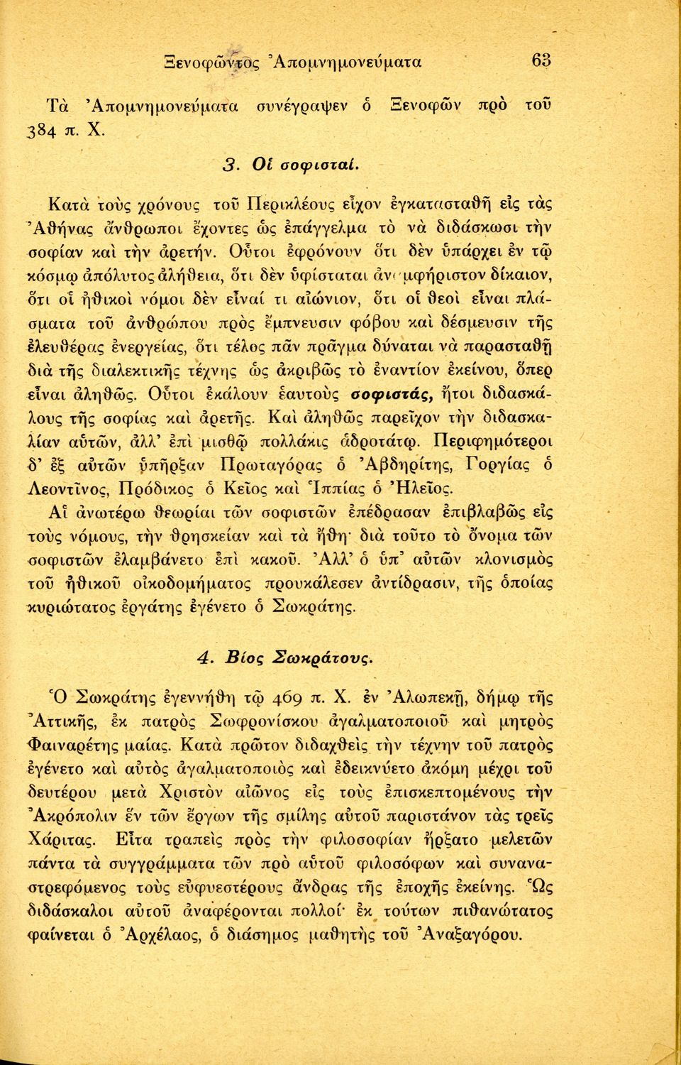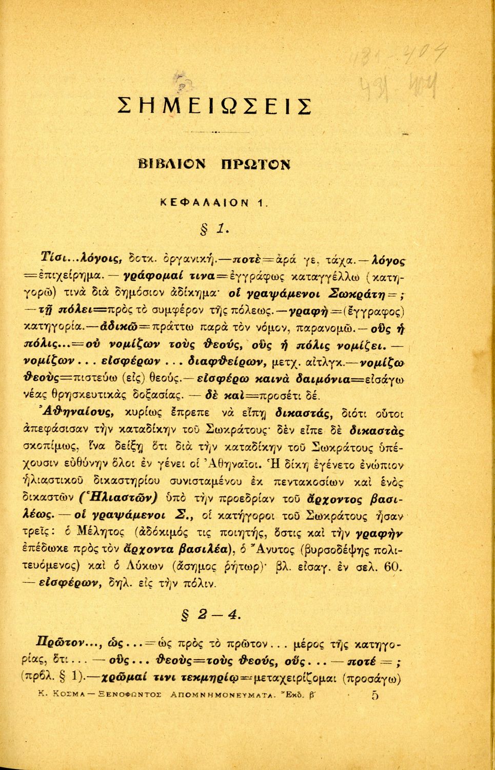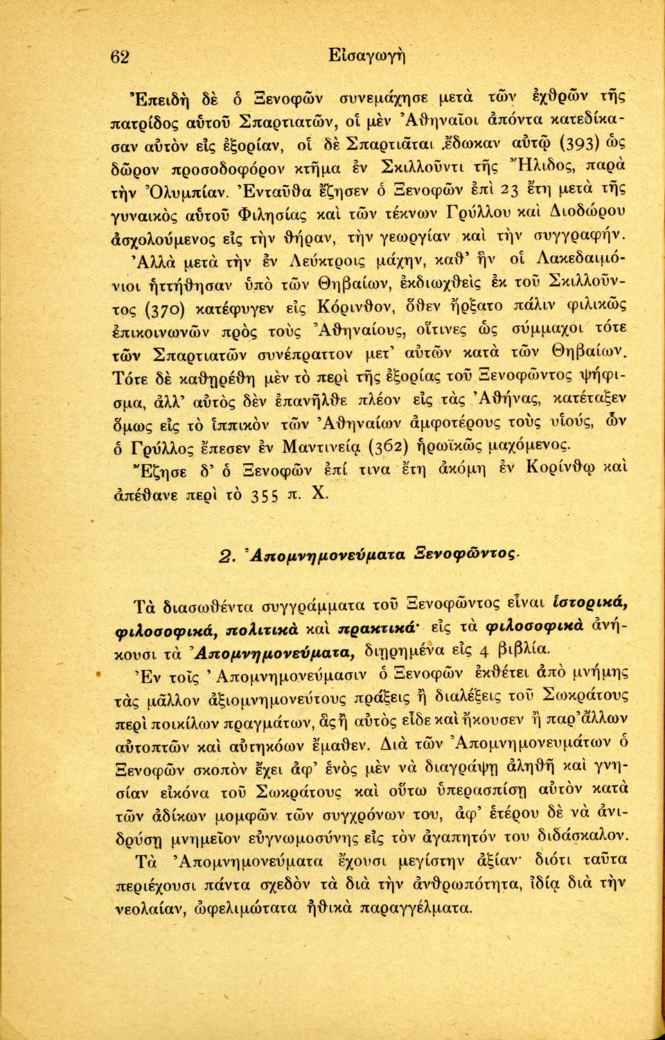 Σχολικό εγχειρίδιο Αρχαίων Ελληνικών Β΄ Γυμνασίου που περιλαμβάνει αποσπάσματα από τα Απομνημονεύματα του Ξενοφώντα, εισαγωγικά σχόλια για στη ζωή και το έργο του, ερμηνευτικές σημειώσεις και πραγματολογικά και γραμματικά σχόλια.