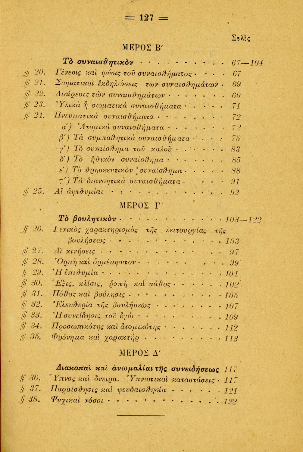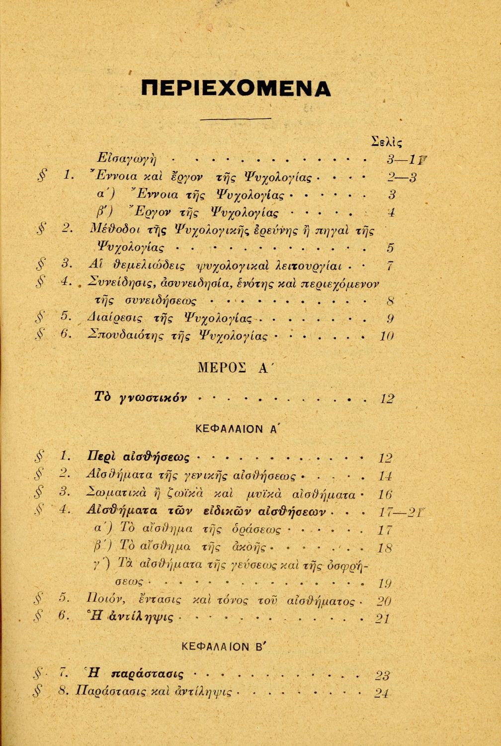 Σχολικό εγχειρίδιο Πειραματικής Ψυχολογίας για τη Γ΄ Γυμνασίου χωρισμένο σε τρία τμήματα: το παριστάναι, το συναισθάνεσθαι, και το βούλεσθαι.