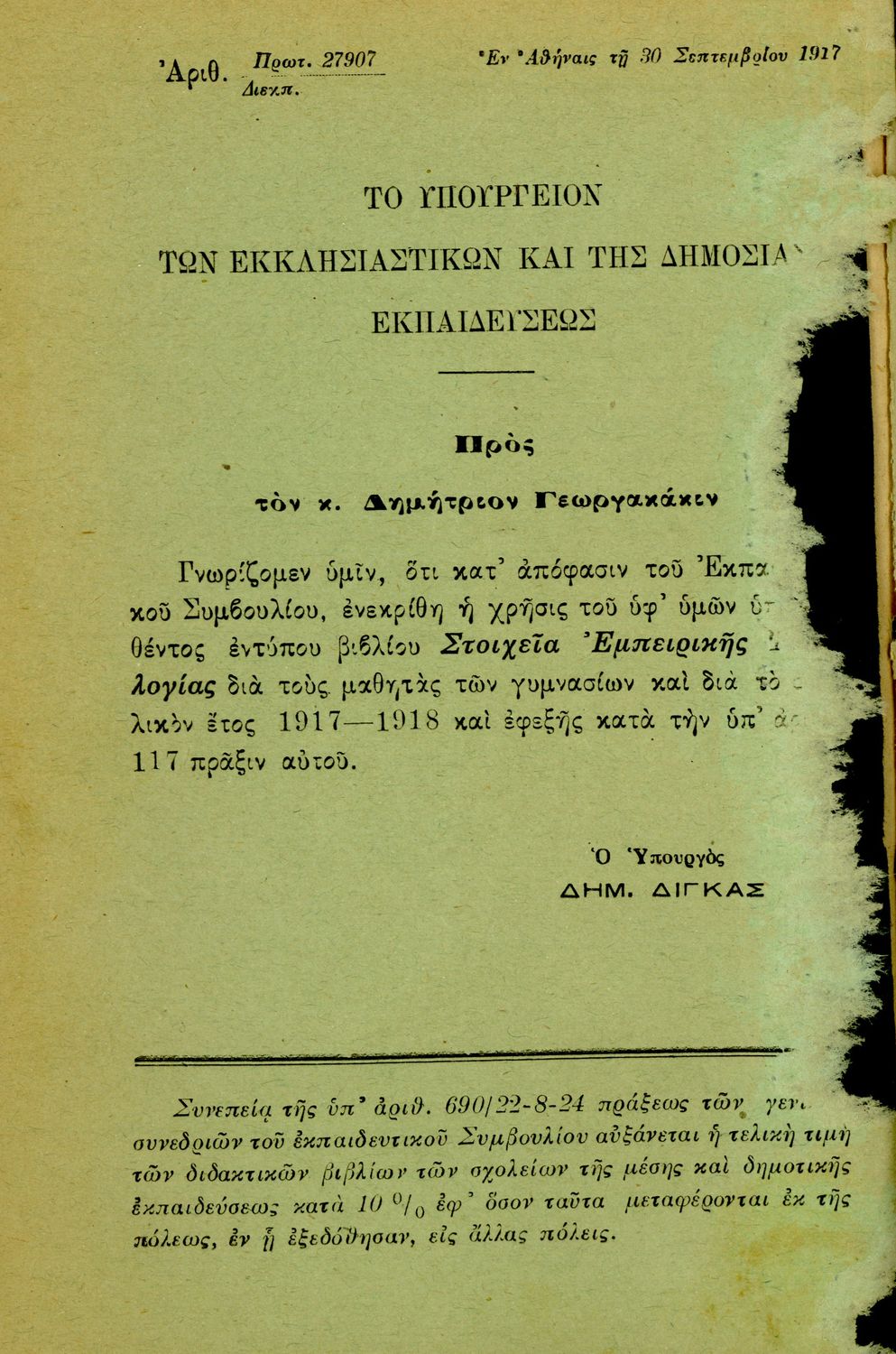 Τίτλος: Στοιχεία εμπειρικής ψυχολογίας προς χρήσιν των μαθητών της Γ΄ τάξεως των Γυμνασίων
