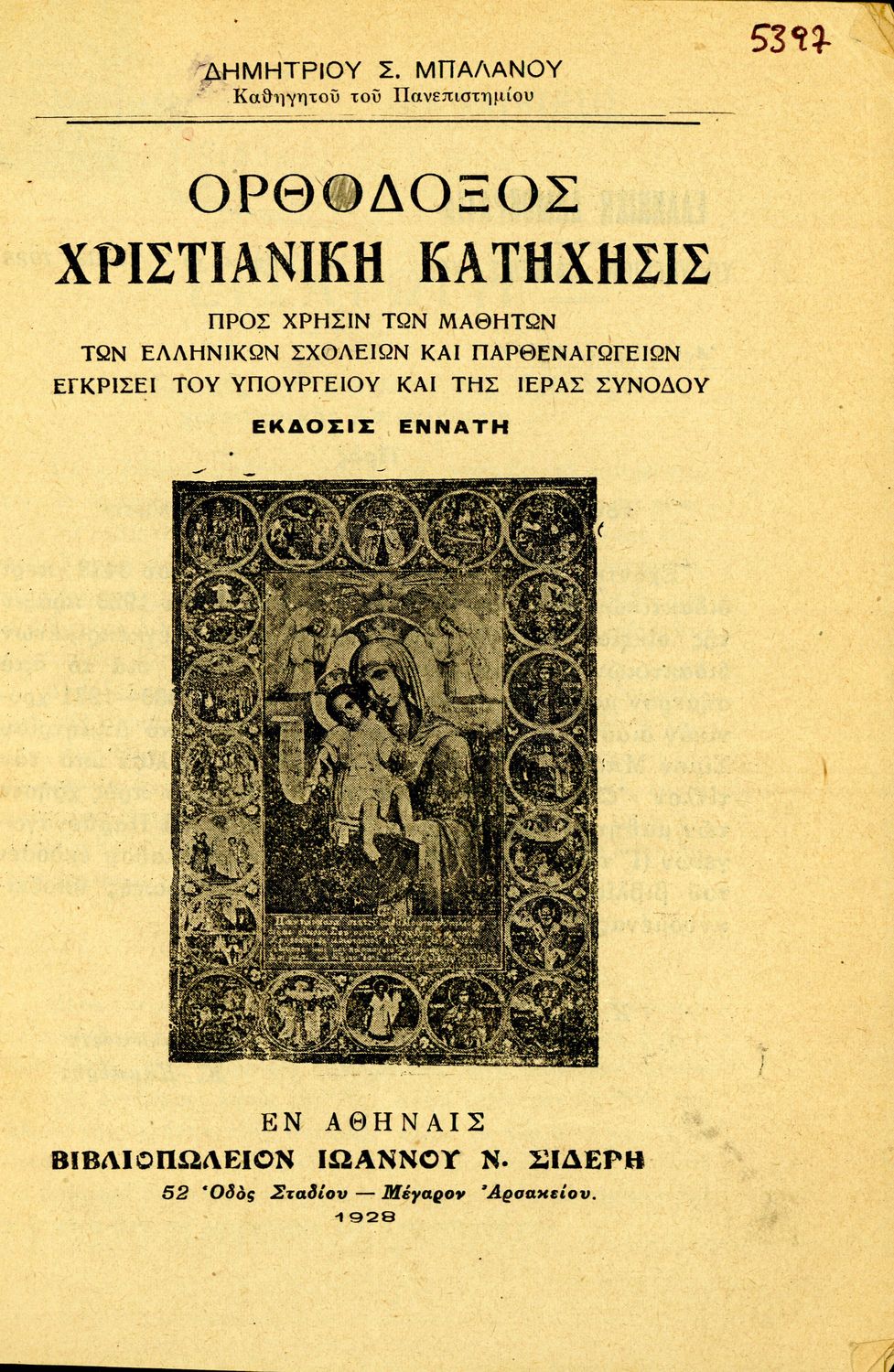 Τίτλος: Ορθόδοξος χριστιανική κατήχησις προς χρήσιν των μαθητών των Ελληνικών Σχολείων και Παρθεναγωγείων