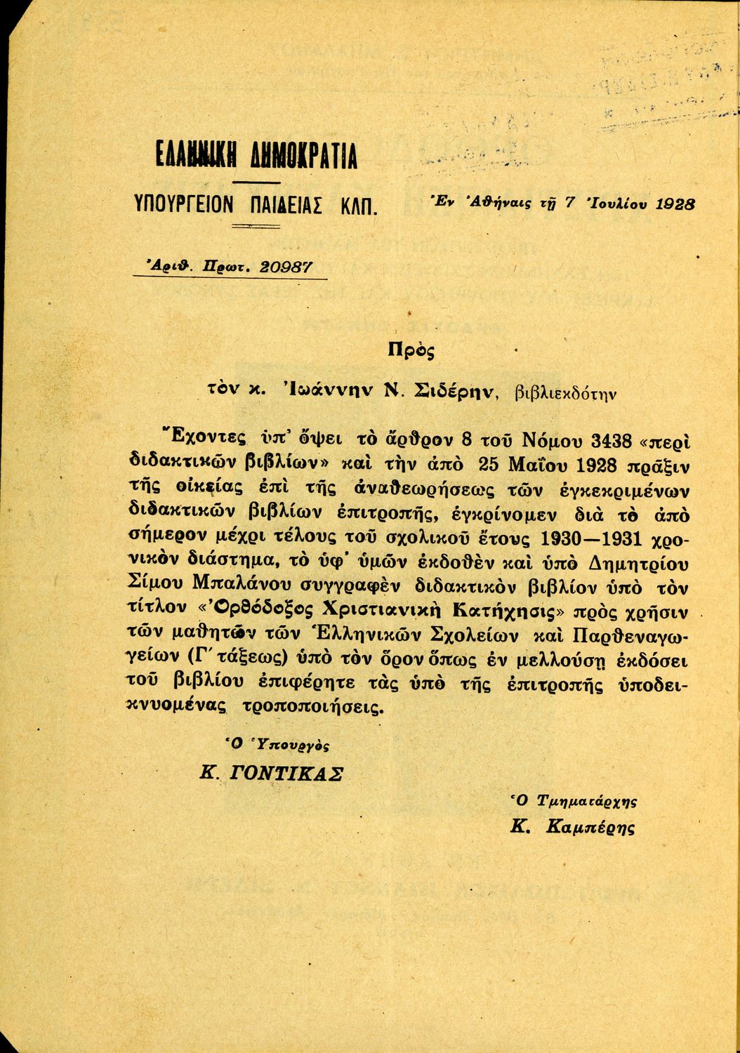 Υπουργική απόφαση / Σύμβαση: 20987/ 7-7-1928