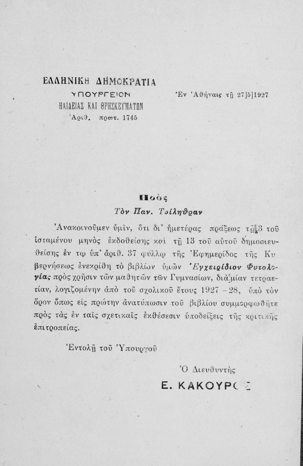 Υπουργική απόφαση / Σύμβαση: 1745/27-5-1927