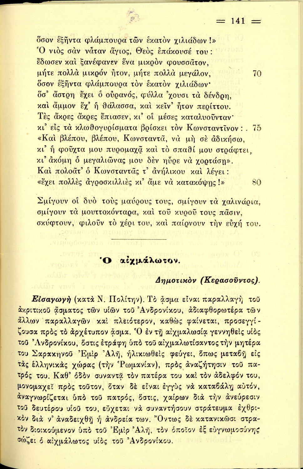 Σχολικό εγχειρίδιο Νέων Ελληνικών για την Ε΄ Εξαταξίου Γυμνασίου που περιλαμβάνει ποιήματα και πεζά Ελλήνων συγγραφέων εμπνευσμένα από την σύγχρονη ελληνική ιστορία, την ελληνική μυθολογία, τη βυζαντινή ιστορία, και τις ανθρώπινες αξίες και ελαττώματα. Περιέχει και παράρτημα με βιογραφίες των συγγραφέων και λεξιλόγιο.