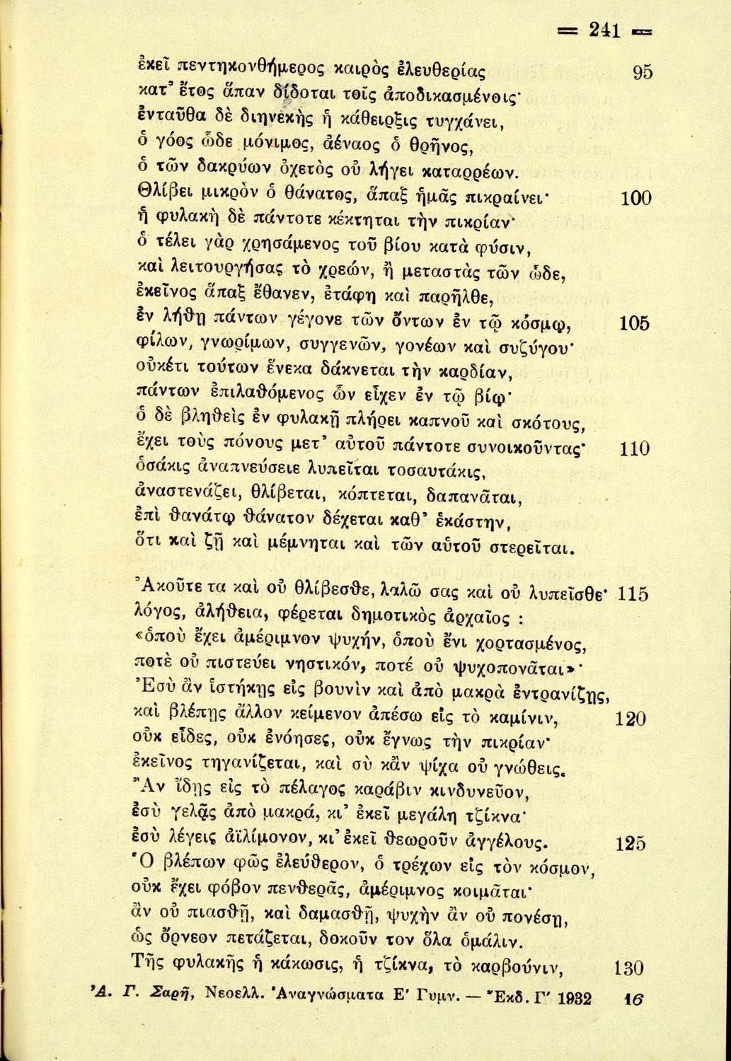 Σχολικό εγχειρίδιο Νέων Ελληνικών για την Ε΄ Εξαταξίου Γυμνασίου που περιλαμβάνει ποιήματα και πεζά Ελλήνων συγγραφέων εμπνευσμένα από την σύγχρονη ελληνική ιστορία, την ελληνική μυθολογία, τη βυζαντινή ιστορία, και τις ανθρώπινες αξίες και ελαττώματα. Περιέχει και παράρτημα με βιογραφίες των συγγραφέων και λεξιλόγιο.