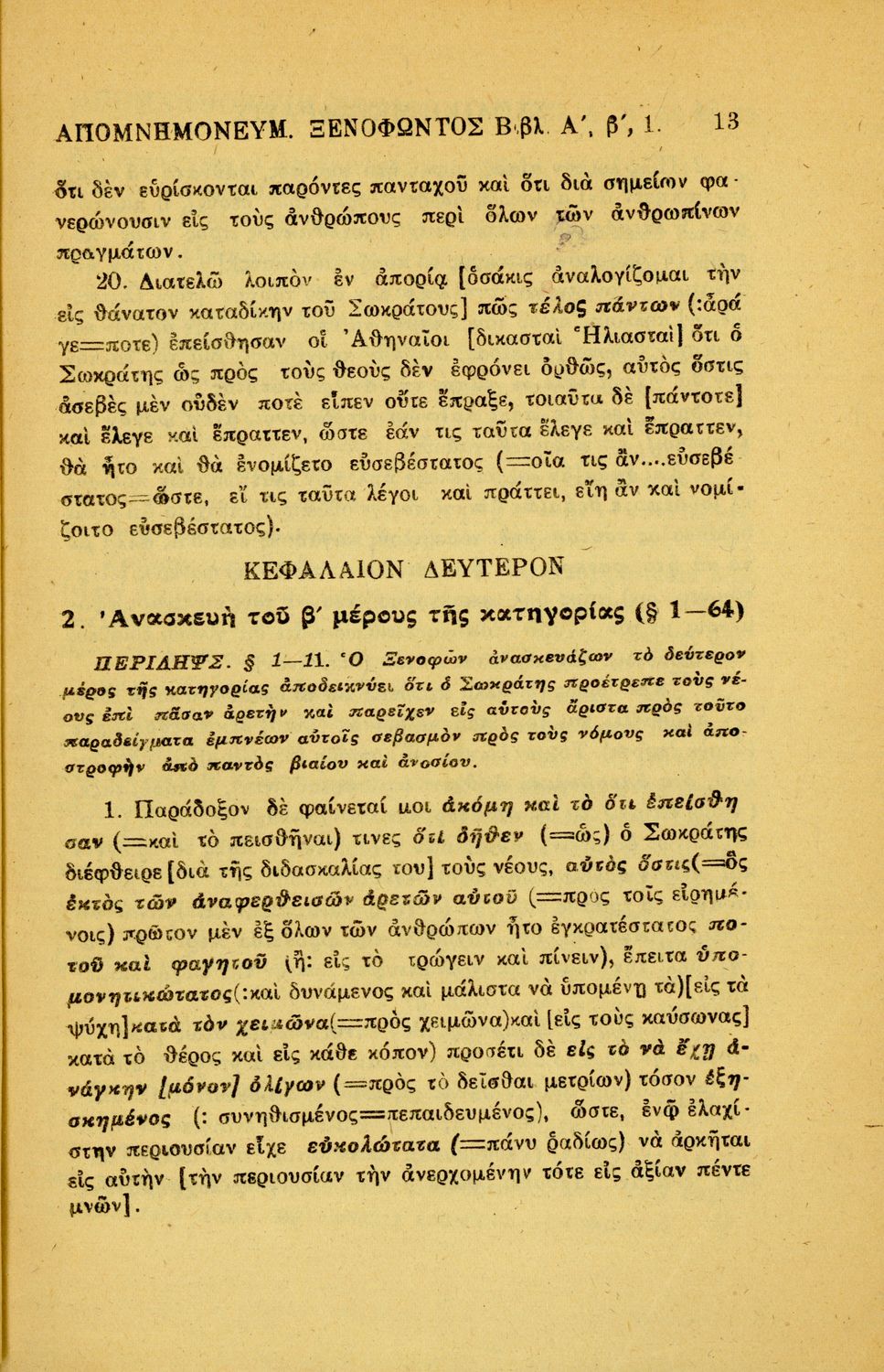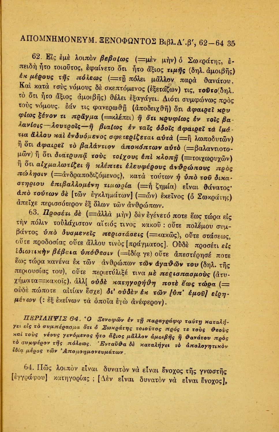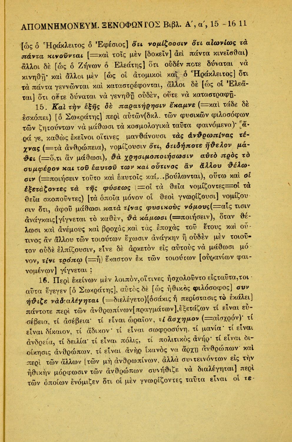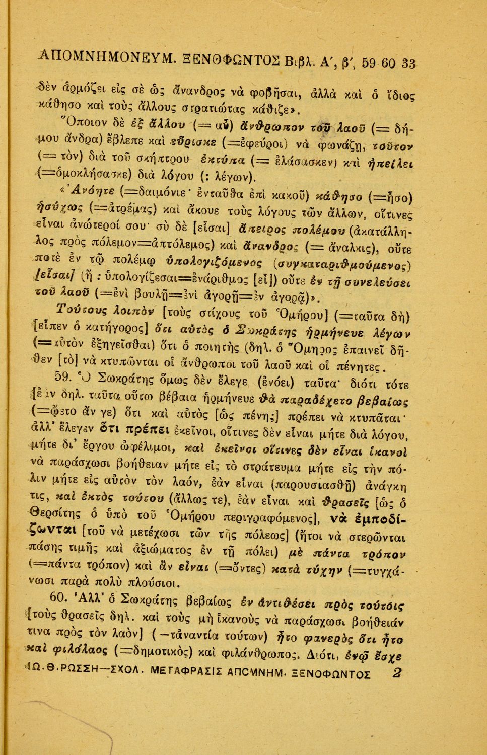 Μαθητικό βοήθημα Β΄ Τετραταξίου Γυμνασίου που περιλαμβάνει την μετάφραση αποσπασμάτων από το έργο του Ξενοφώντα Απομνημονεύματα και πραγματολογικά, γραμματικά και λεξιλογικά σχόλια.