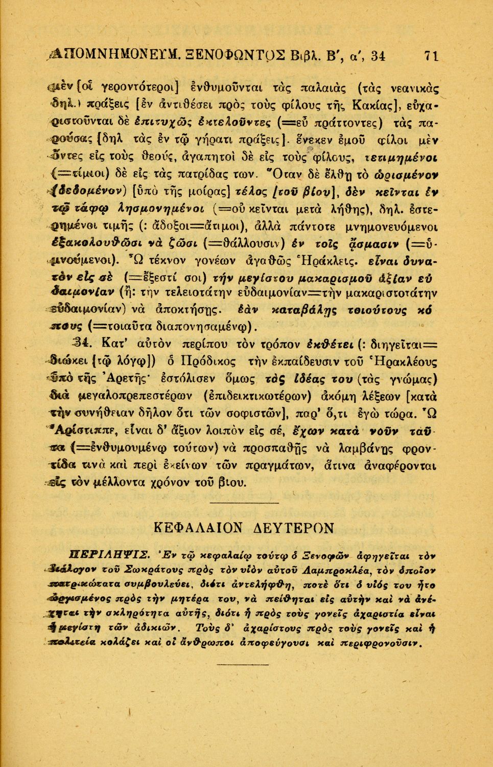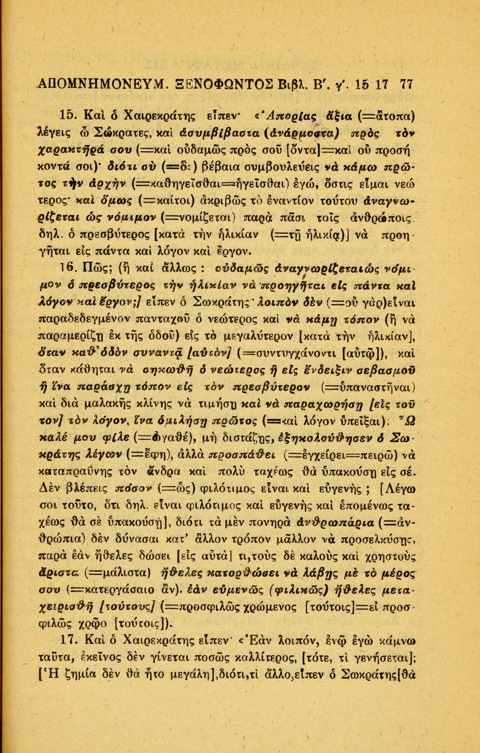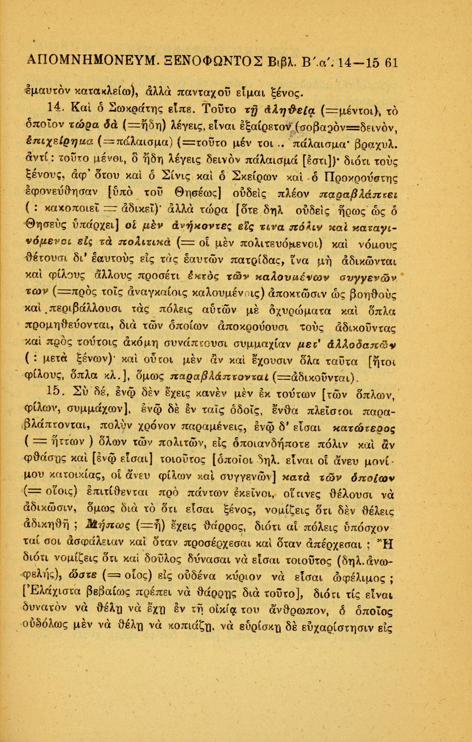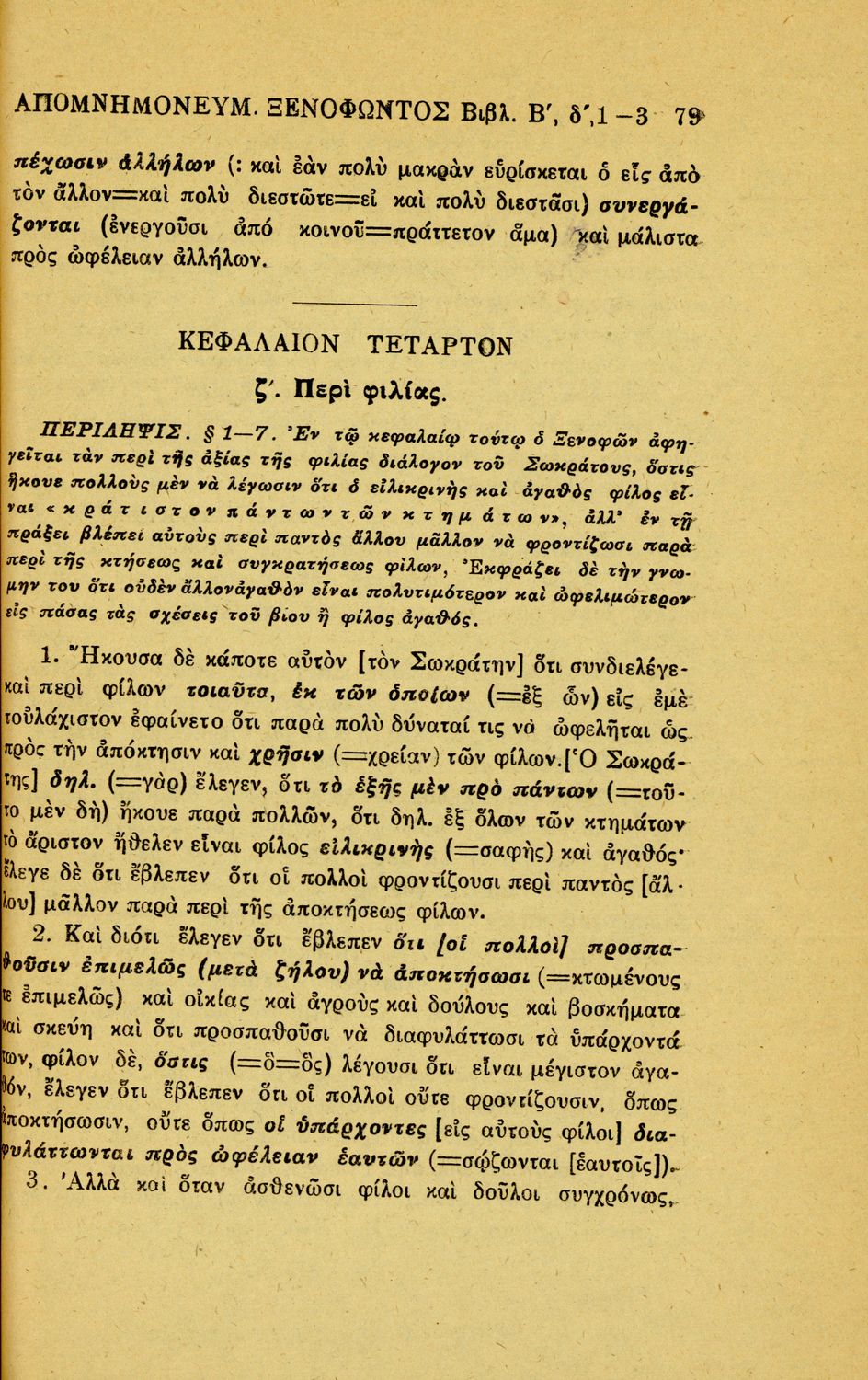 Μαθητικό βοήθημα Β΄ Τετραταξίου Γυμνασίου που περιλαμβάνει την μετάφραση αποσπασμάτων από το έργο του Ξενοφώντα Απομνημονεύματα και πραγματολογικά, γραμματικά και λεξιλογικά σχόλια.
