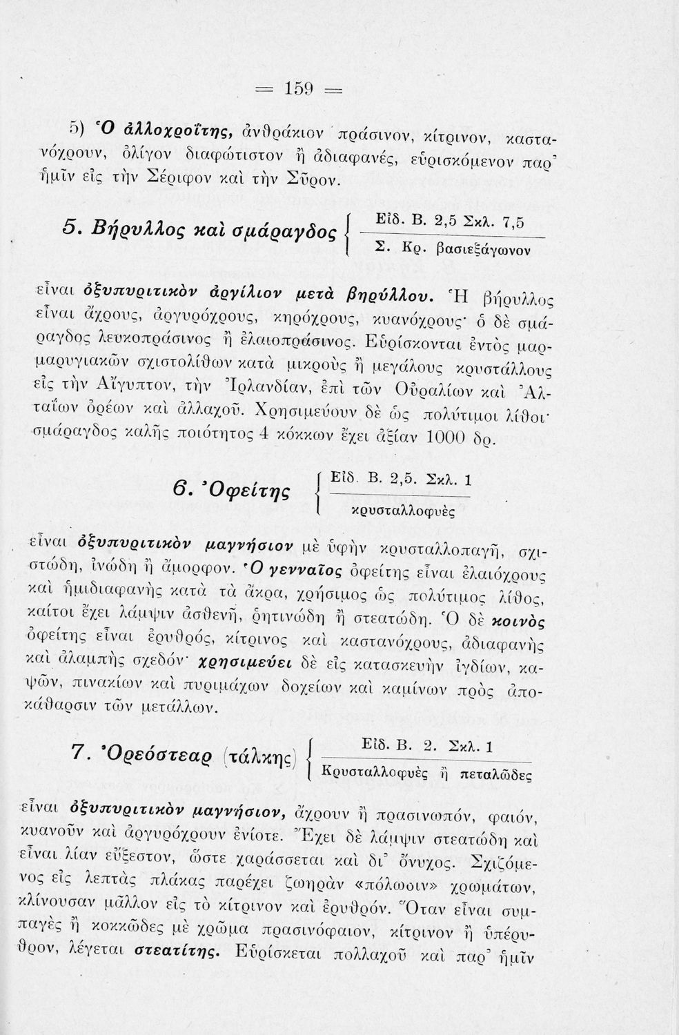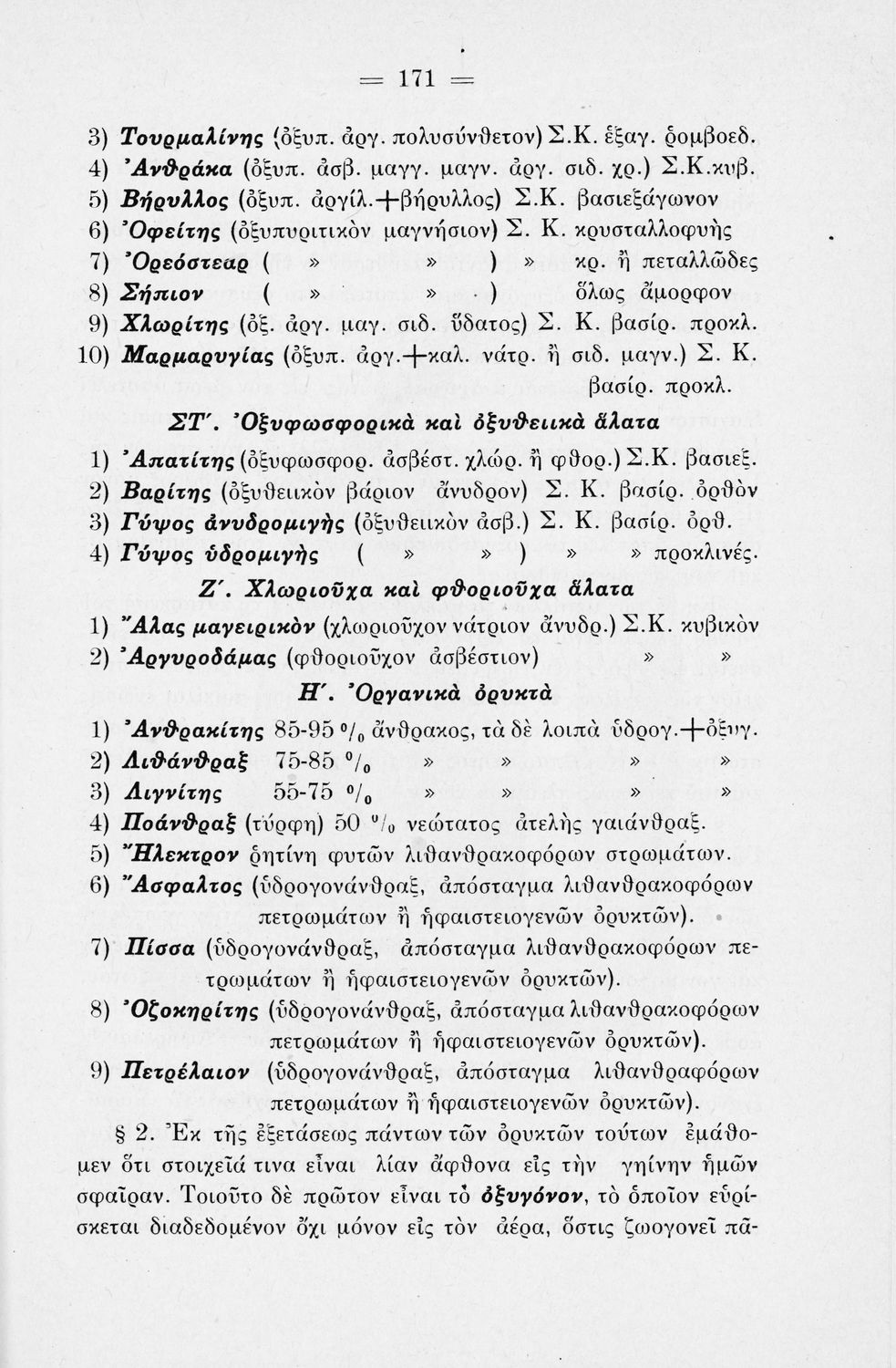 Σχολικό εγχειρίδιο Γεωλογίας/Ορυκτολογίας για τη Β΄ Γυμνασίου που παρουσιάζει τα ορυκτά με βάση την κλάση στην οποία ανήκουν. Περιέχει και πίνακα των γεωλογικών περιόδων.