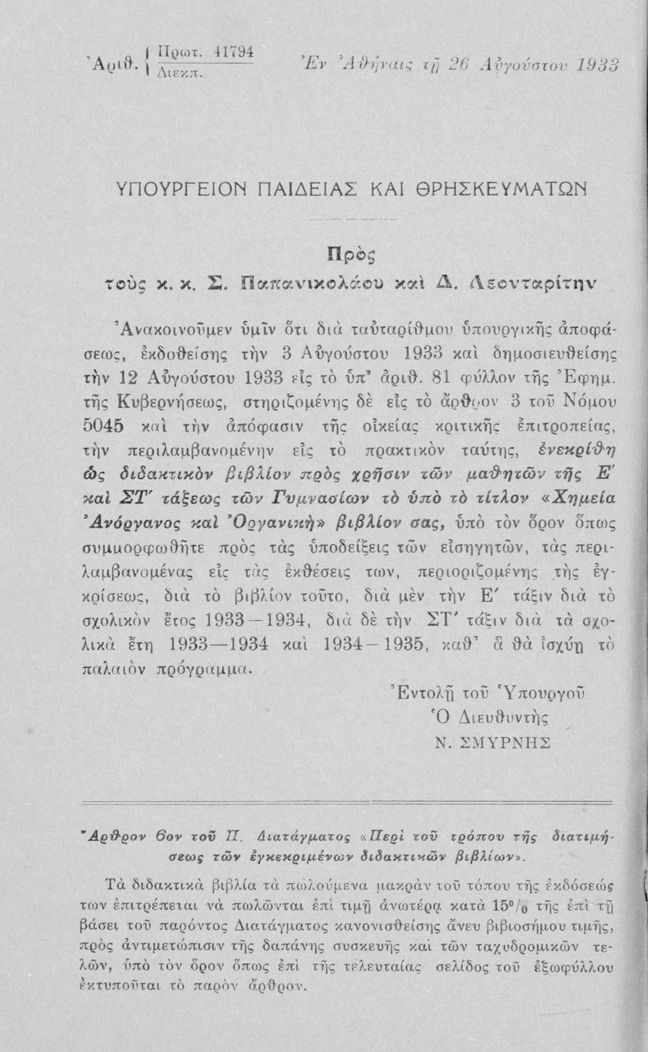 Υπουργική απόφαση / Σύμβαση: 41794/3-8-1933