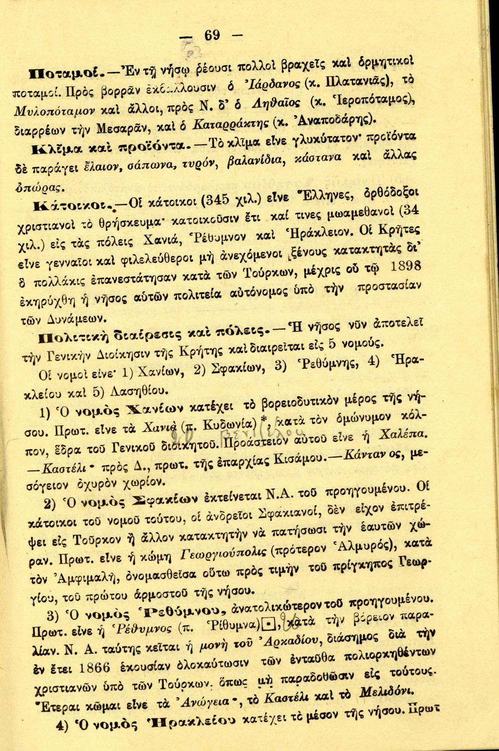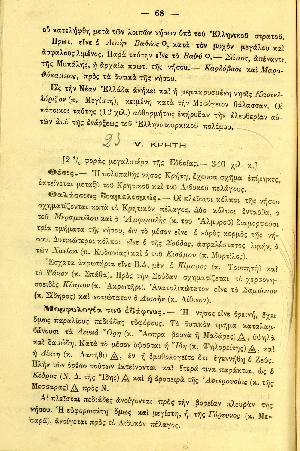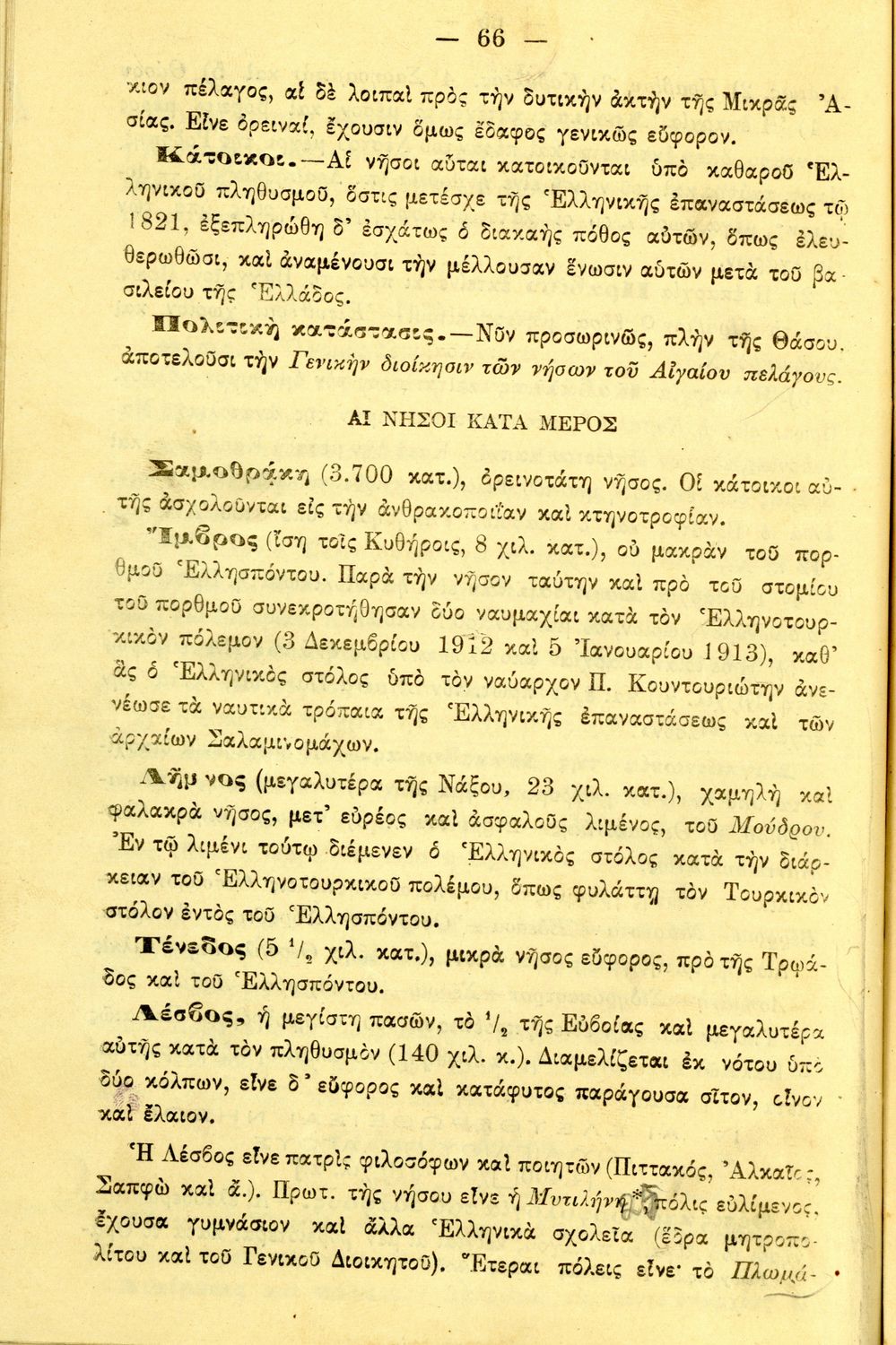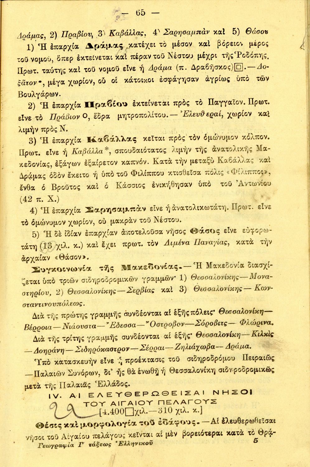 Σχολικό εγχειρίδιο Γεωγραφίας Γ΄ Ελληνικού Σχολείου που αποτελεί μια γενική επισκόπηση της Ελλάδας ανά διαμέρισμα και νομό. Περιέχει και ειδικό κεφάλαιο για τις "λοιπές ελληνικές χώρες" στις οποίες περιλαμβάνονται τα Δωδεκάνησα, η Τουρκική Θράκη, η Ανατολική Ρωμυλία, η Σερβική και Βουλγαρική Μακεδονία, η Μικρά Ασία, η Συρία, η Παλαιστίνη, και η Κύπρος.