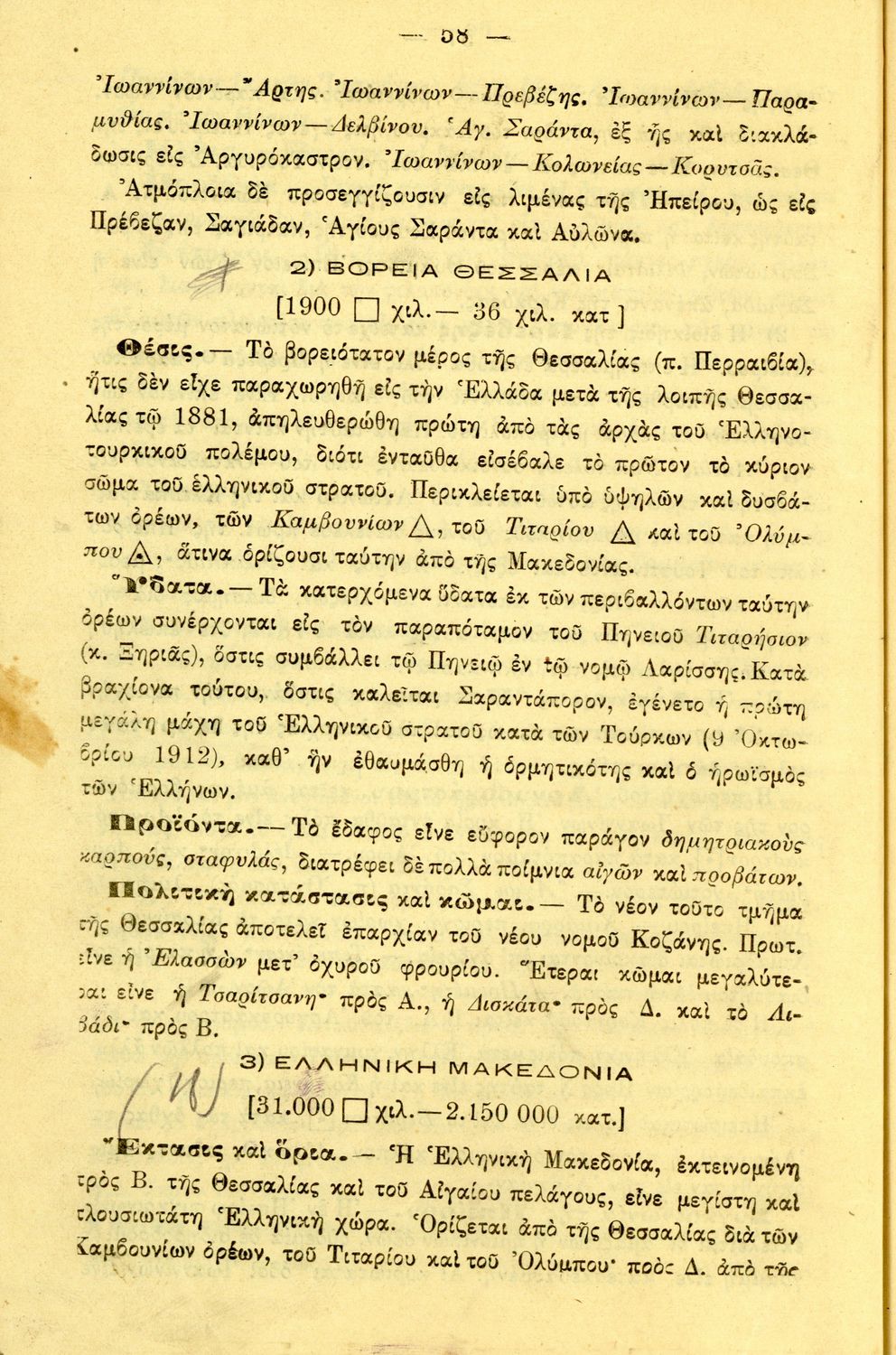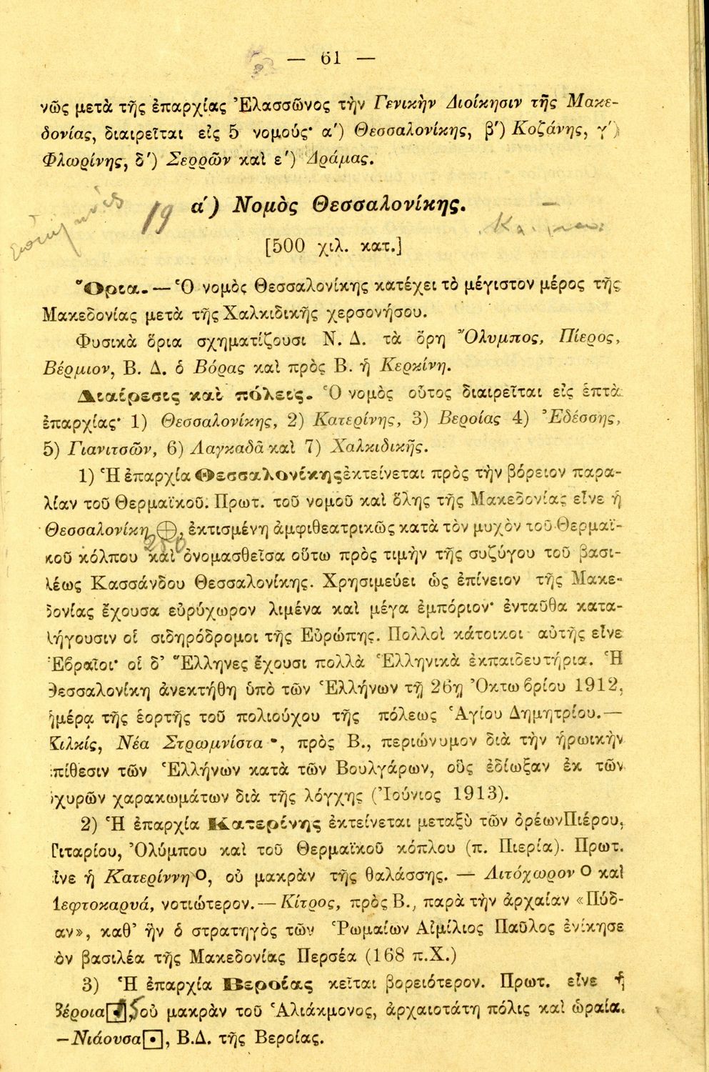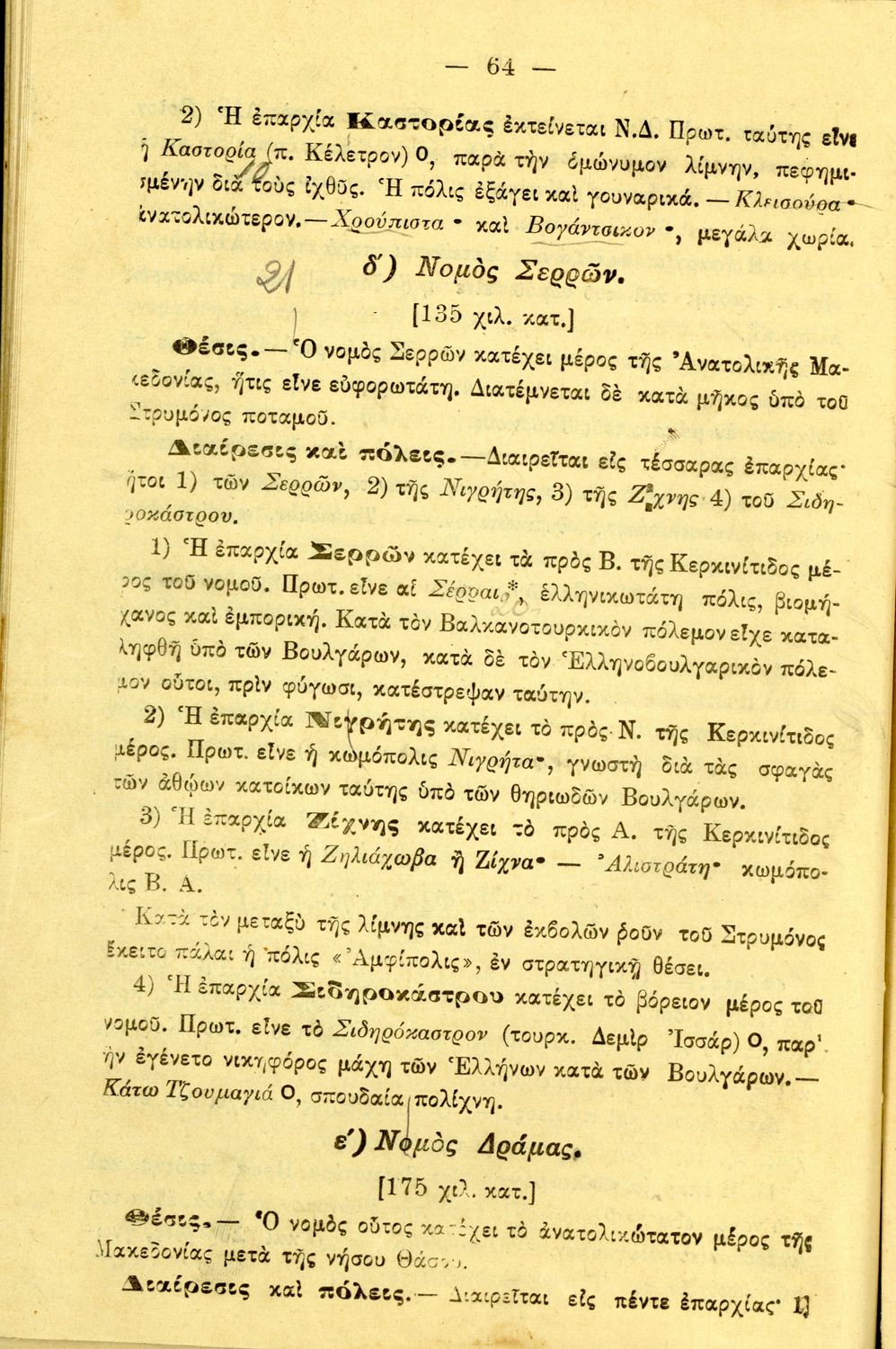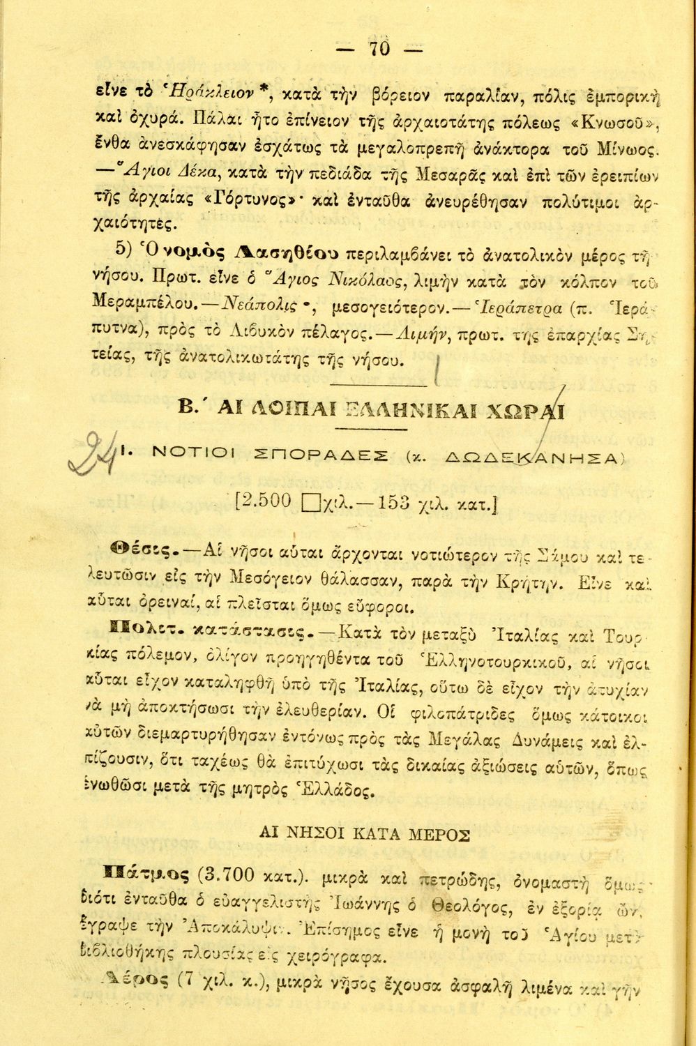 Σχολικό εγχειρίδιο Γεωγραφίας Γ΄ Ελληνικού Σχολείου που αποτελεί μια γενική επισκόπηση της Ελλάδας ανά διαμέρισμα και νομό. Περιέχει και ειδικό κεφάλαιο για τις "λοιπές ελληνικές χώρες" στις οποίες περιλαμβάνονται τα Δωδεκάνησα, η Τουρκική Θράκη, η Ανατολική Ρωμυλία, η Σερβική και Βουλγαρική Μακεδονία, η Μικρά Ασία, η Συρία, η Παλαιστίνη, και η Κύπρος.