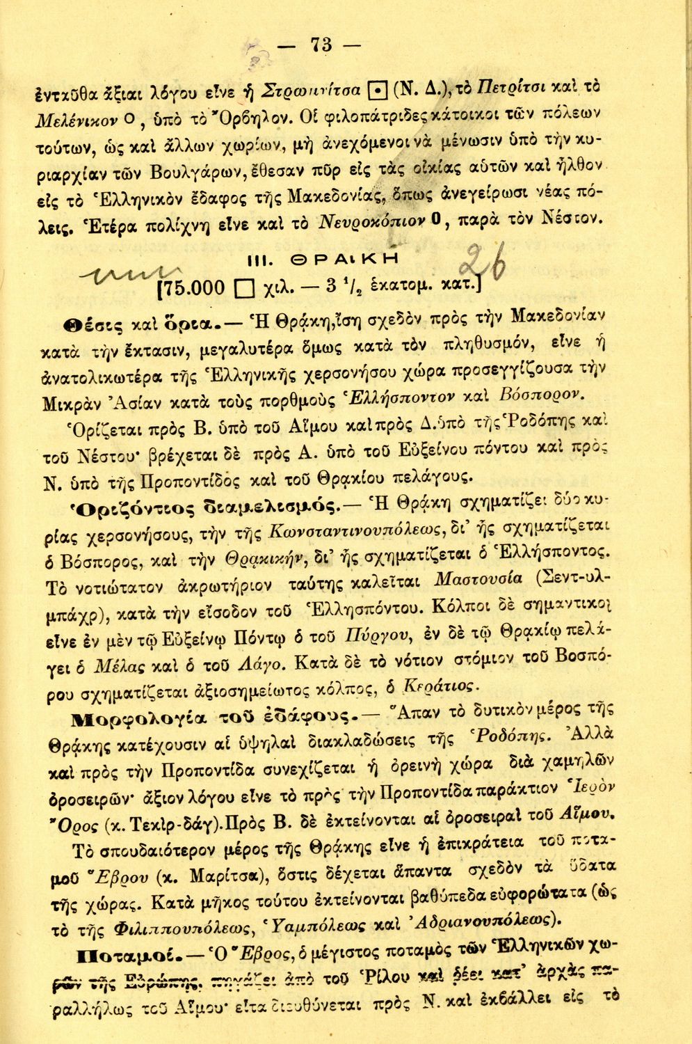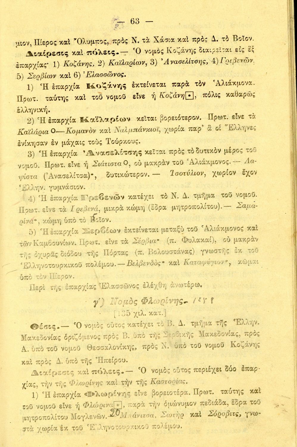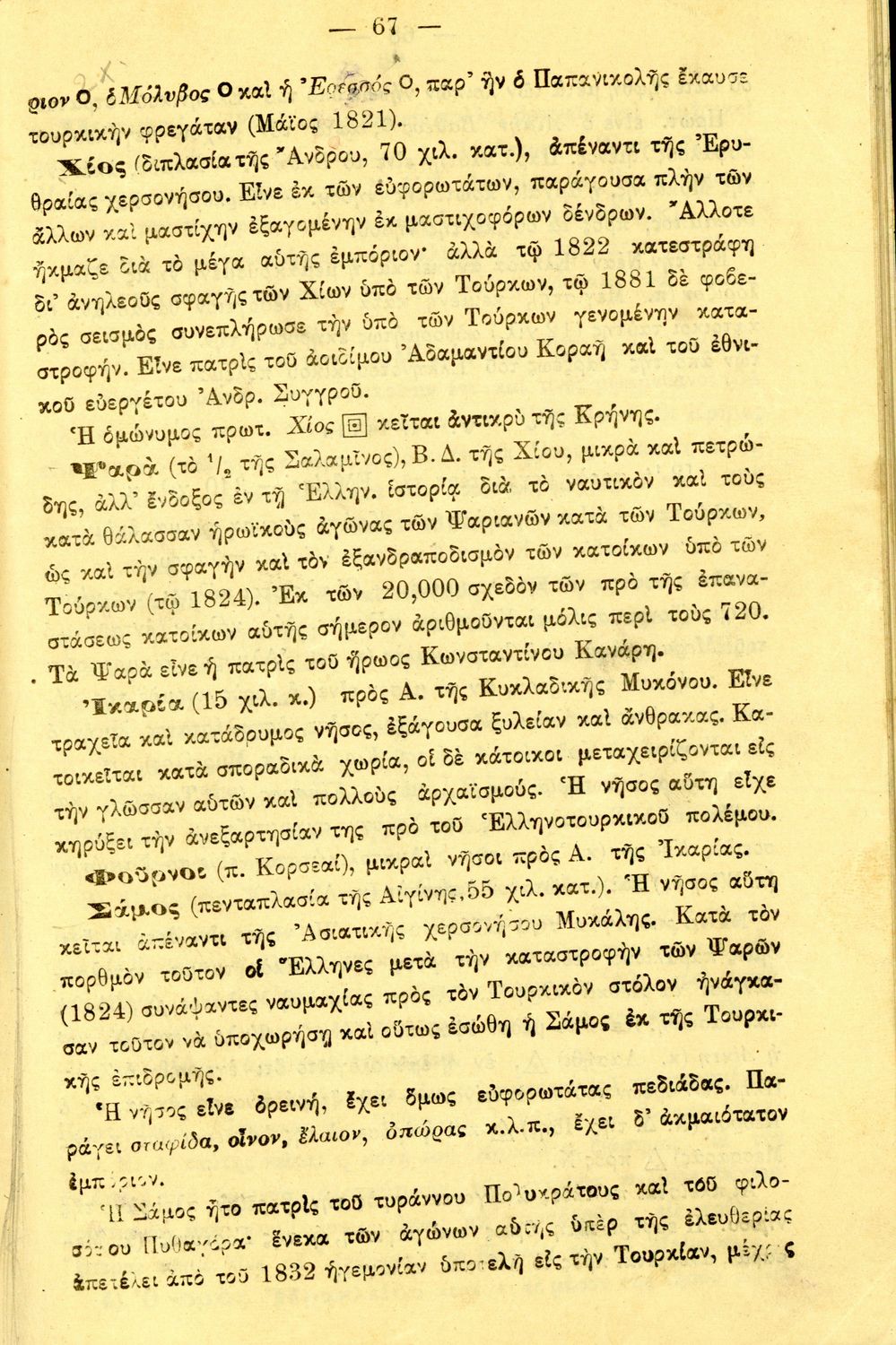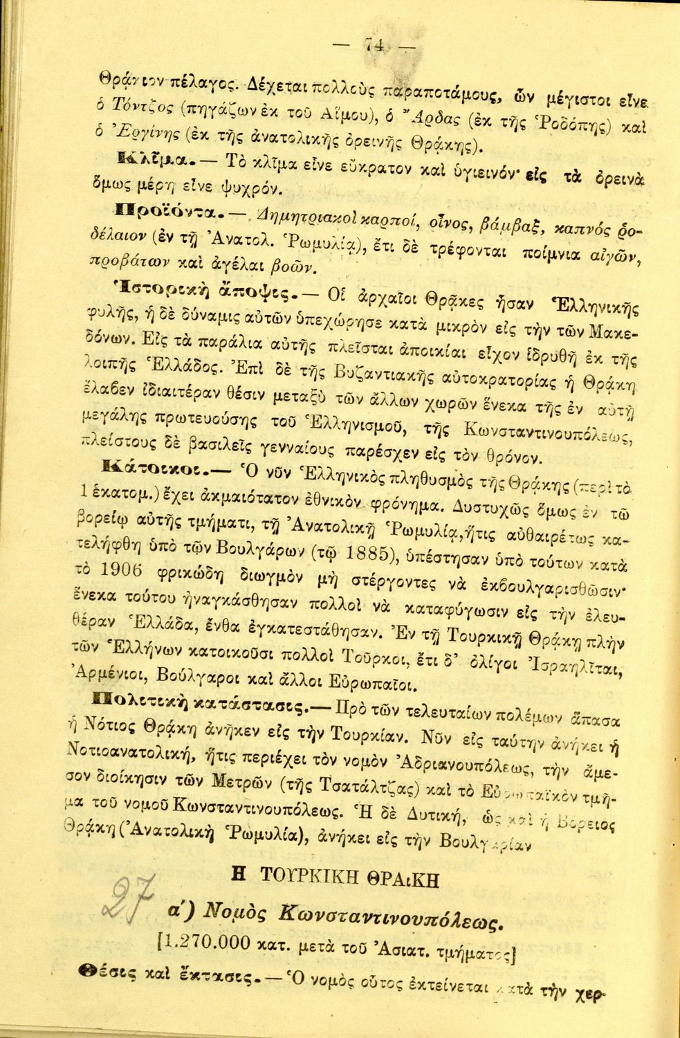 Σχολικό εγχειρίδιο Γεωγραφίας Γ΄ Ελληνικού Σχολείου που αποτελεί μια γενική επισκόπηση της Ελλάδας ανά διαμέρισμα και νομό. Περιέχει και ειδικό κεφάλαιο για τις "λοιπές ελληνικές χώρες" στις οποίες περιλαμβάνονται τα Δωδεκάνησα, η Τουρκική Θράκη, η Ανατολική Ρωμυλία, η Σερβική και Βουλγαρική Μακεδονία, η Μικρά Ασία, η Συρία, η Παλαιστίνη, και η Κύπρος.